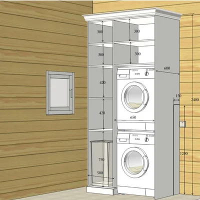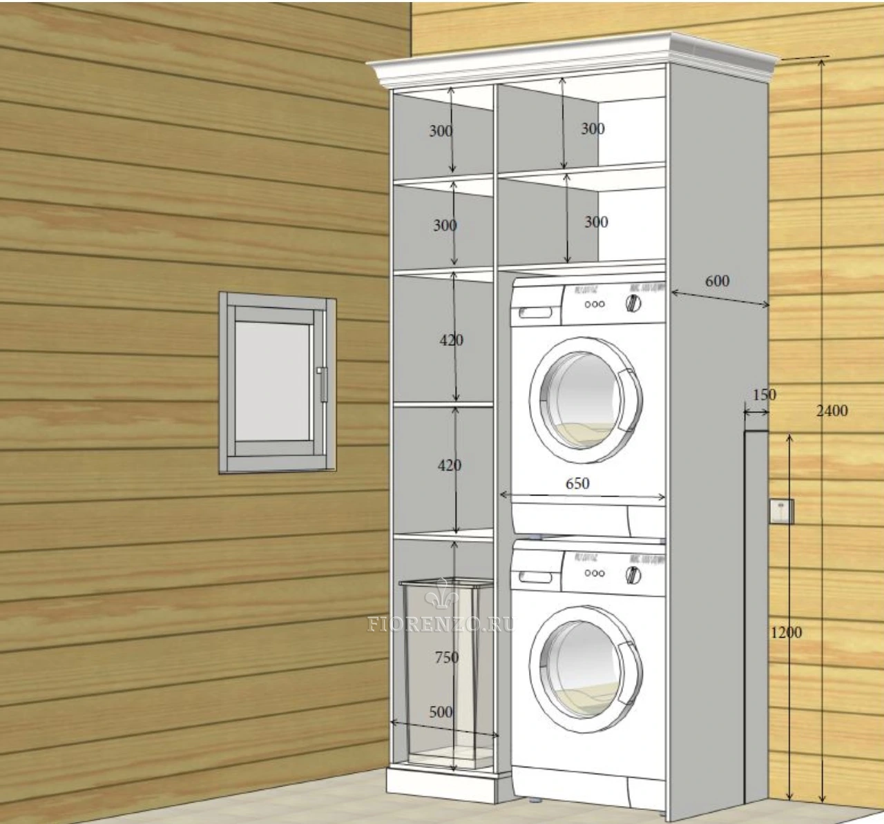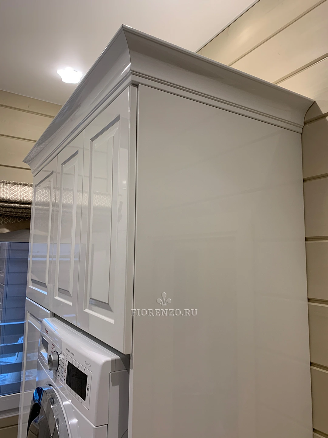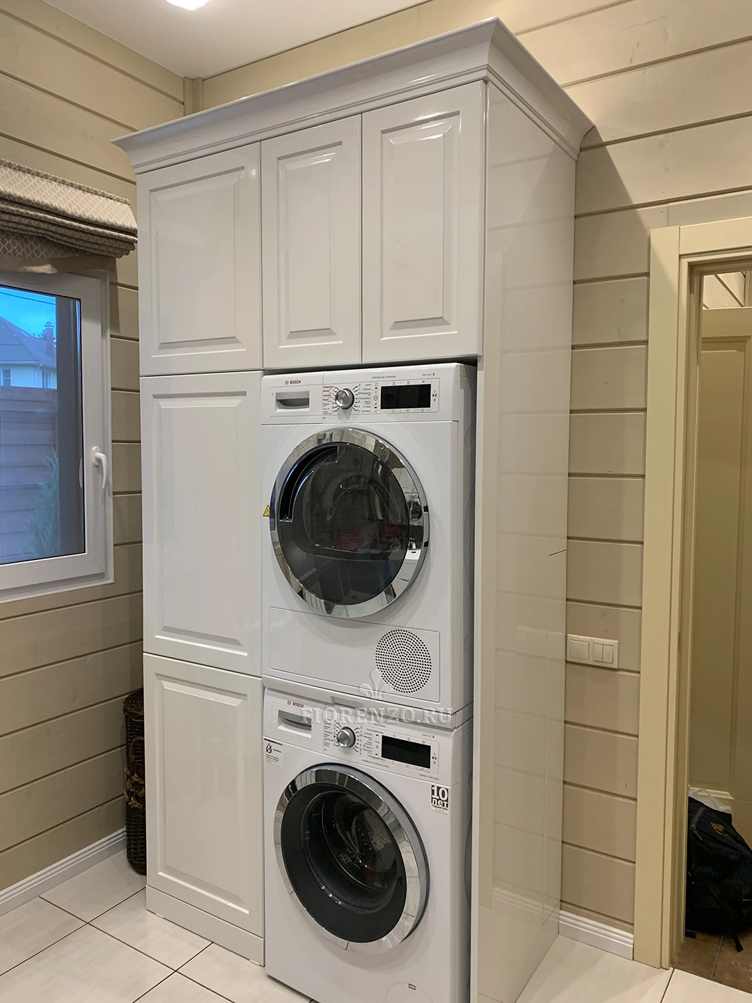 FIORENZO проектирует мебель для разных помещений, в отдельную категорию выделяются шкафы для постирочных. Они красивые, эргономичные, устойчивые к влаге, помогут организовать пространство. Наполнение шкафов продумано для размещения средств бытовой химии, текстиля, хозяйственных мелочей. Есть полки, ящики, металлические корзины. Отсек справа открыт, он предусмотрен для установки пары стиральных машин одна на другую.
