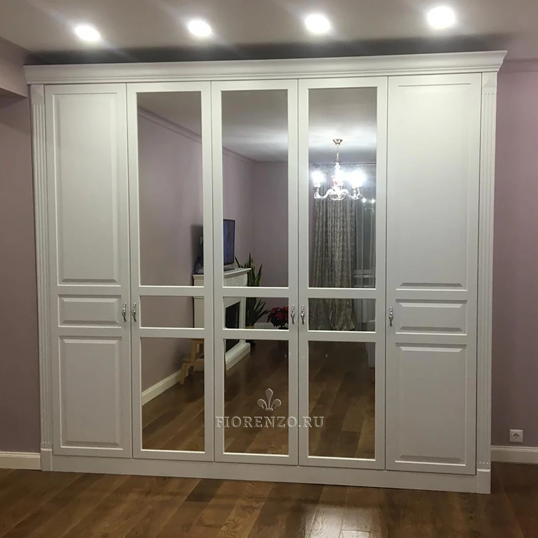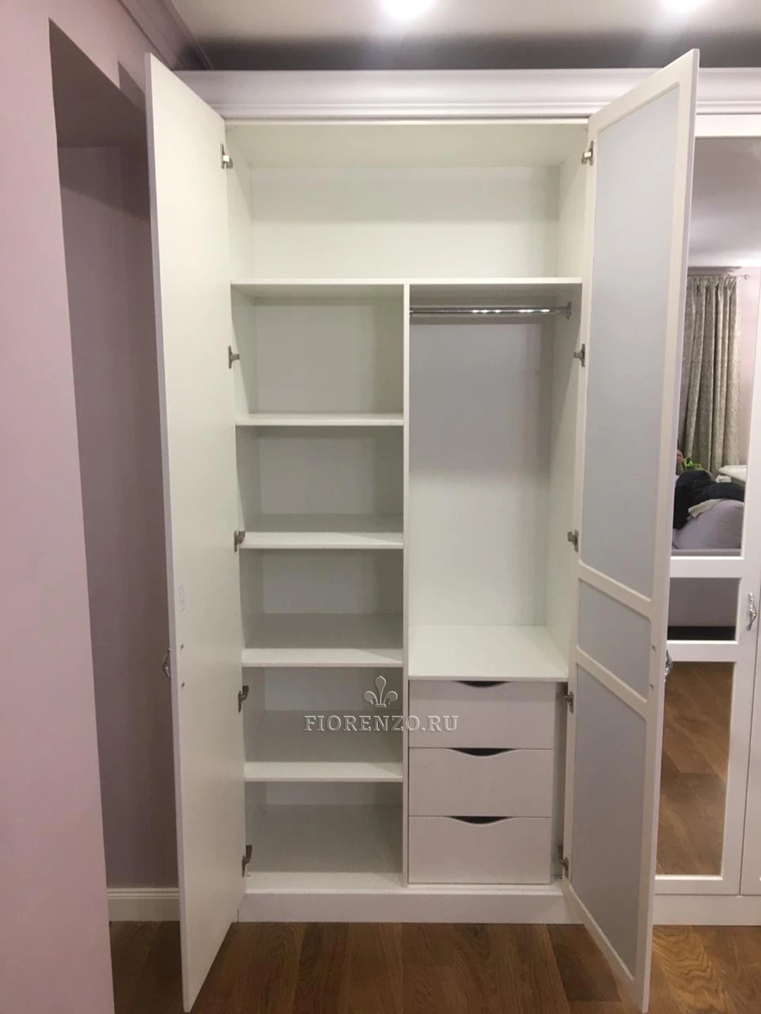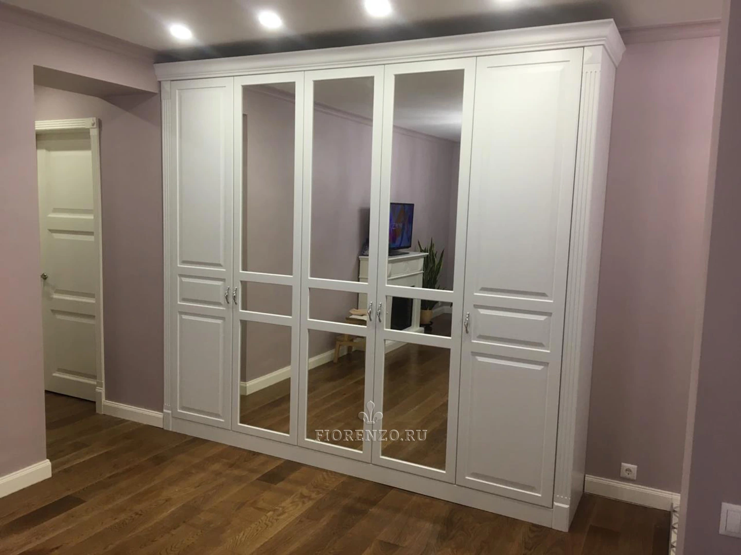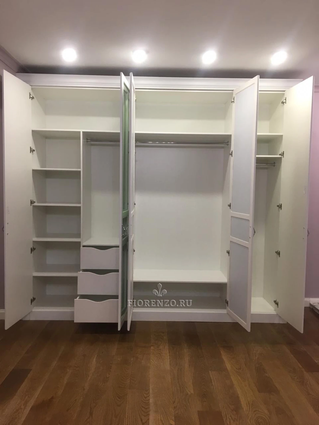 Шкаф в классическом стиле белого цвета был изготовлен для нашей заказчицы Ольги в г.Подольск. Шкаф «Касали» был установлен в гостиной, сразу при входя из коридора прихожей. Поскольку комната просторная, можно было установить обычный шкаф с распашными фасадами.