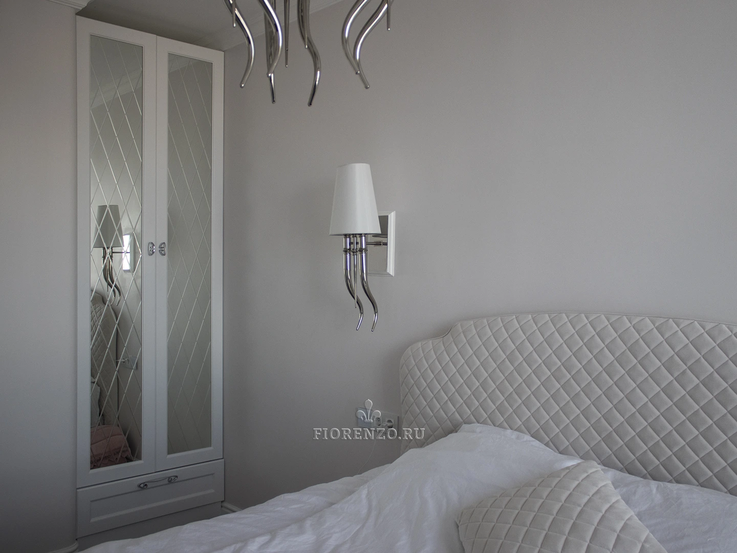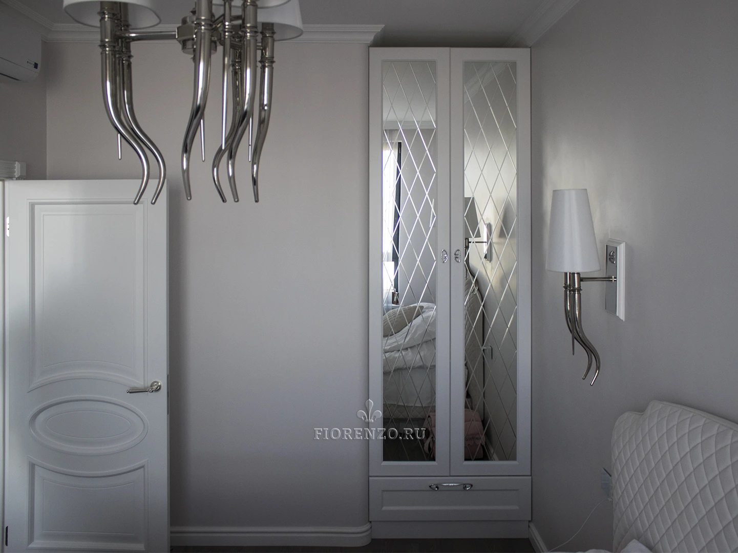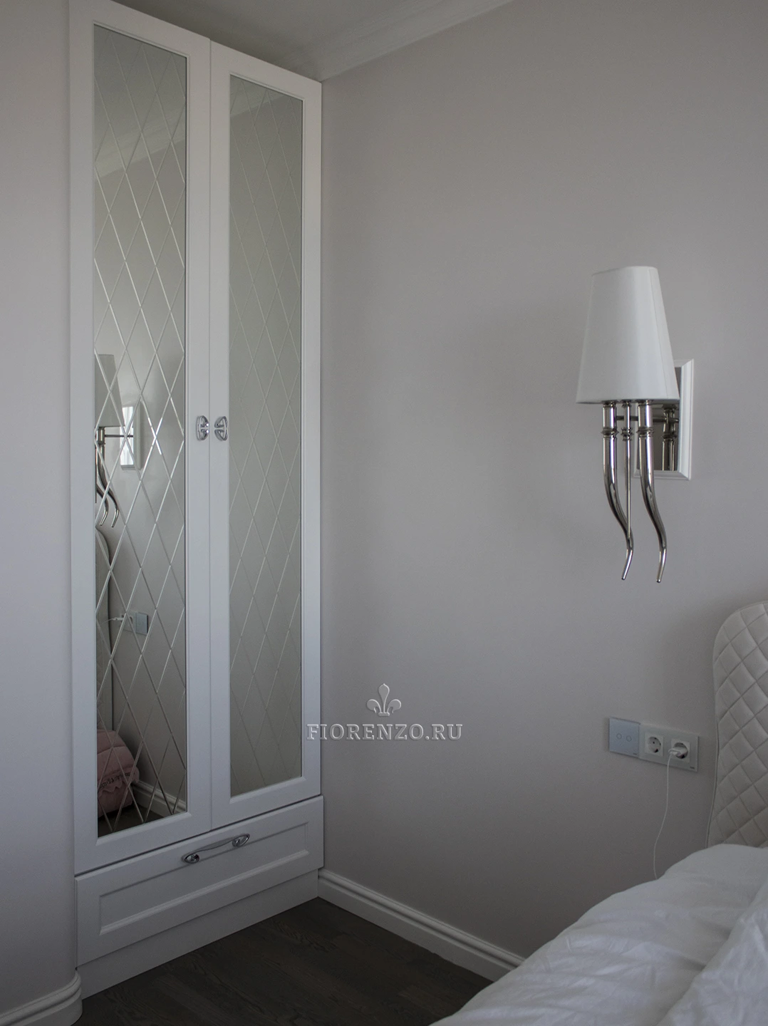 Компания «Фиорензо Мебель» разработала проект белого встроенного шкафа для спальни «Осло» с фацетами, размещенного в специально созданной нише. Мебель выполнена в стиле неоклассика, для которого характерны прямые линии, оригинальный современный декор, стильная фурнитура из металла. Распашной шкаф в спальню подобного формата может быть разработан под заказ по индивидуальным размерам и эскизам. Такой подход позволит вам получить изделие с заданными параметрами, которое идеально подходит для установки в конкретном помещении. Преимуществом для заказчика является то, что он может увидеть будущую мебель на 3D-эскизе, внести в него личные корректировки, подобрать материалы и внутреннее наполнение.