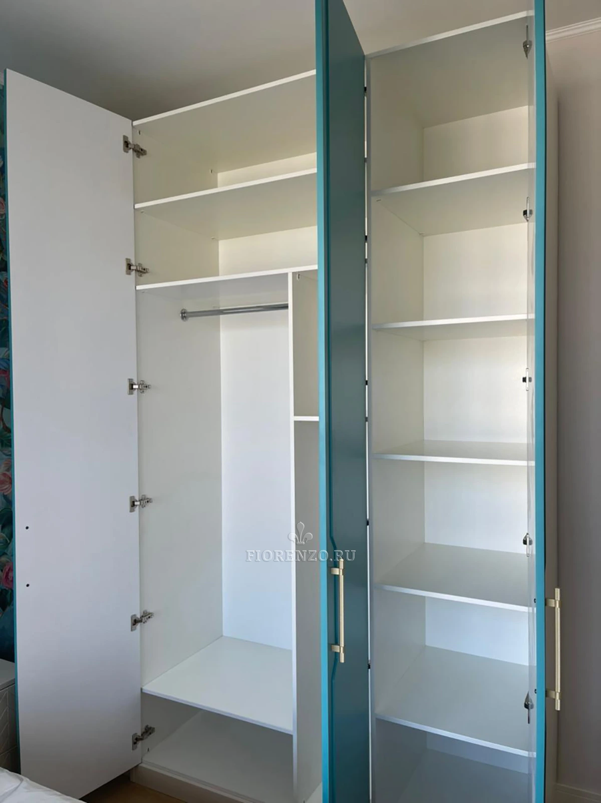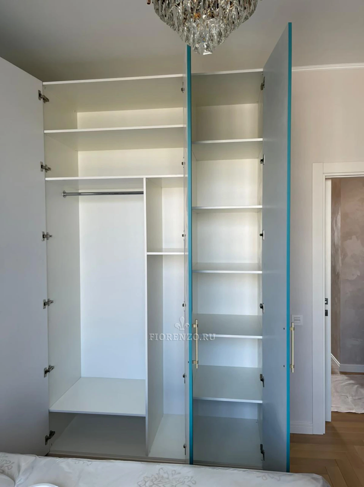 Отличное решения для спальни с прикроватными тумбами – распашной шкаф «Pelado» с открытыми полками и фасадами из крашеного МДФ. Наполнение изделия стандартное: полки и штанги. Стоимость демократичная. Под ручки предусмотрена интересная фрезеровка, огибающая их по периметру. К сожалению, ракурс получился не очень удачный, и эту фрезеровку недостаточно видно.