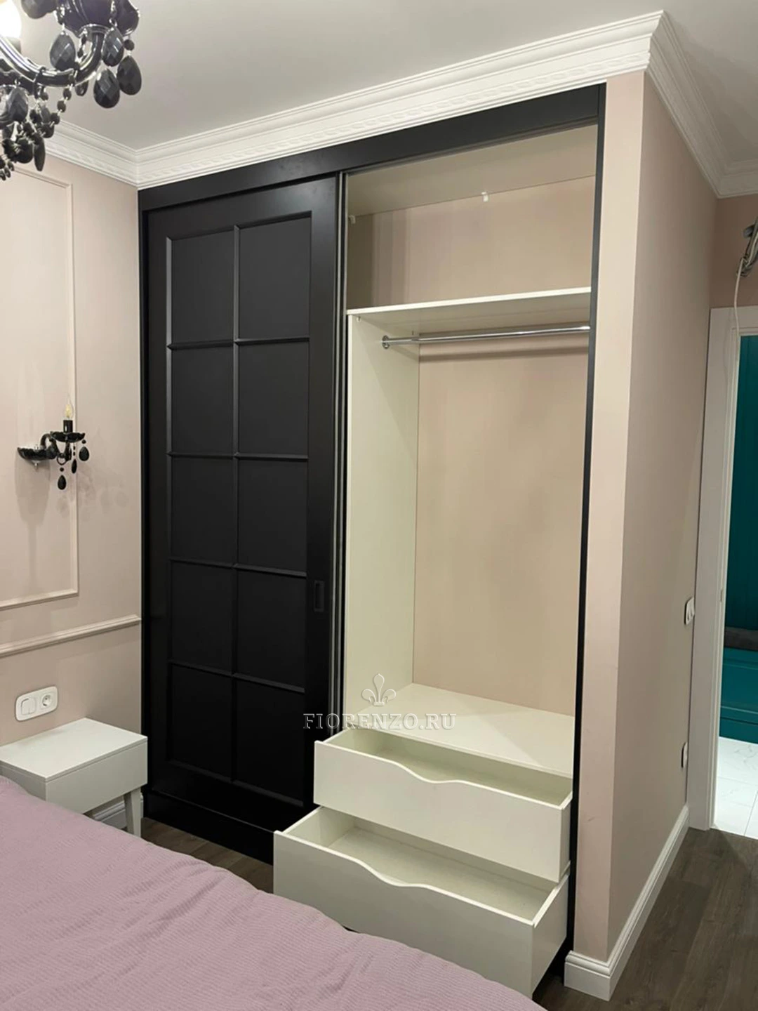 Мастерская «Фиорензо» производит мебель по уникальным проектам, с применением качественных материалов. Импортные панели МДФ, ЛСДП, австрийская фурнитура – основа для надежных, долговечных конструкций. Черный встроенный шкаф-купе в спальню «ИльНеро» займет свободную нишу, вместительный, подойдет для размещения разного количества вещей. Створки раздвижные, не утяжеляют пространство, не требуют места для открывания.