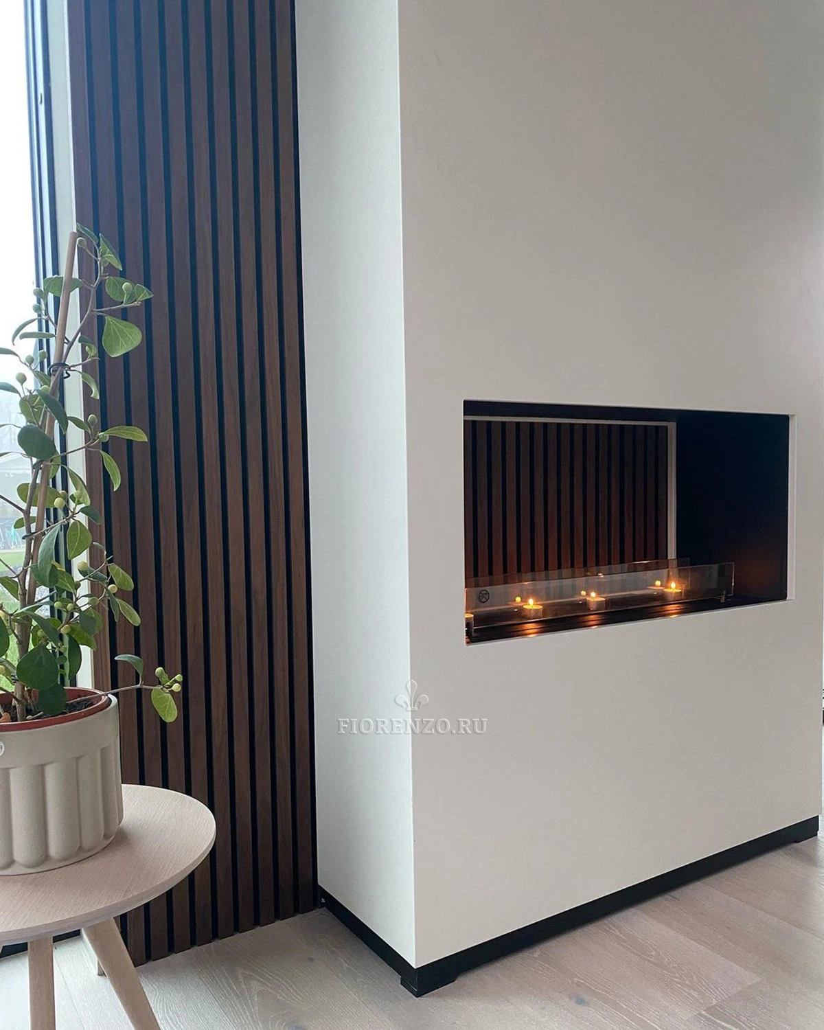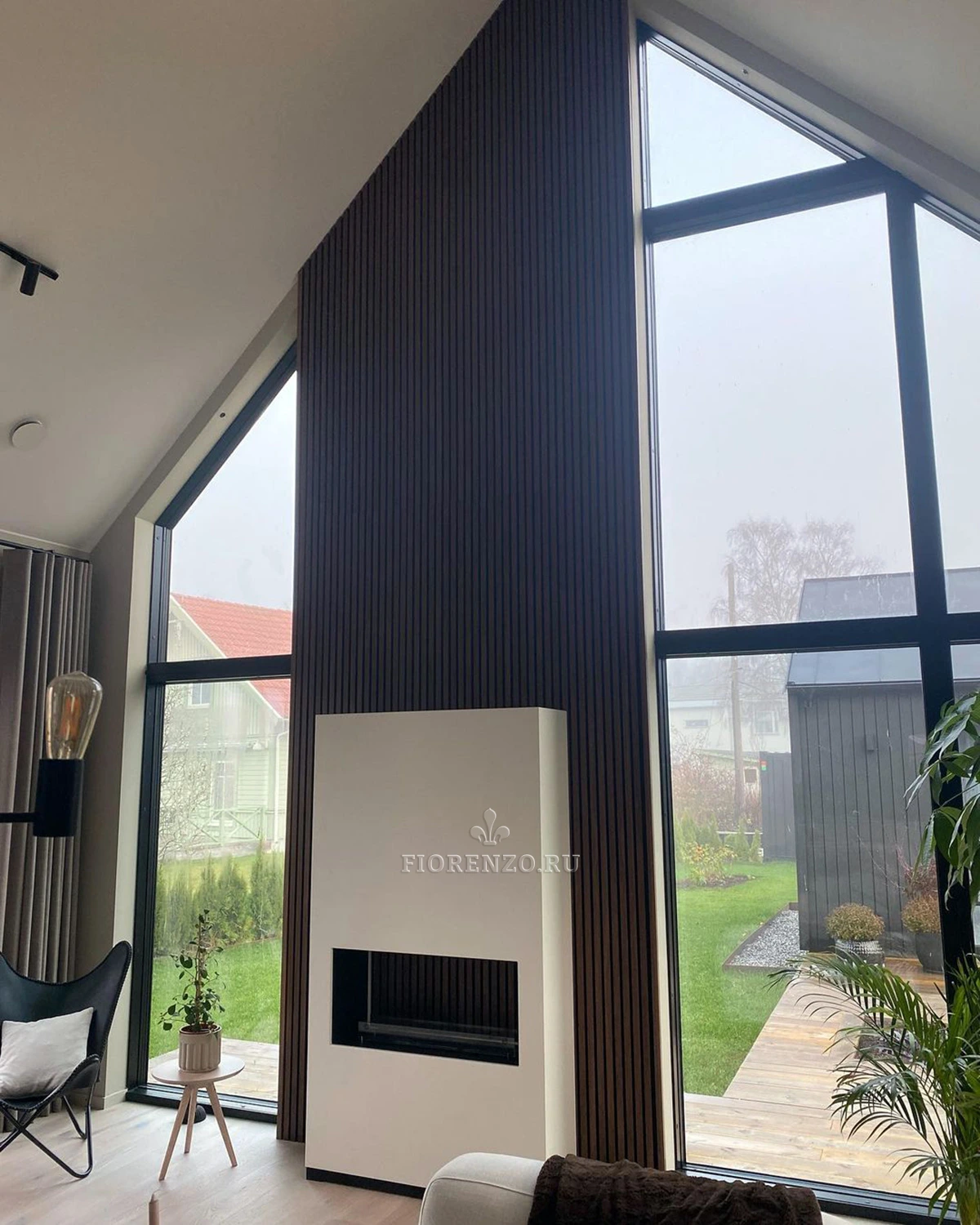 Декоративная реечная панель из реек дуба «Мюкке» подойдет для классических и современных дизайнов, может иметь разные формы и высоту. Особенности проекта: