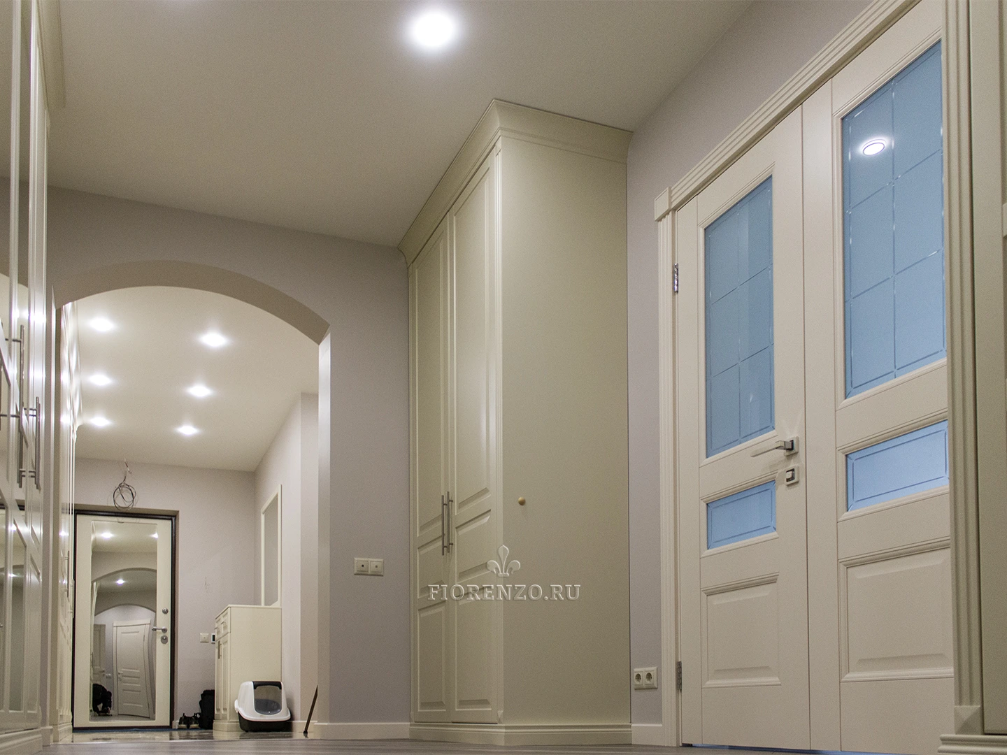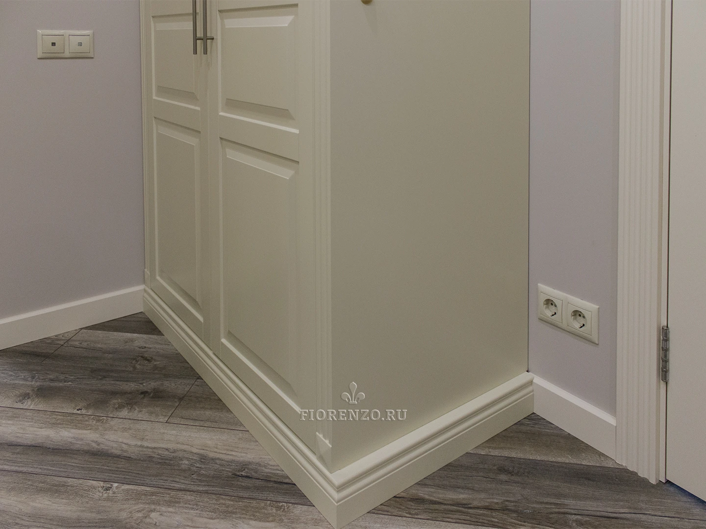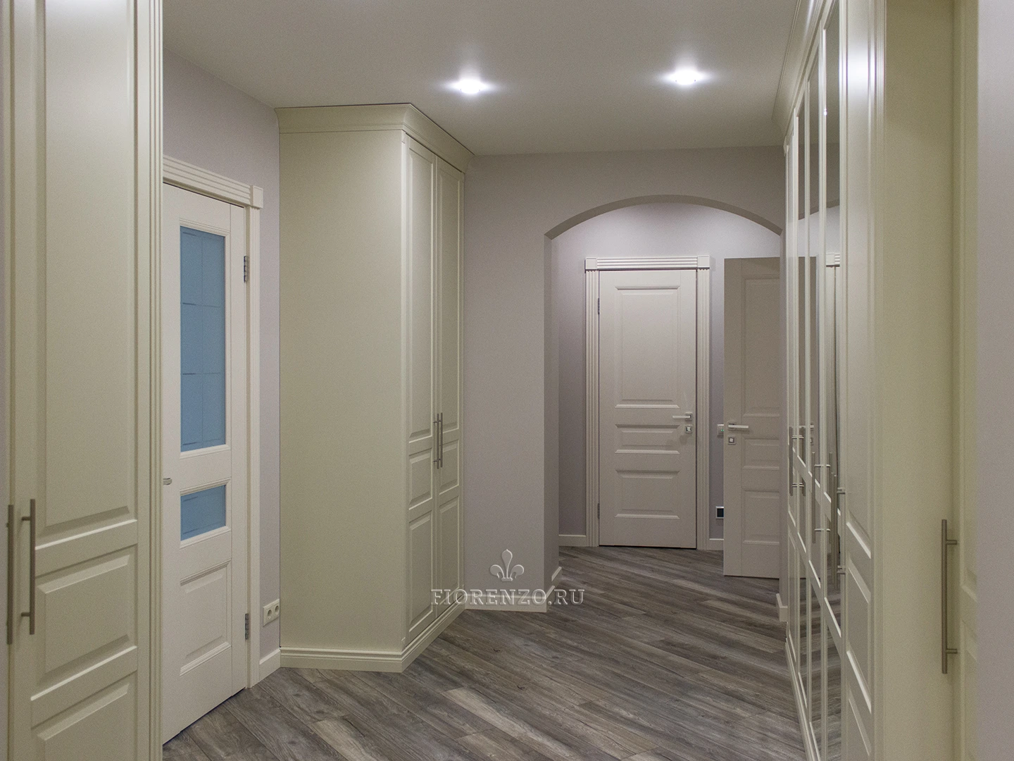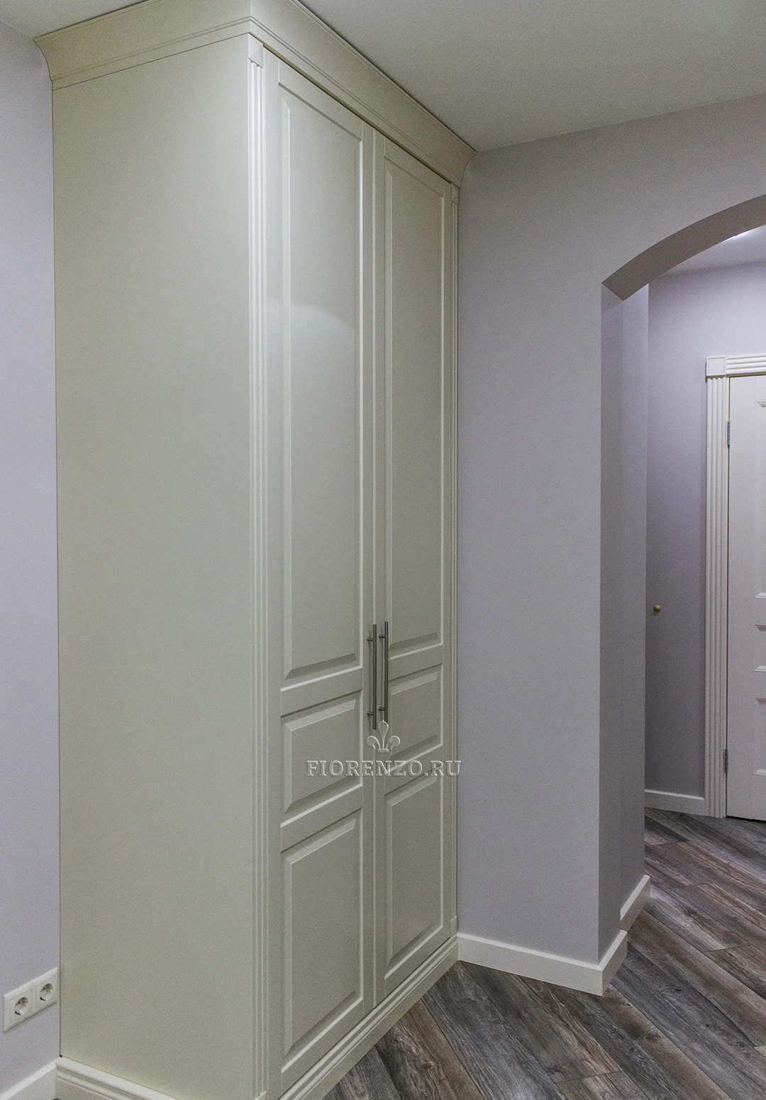 Мастера Fiorenzo разработали и реализовали два классических шкафа в коридор под заказ из МДФ. Мебель имеет простой незамысловатый дизайн, который характеризуется наличием прямых линий и светлых оттенков, филенчатых фасадов, декоративного карниза и цоколя. Установлены массивные ручки-рейлинги из металла в оттенке «сатин». Изделия «Бран» вместительные, занимают пространство от пола до потолка, наполнение создано с учетом потребностей клиента.