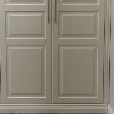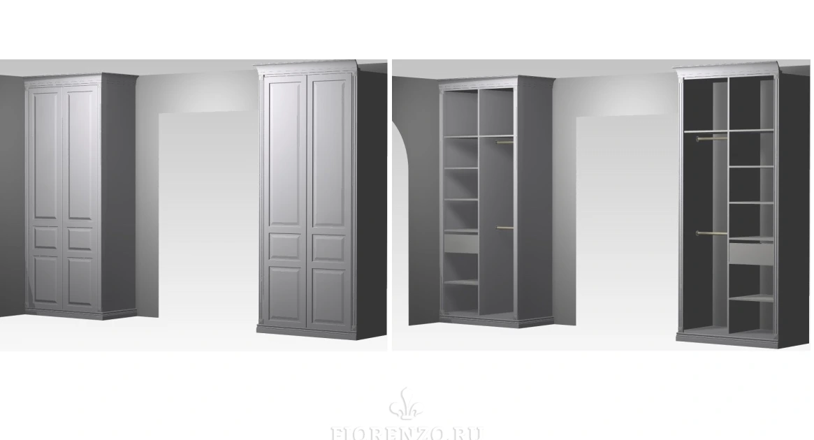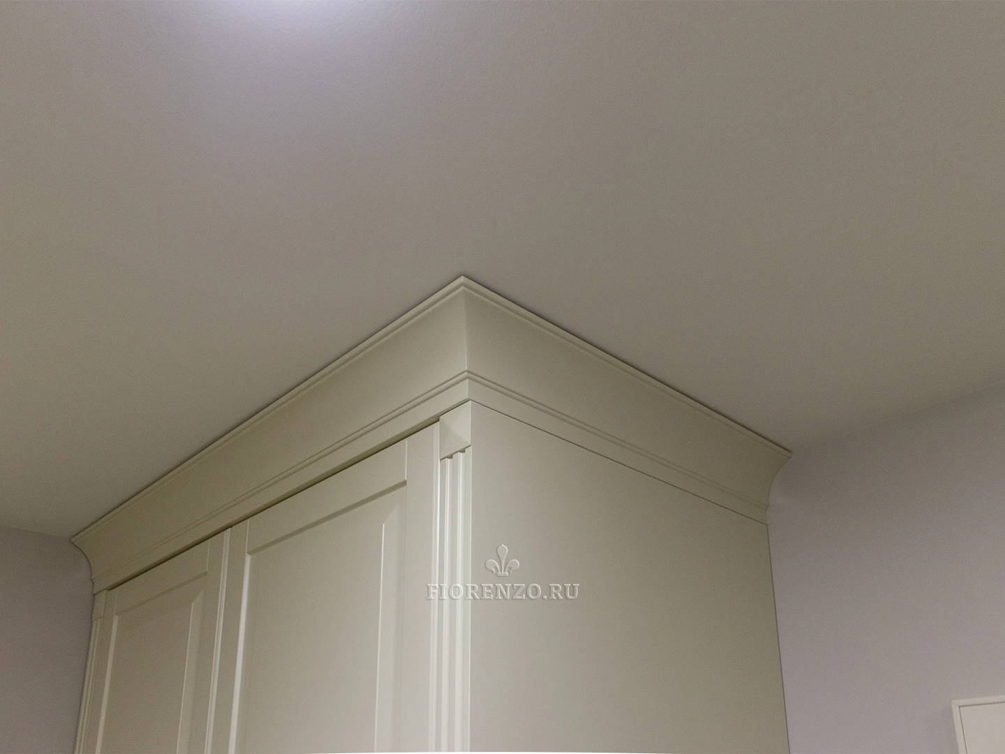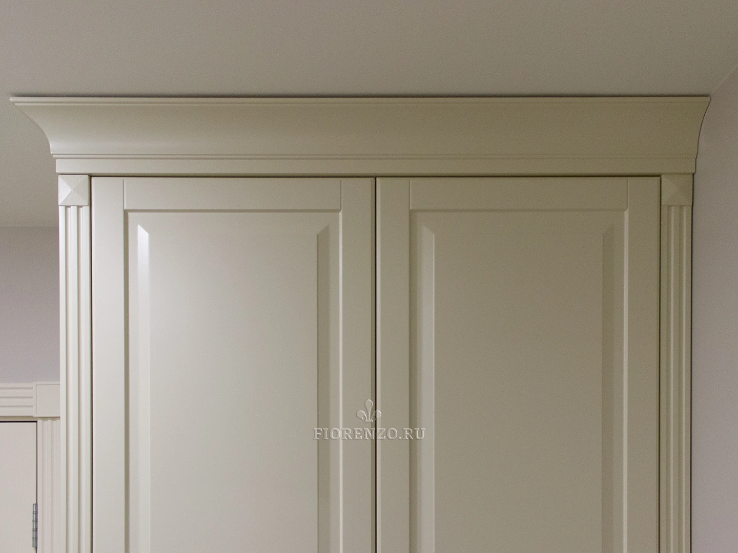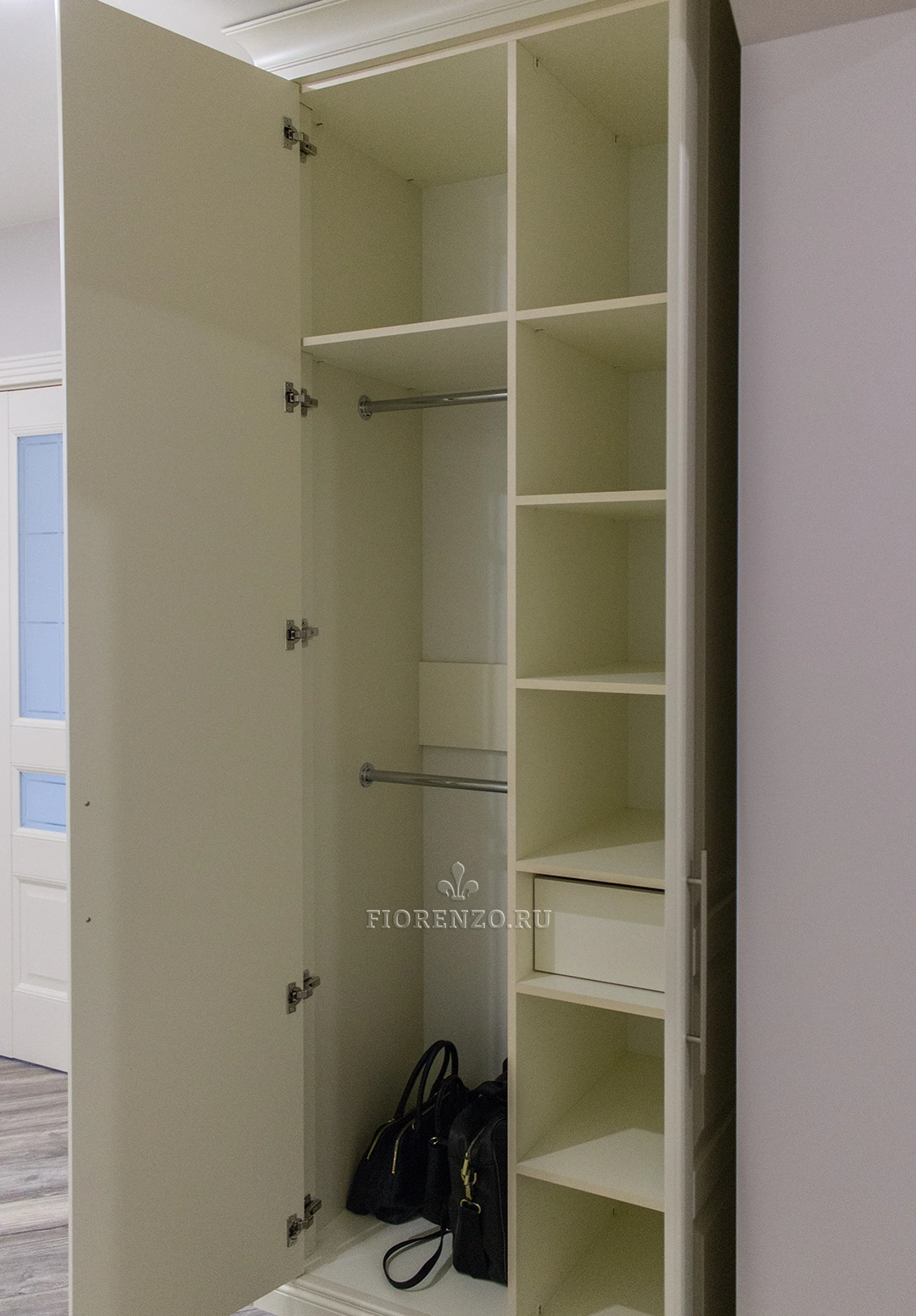 Мастера Fiorenzo разработали и реализовали два классических шкафа в коридор под заказ из МДФ. Мебель имеет простой незамысловатый дизайн, который характеризуется наличием прямых линий и светлых оттенков, филенчатых фасадов, декоративного карниза и цоколя. Установлены массивные ручки-рейлинги из металла в оттенке «сатин». Изделия «Бран» вместительные, занимают пространство от пола до потолка, наполнение создано с учетом потребностей клиента.