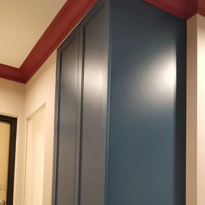 Два шкафа в коридоре из МДФ эмали «Корк» формируют целостный гарнитур, расставляют акценты, выполняют декоративную роль. Особенности проекта: