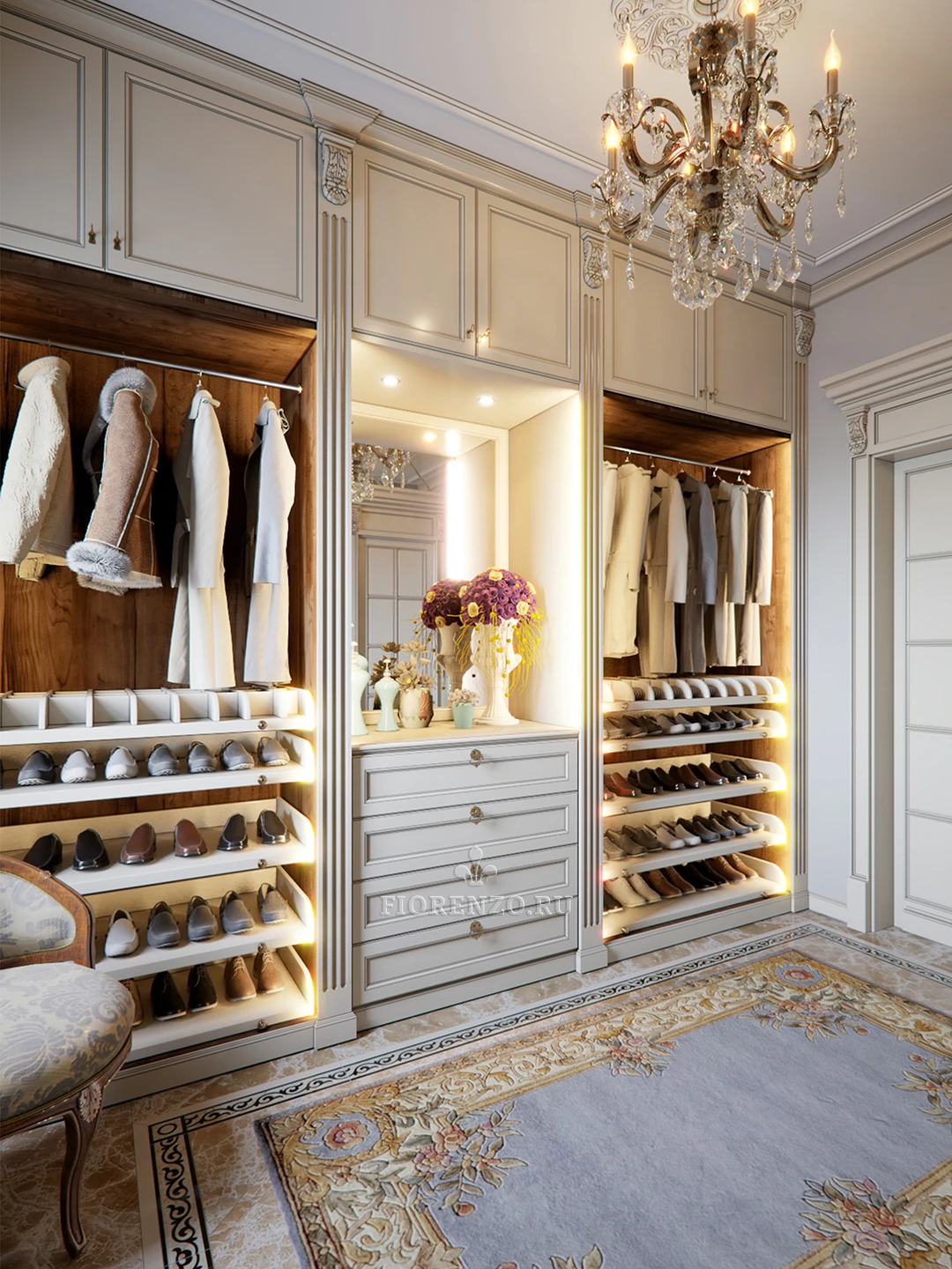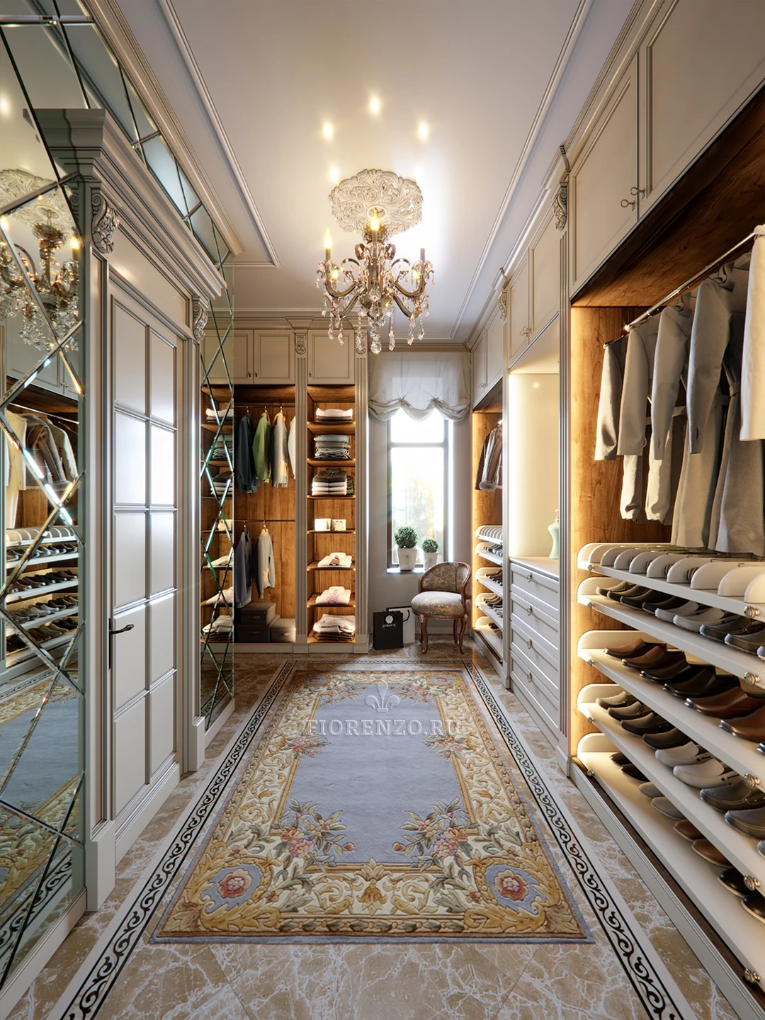 Для изготовления корпусов элитной гардеробной комнаты применялся МДФ, шпонированный натуральным дубом. Фасадная часть и все резные элементы конструкции сделаны из патированного МДФ, окрашенного эмалью Sayerlack. Функционирование распашных дверок и выдвижных ящиков осуществляет австрийская фурнитура Blum c доводчиками.