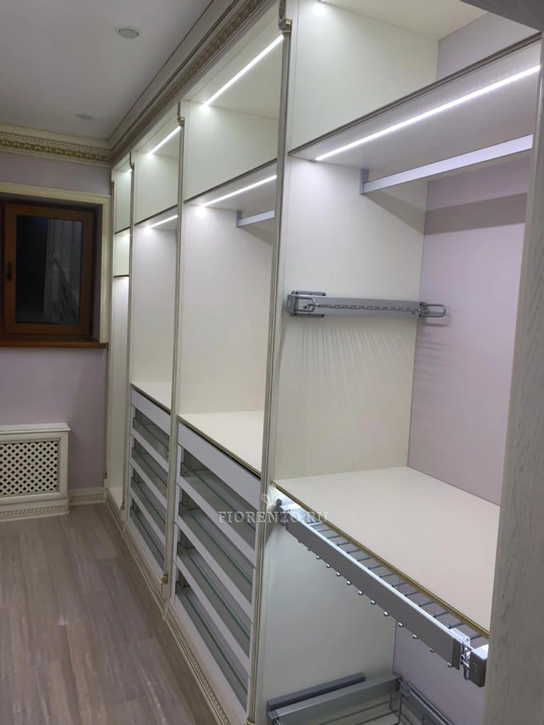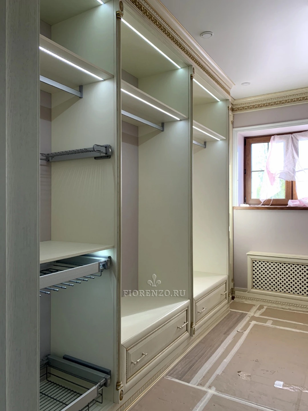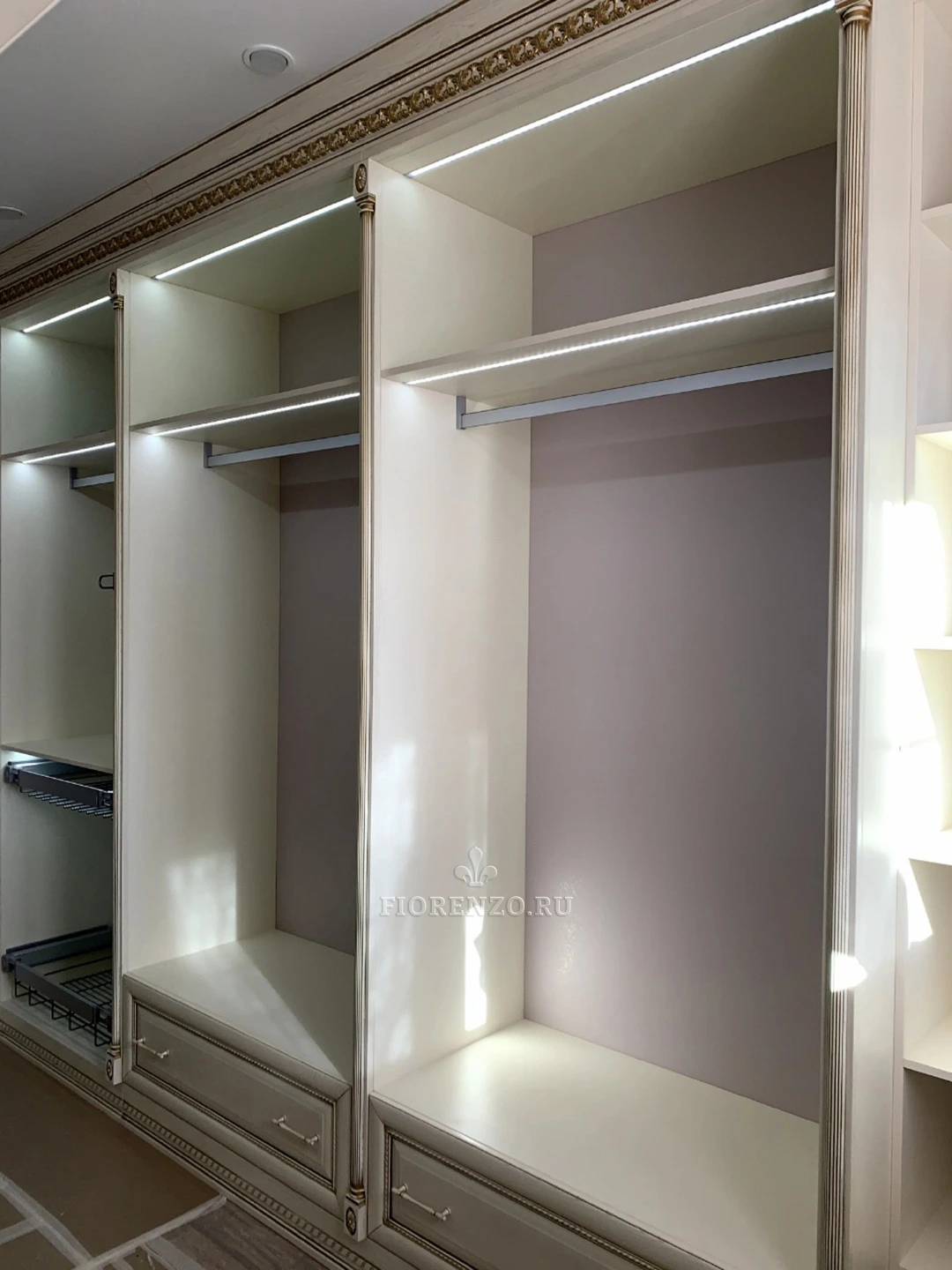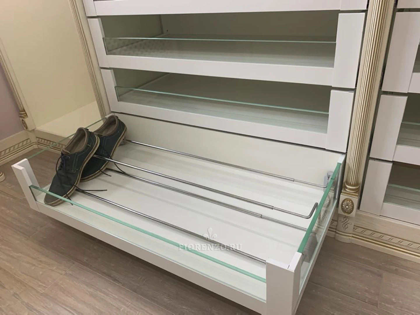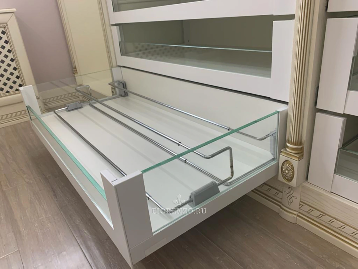 Классическая гардеробная комната «Элегия» производства «Фиорензо» имеет открытую конструкцию и продуманное до мелочей наполнение. Внутренние элементы, составляющие системы хранения вещей, – штанги, полки, ящики, корзины, пр. В проекте предусмотрена подсветка для полок, дополнительно в комнате нужно общее освещение. Особую прелесть выдвижным ящикам придают стеклянные прозрачные ограничители.