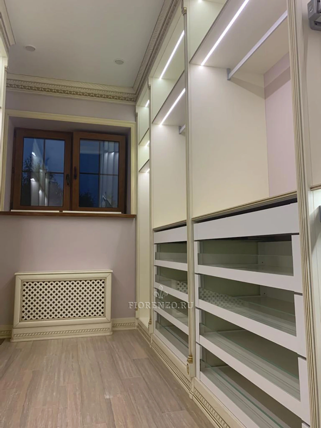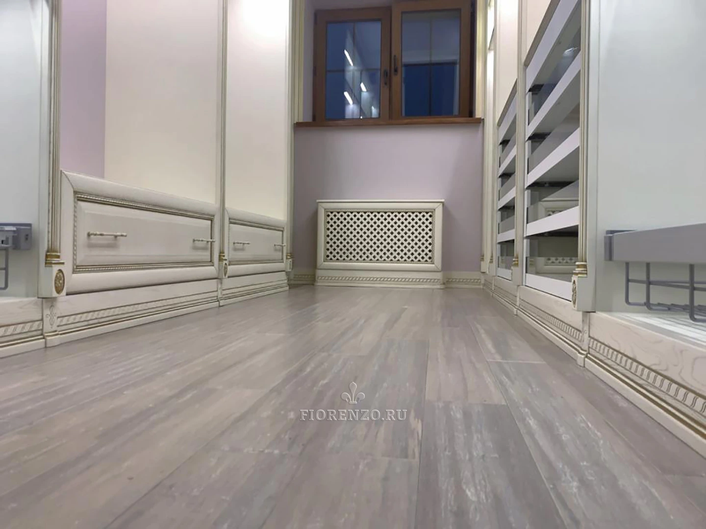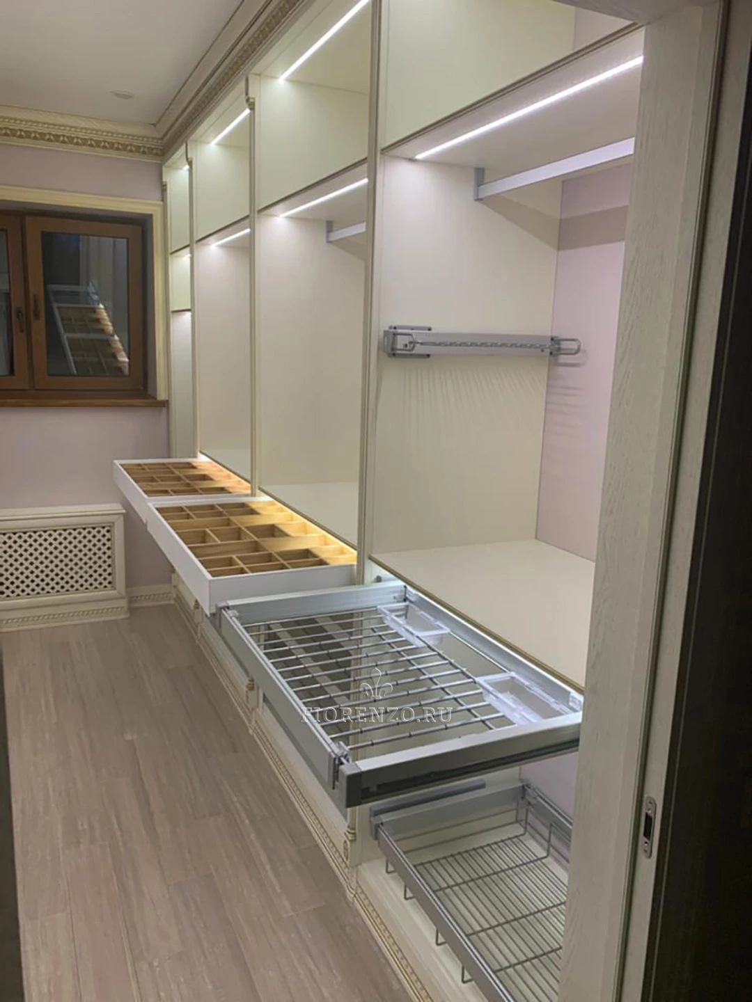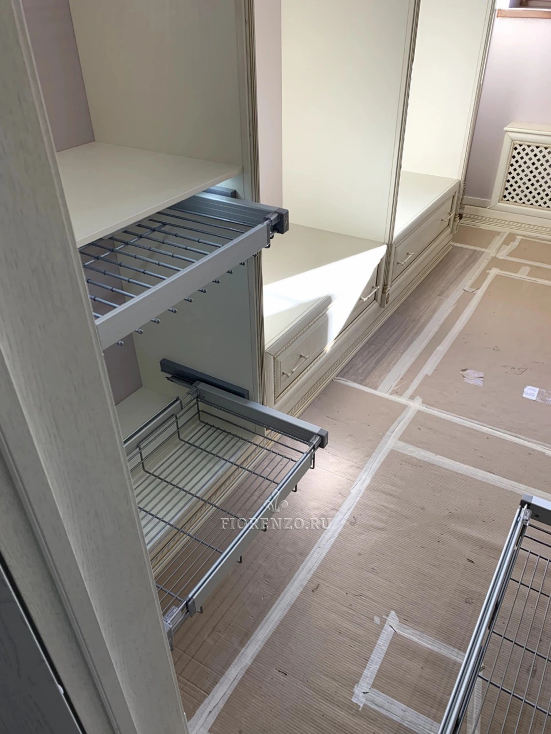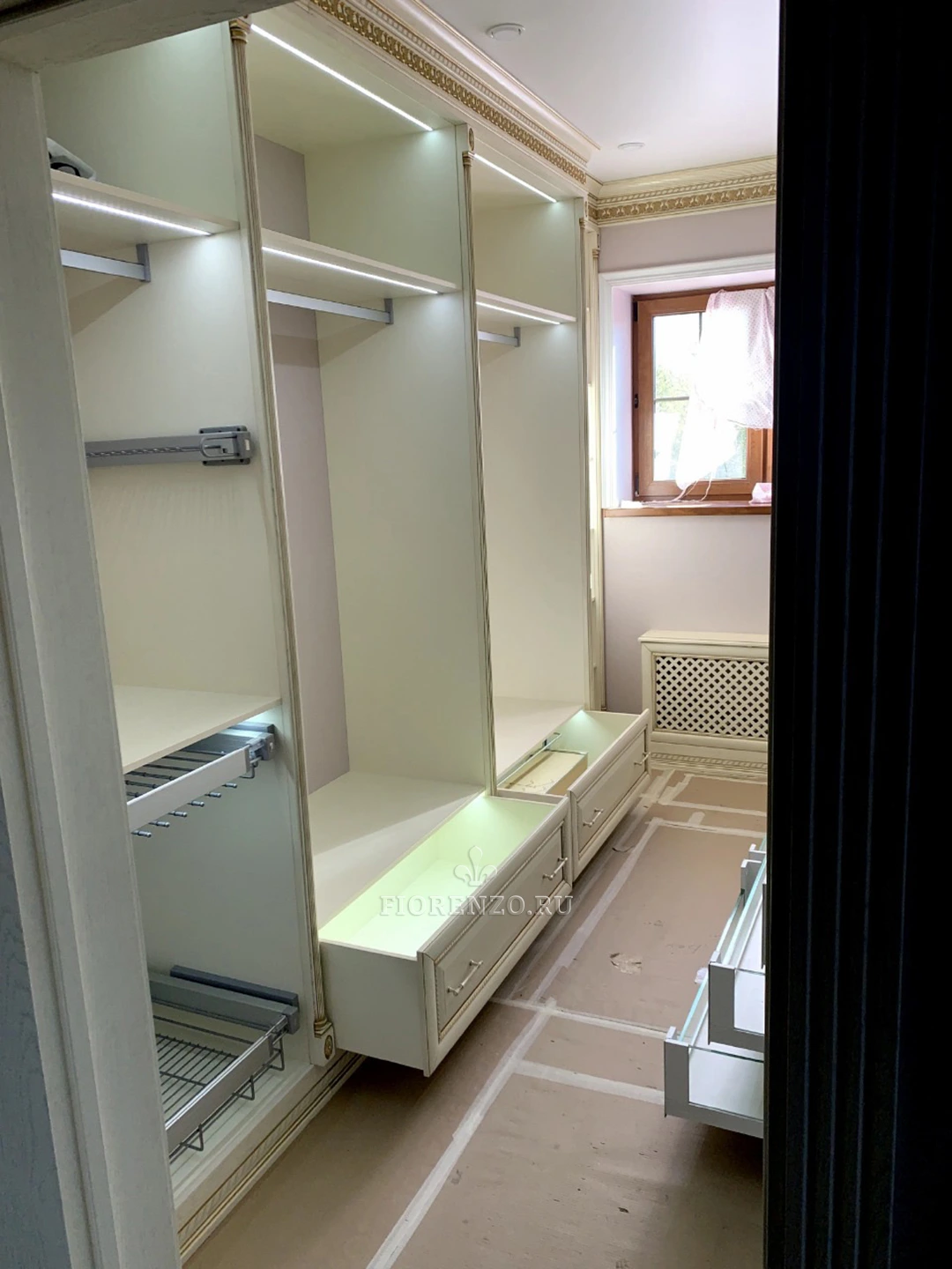 Классическая гардеробная комната «Элегия» производства «Фиорензо» имеет открытую конструкцию и продуманное до мелочей наполнение. Внутренние элементы, составляющие системы хранения вещей, – штанги, полки, ящики, корзины, пр. В проекте предусмотрена подсветка для полок, дополнительно в комнате нужно общее освещение. Особую прелесть выдвижным ящикам придают стеклянные прозрачные ограничители.