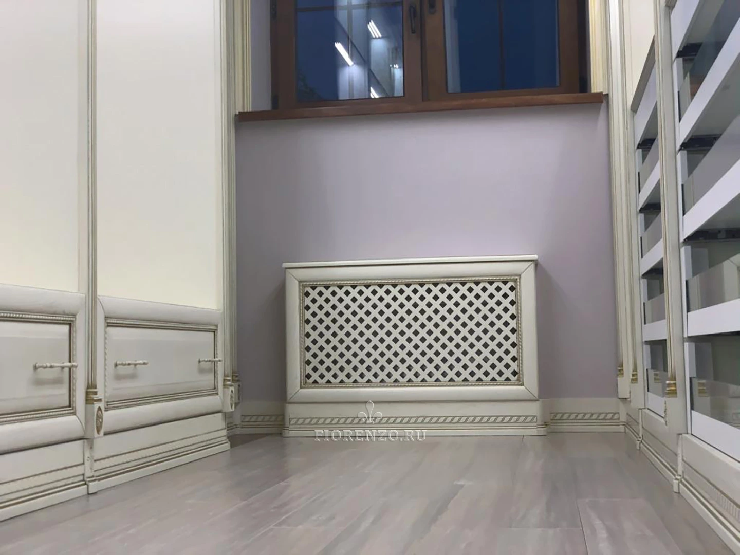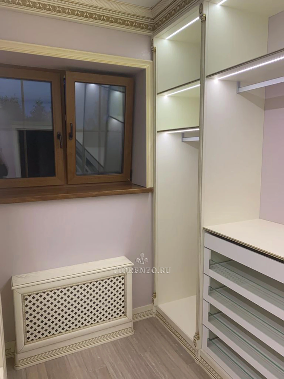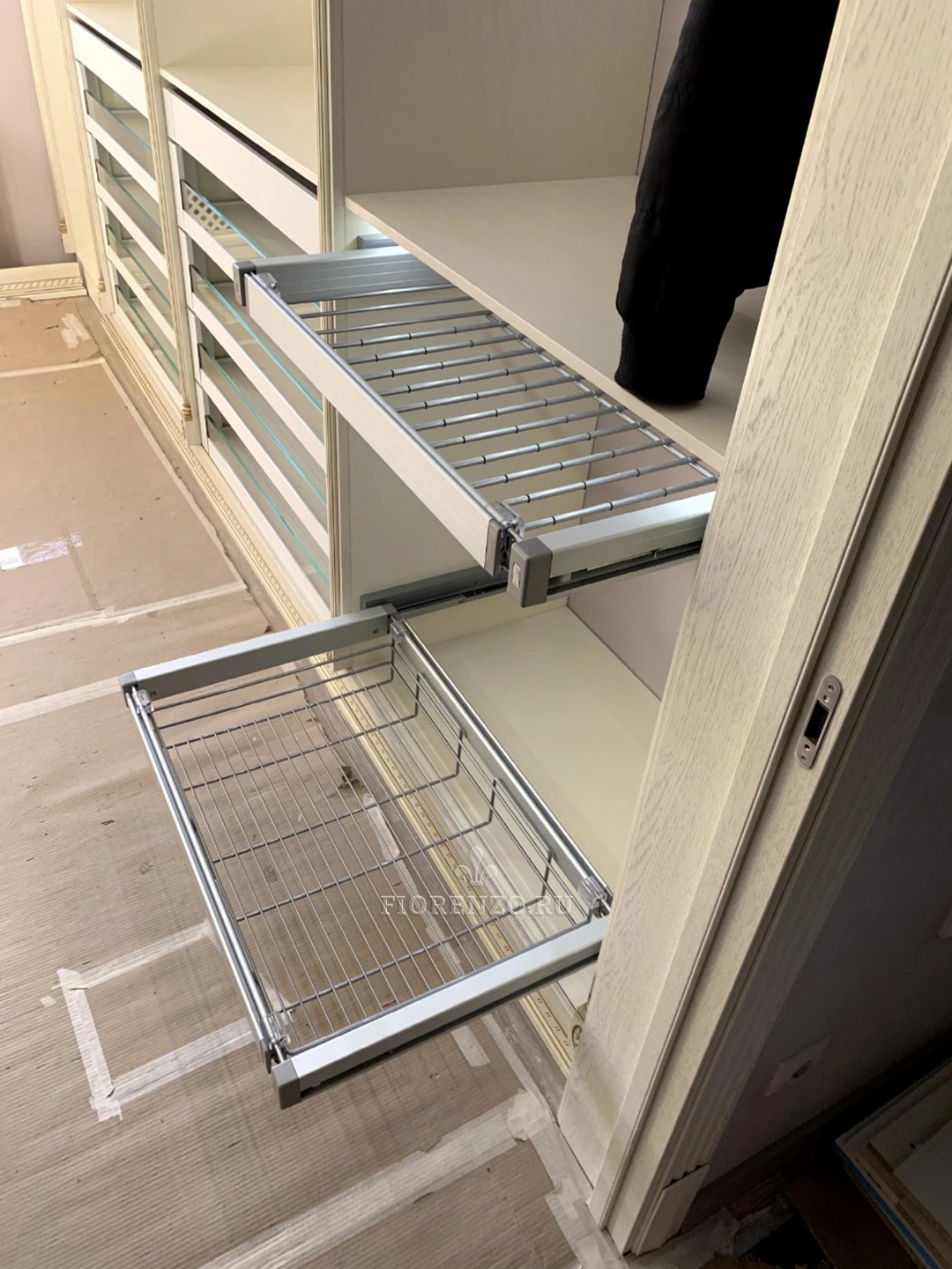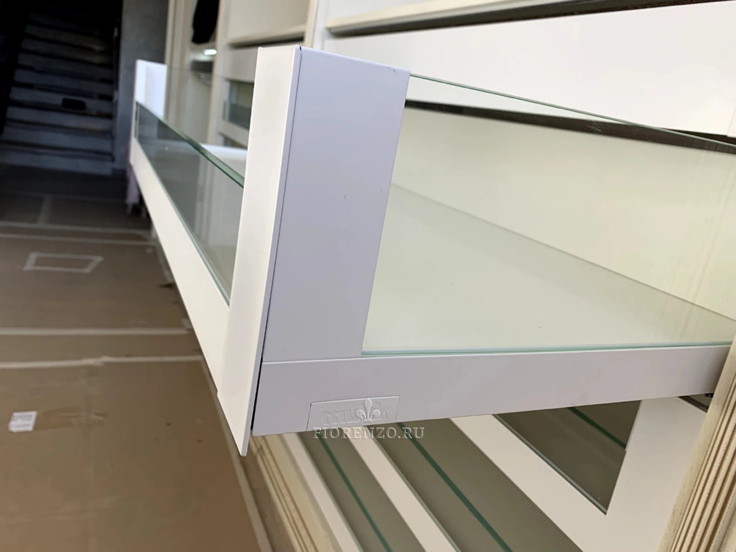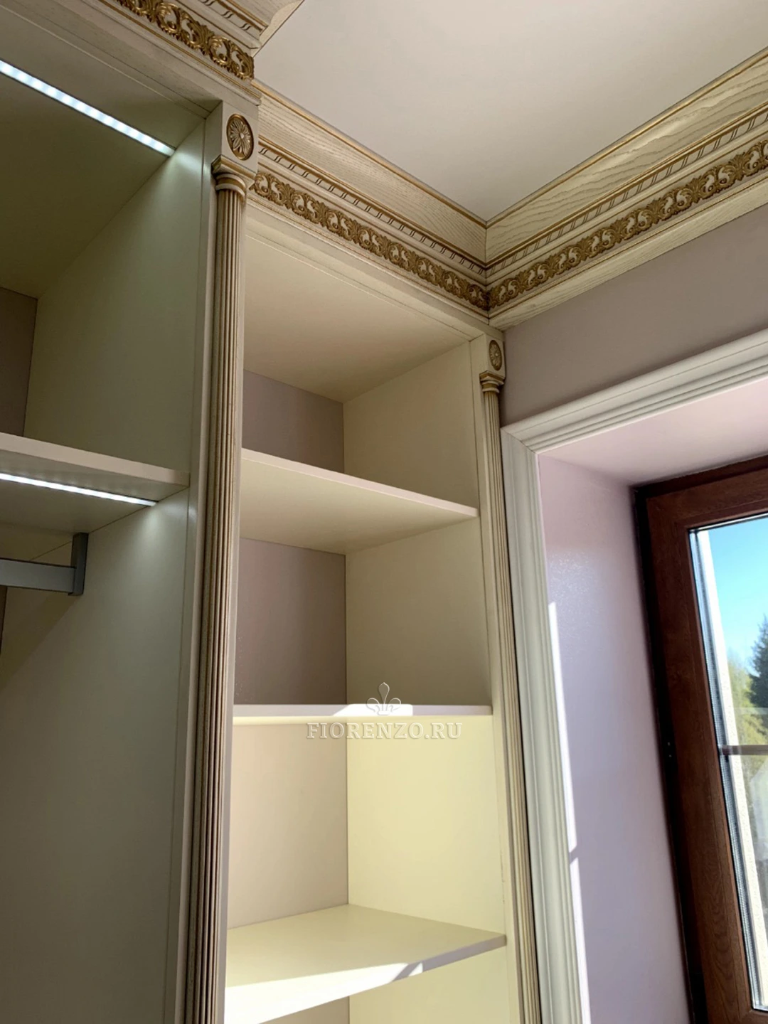 Классическая гардеробная комната «Элегия» производства «Фиорензо» имеет открытую конструкцию и продуманное до мелочей наполнение. Внутренние элементы, составляющие системы хранения вещей, – штанги, полки, ящики, корзины, пр. В проекте предусмотрена подсветка для полок, дополнительно в комнате нужно общее освещение. Особую прелесть выдвижным ящикам придают стеклянные прозрачные ограничители.
