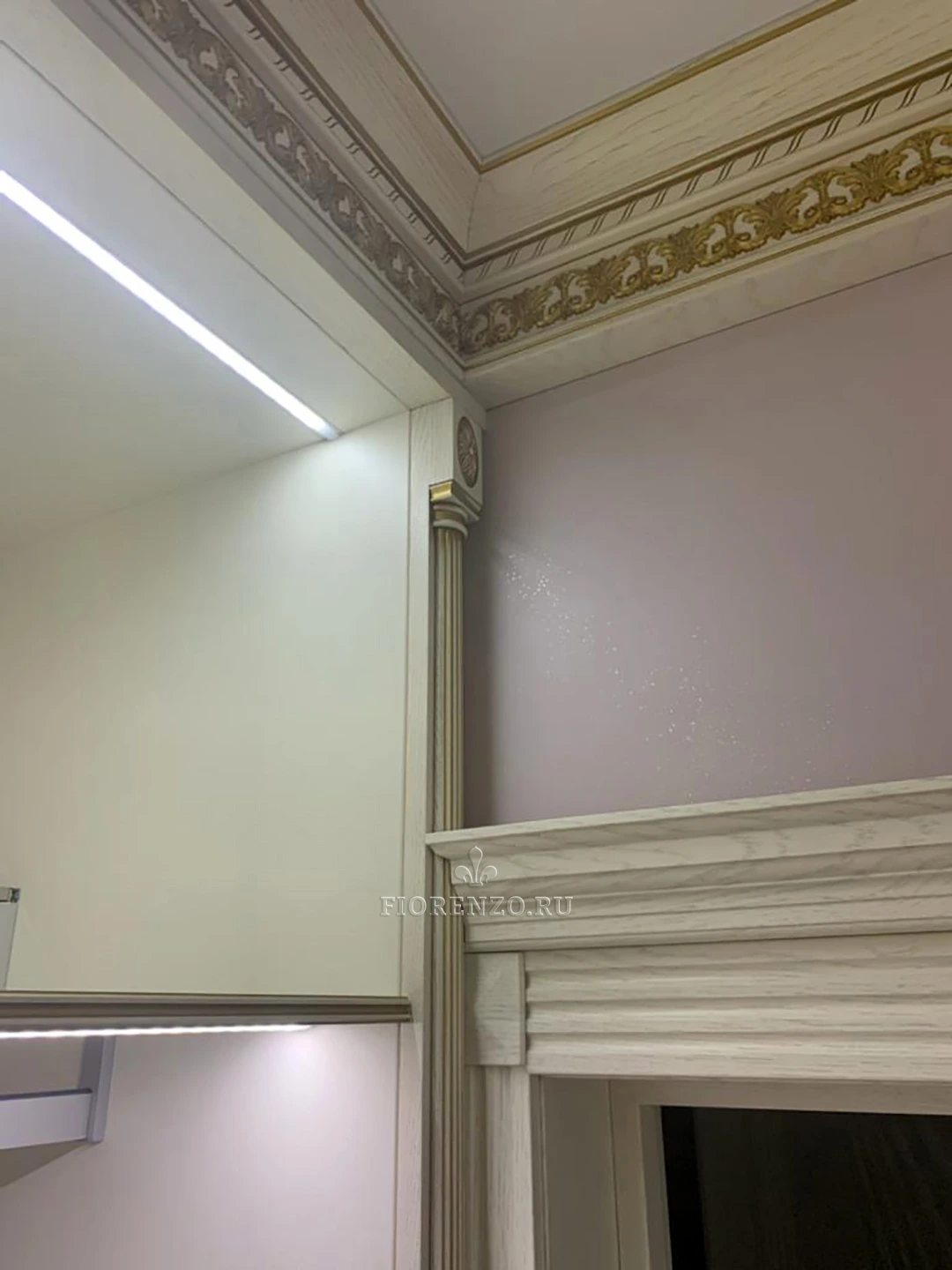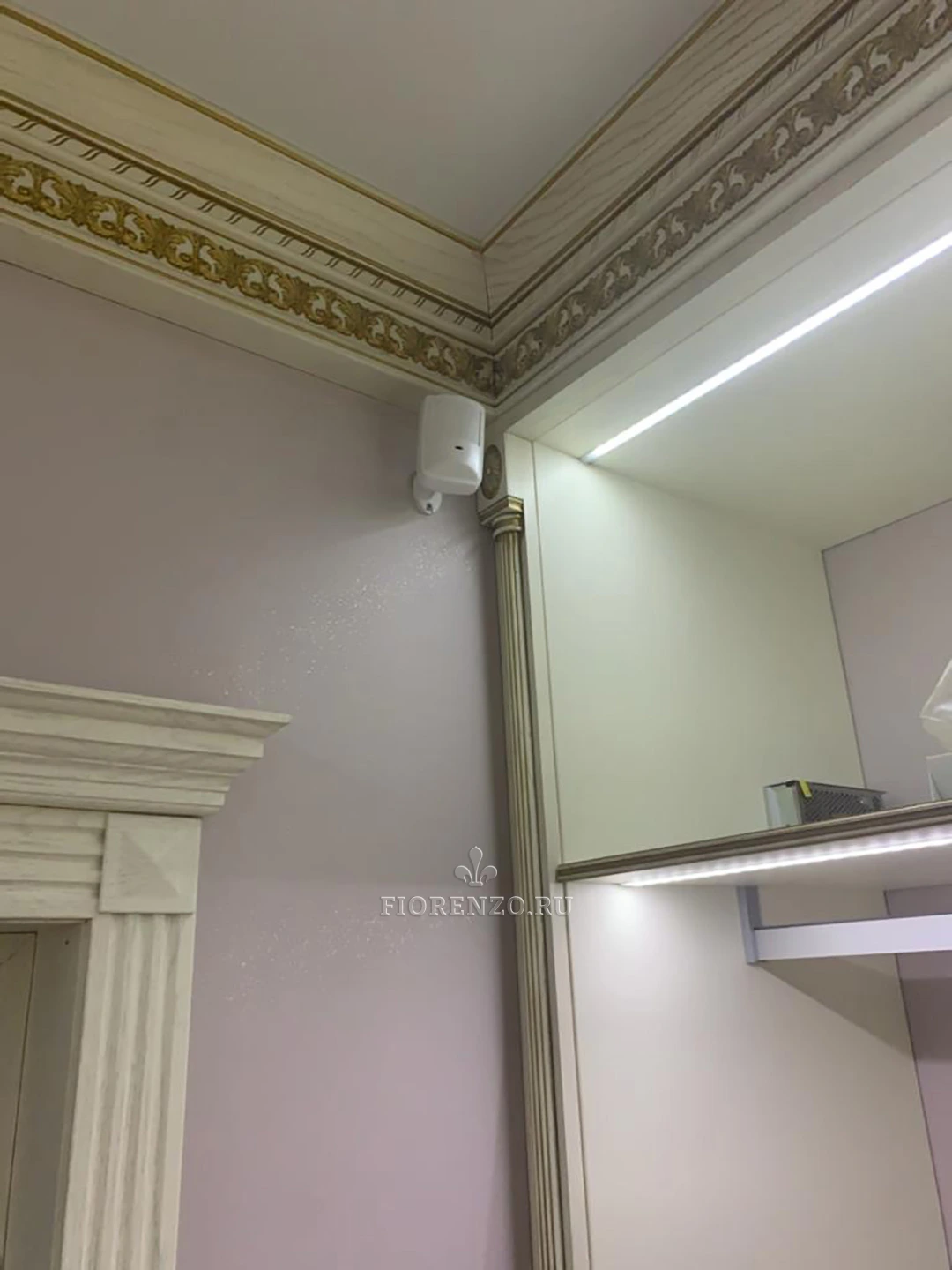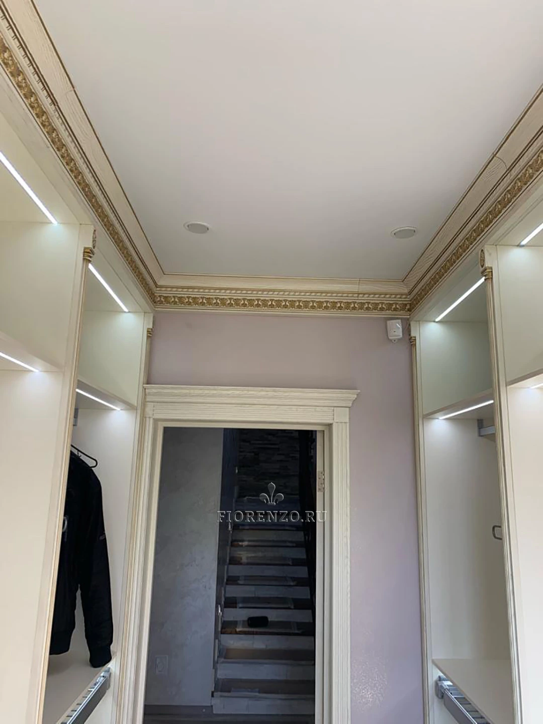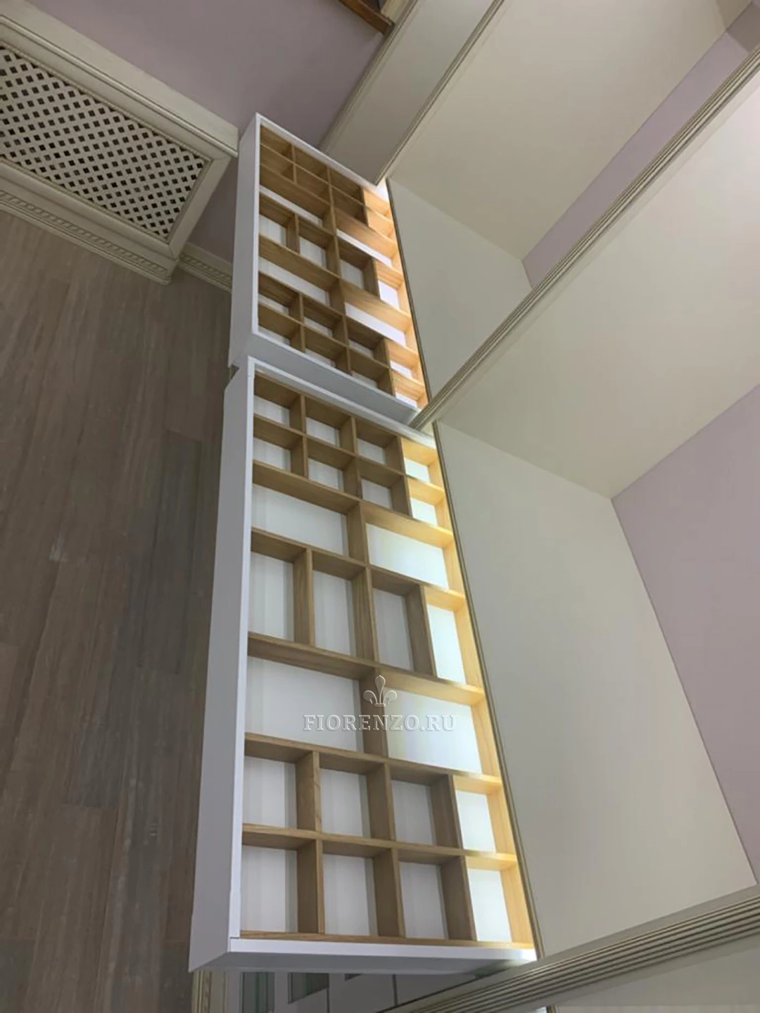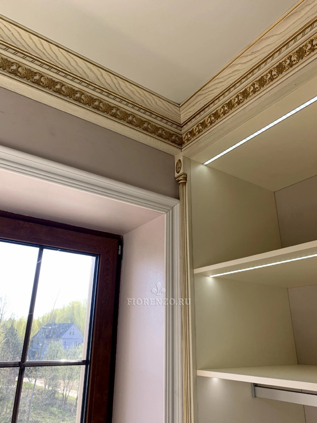 Классическая гардеробная комната «Элегия» производства «Фиорензо» имеет открытую конструкцию и продуманное до мелочей наполнение. Внутренние элементы, составляющие системы хранения вещей, – штанги, полки, ящики, корзины, пр. В проекте предусмотрена подсветка для полок, дополнительно в комнате нужно общее освещение. Особую прелесть выдвижным ящикам придают стеклянные прозрачные ограничители.