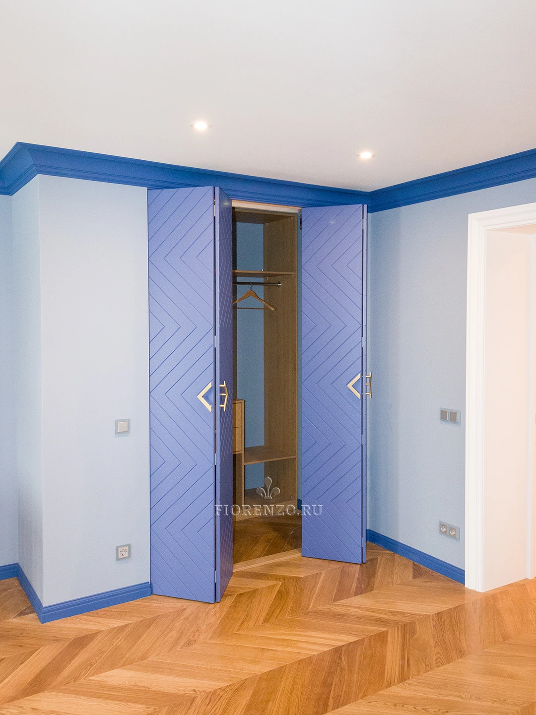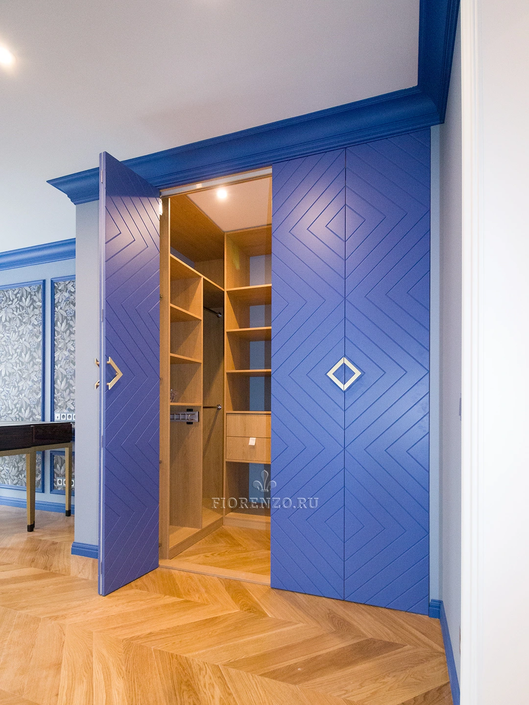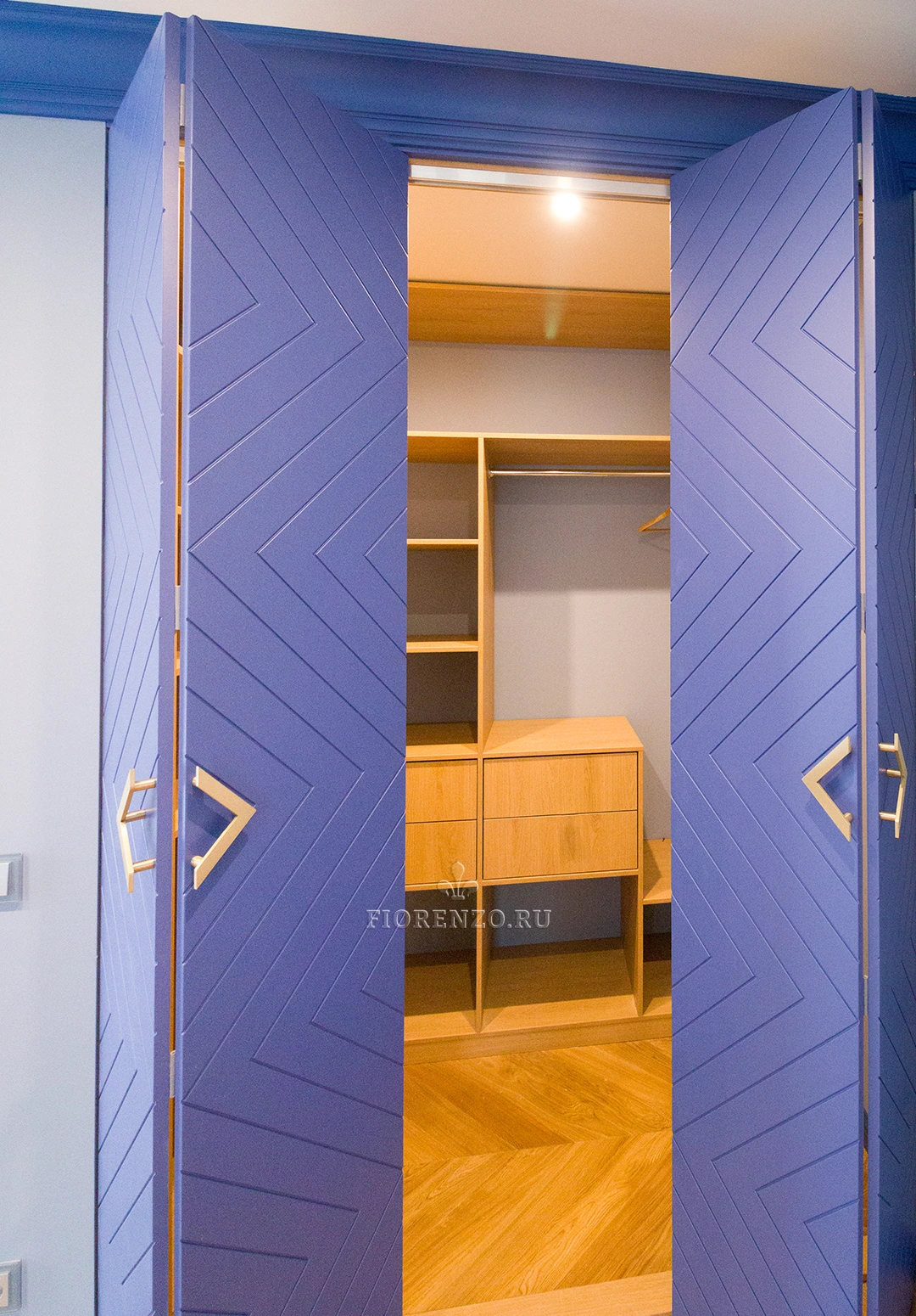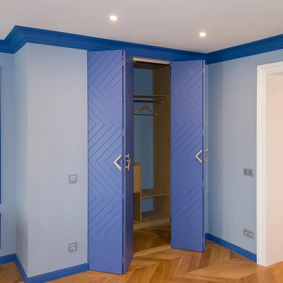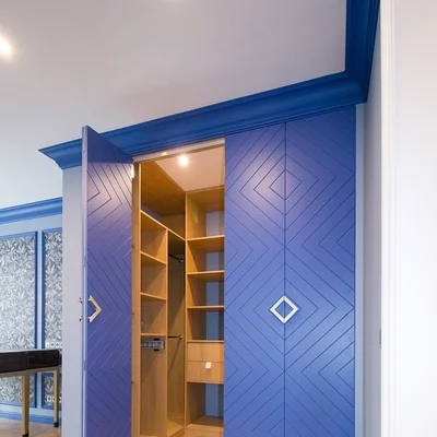 Гардеробная комната Ларнака со складными фрезерованными дверьми станет отличным украшением любой спальной комнаты. Планировка шкафов П-образная – по периметру помещения. Изготовлена на заказ по индивидуальным размерам поэтому проблем при монтаже и эксплуатации не возникнет.