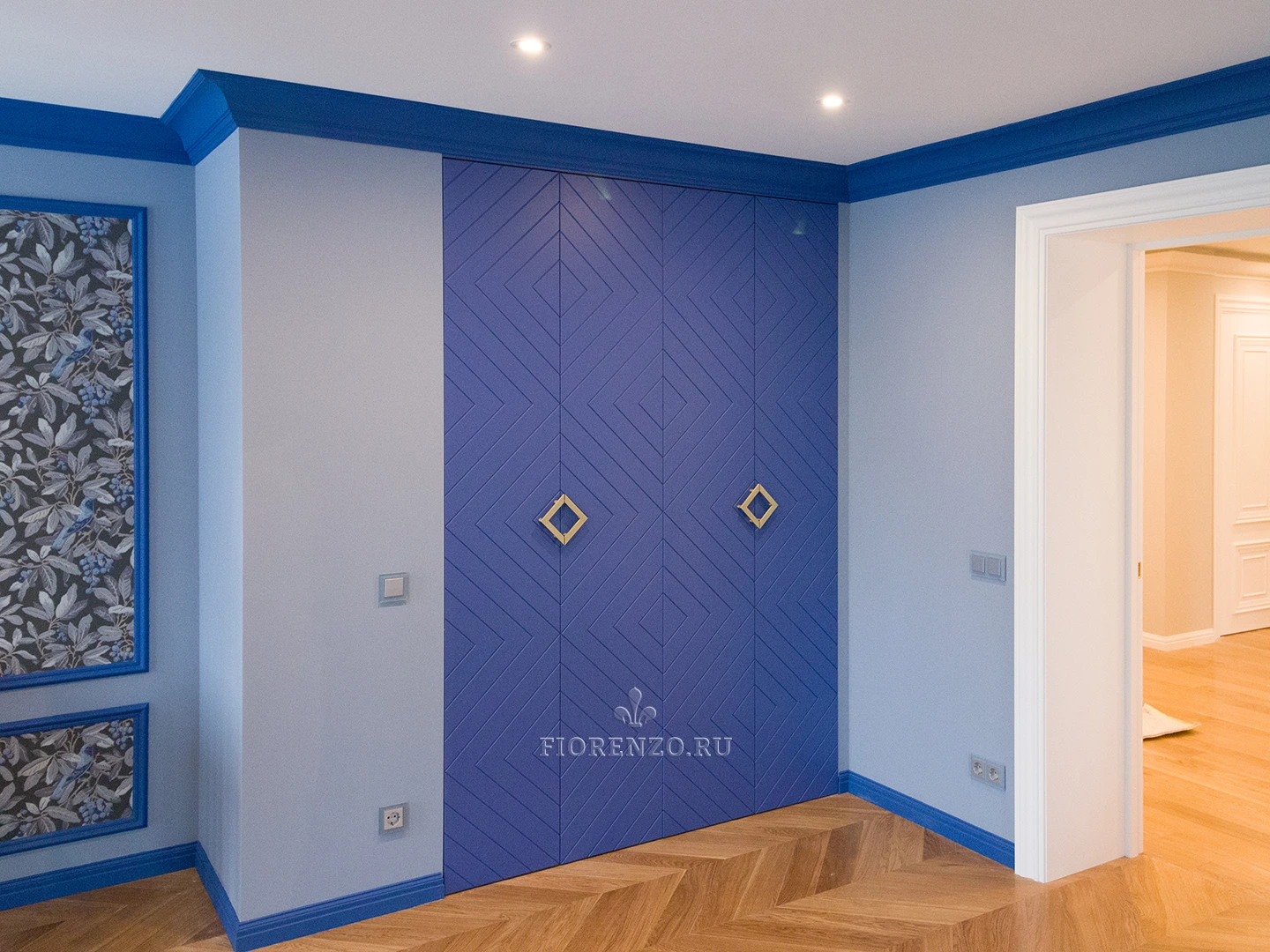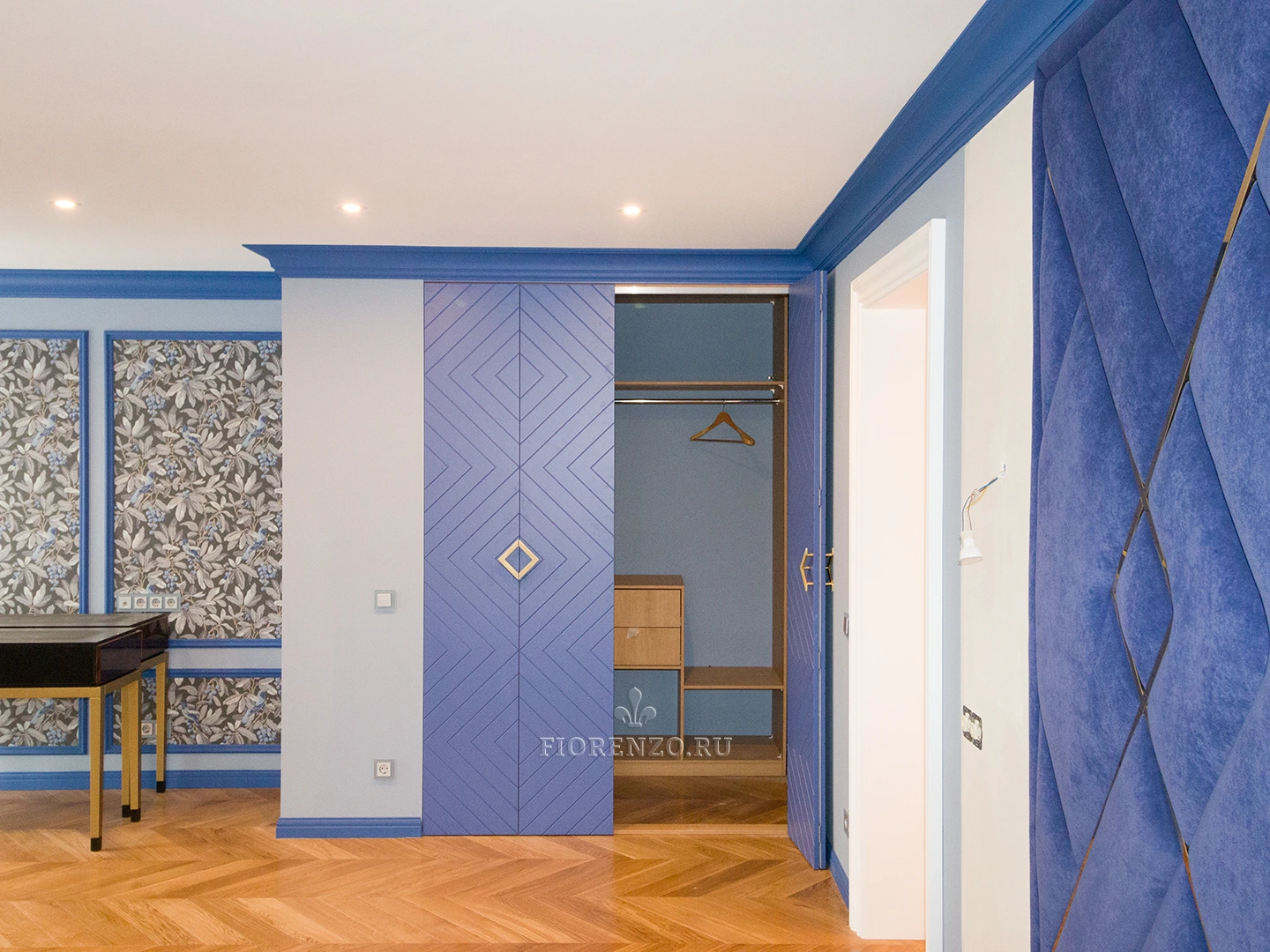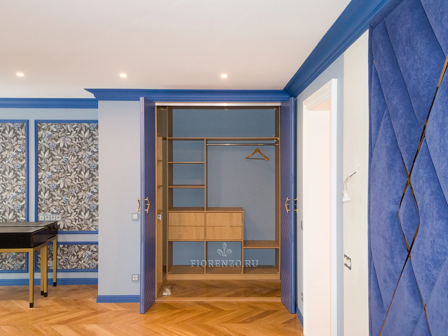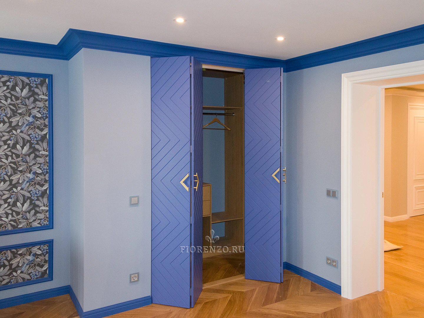 Гардеробная комната Ларнака со складными фрезерованными дверьми станет отличным украшением любой спальной комнаты. Планировка шкафов П-образная – по периметру помещения. Изготовлена на заказ по индивидуальным размерам поэтому проблем при монтаже и эксплуатации не возникнет.