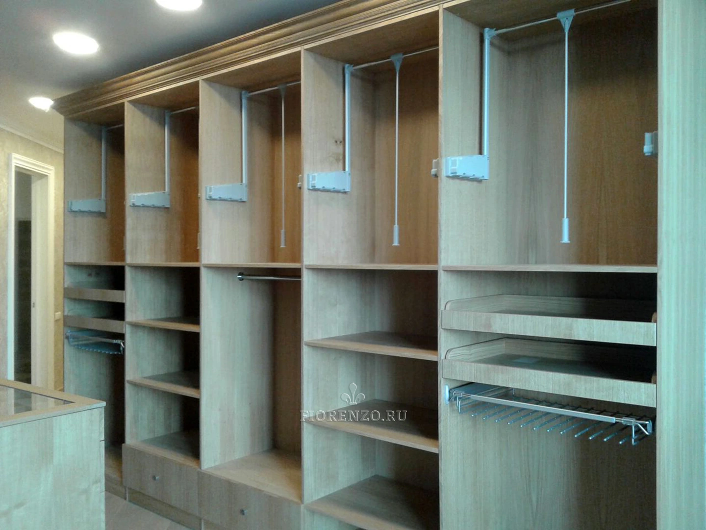 Все детали мебели для гардеробной под заказ сделаны из шпона натурального дерева. Использовалась фурнитура от австрийской компании Blum с доводчиками.
