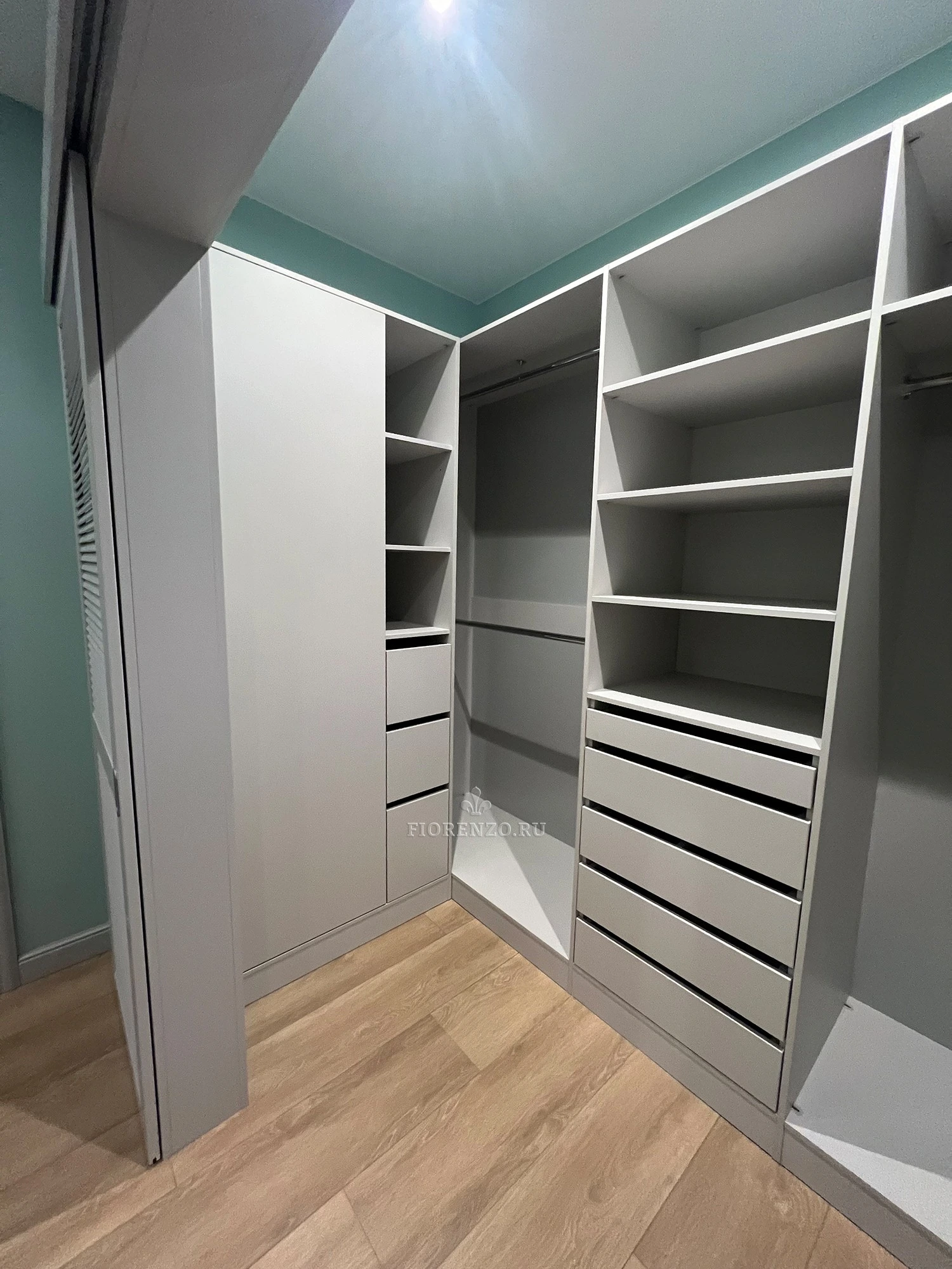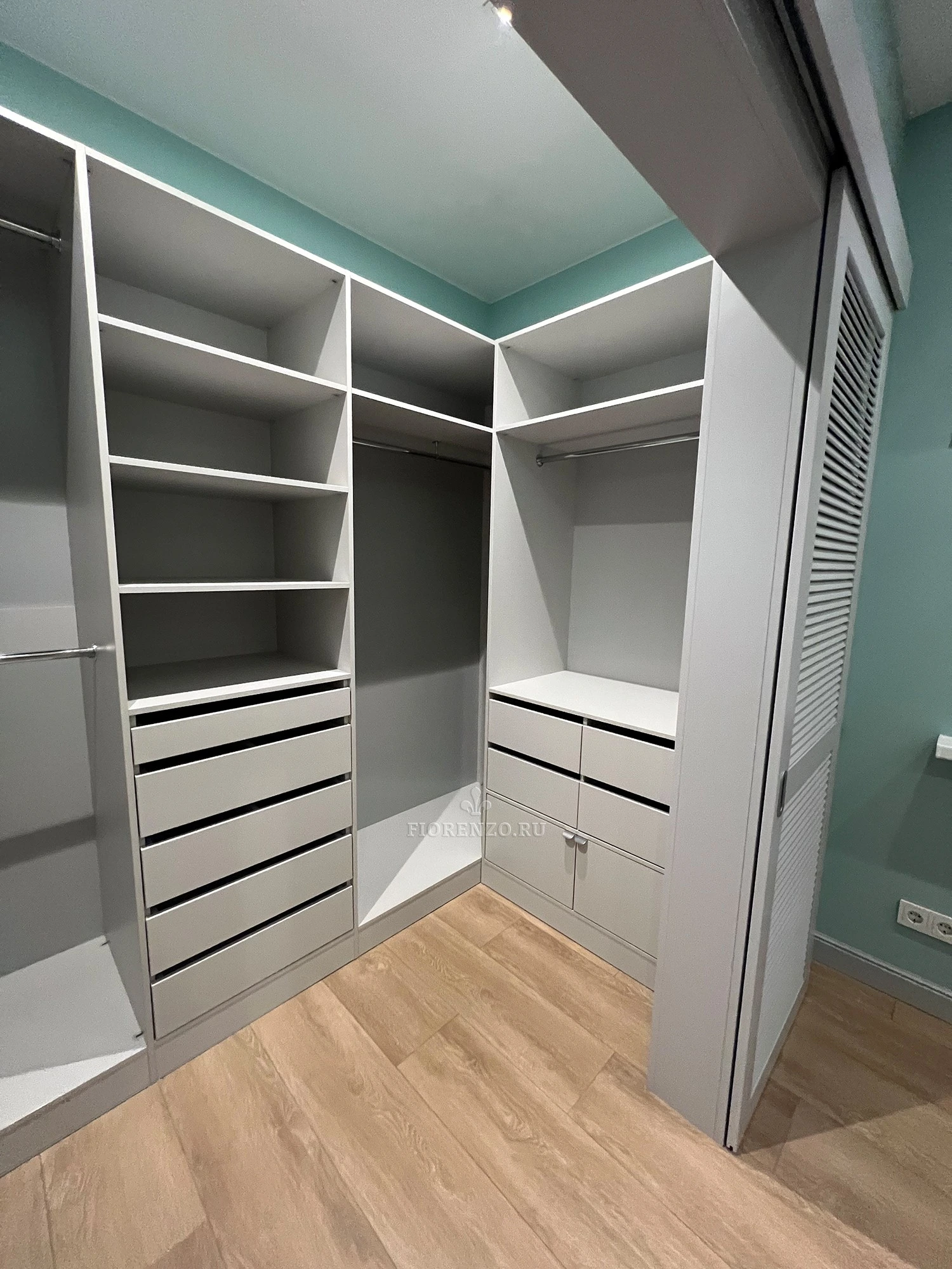 П-образная гардеробная с раздвижными жалюзийными дверями скрывает вместительную систему хранения. Матовые светло-серые фасады и скрытая направляющая поддерживают минимализм, а ламели обеспечивают естественную вентиляцию. Внутри — высокие отделения под плечики, модульные полки, ящики полного выдвижения и тумба для мелочей. Удобные врезные ручки, тихий ход створок и износостойкое напольное покрытие делают пространство практичным и аккуратным каждый день.