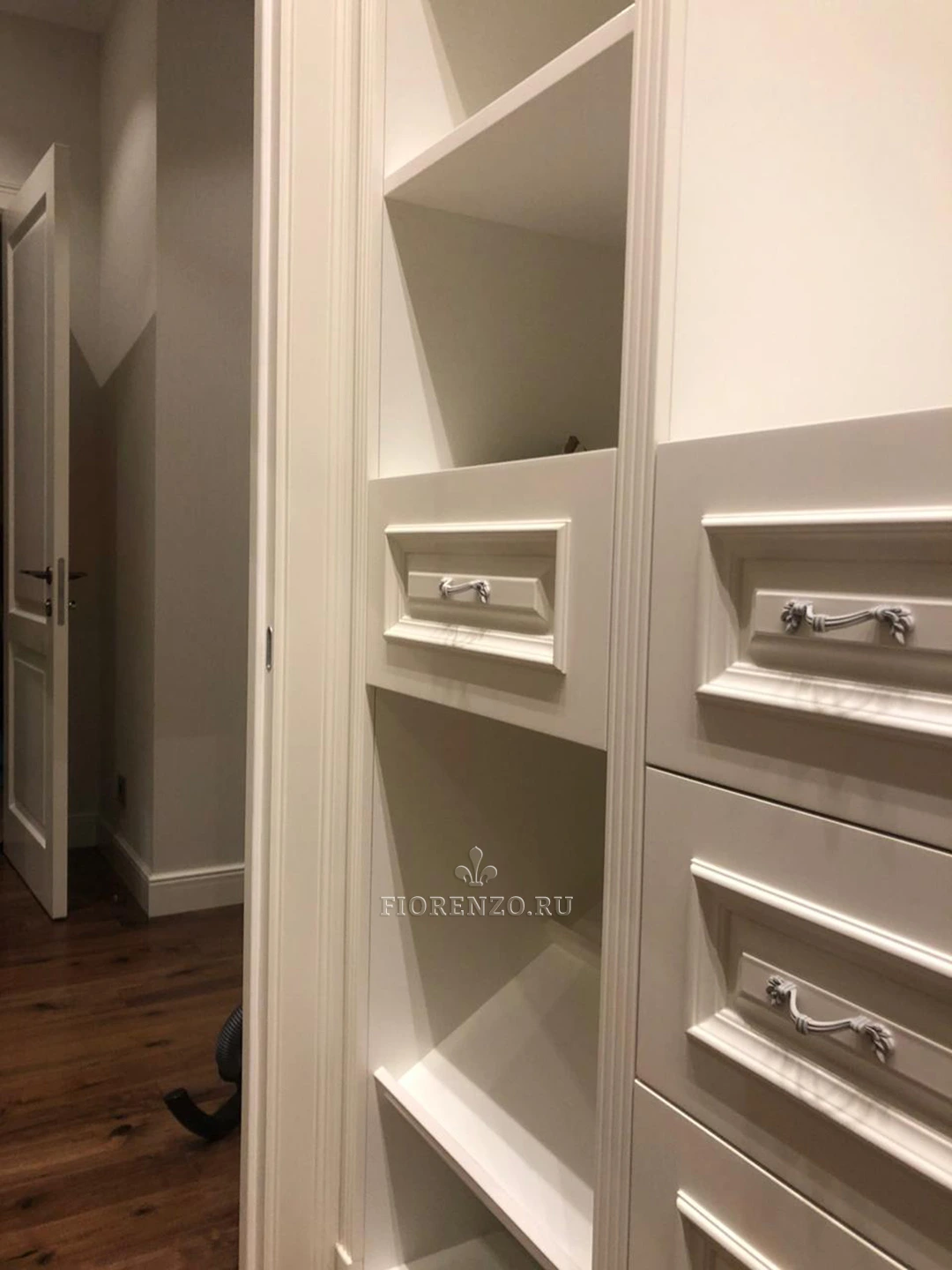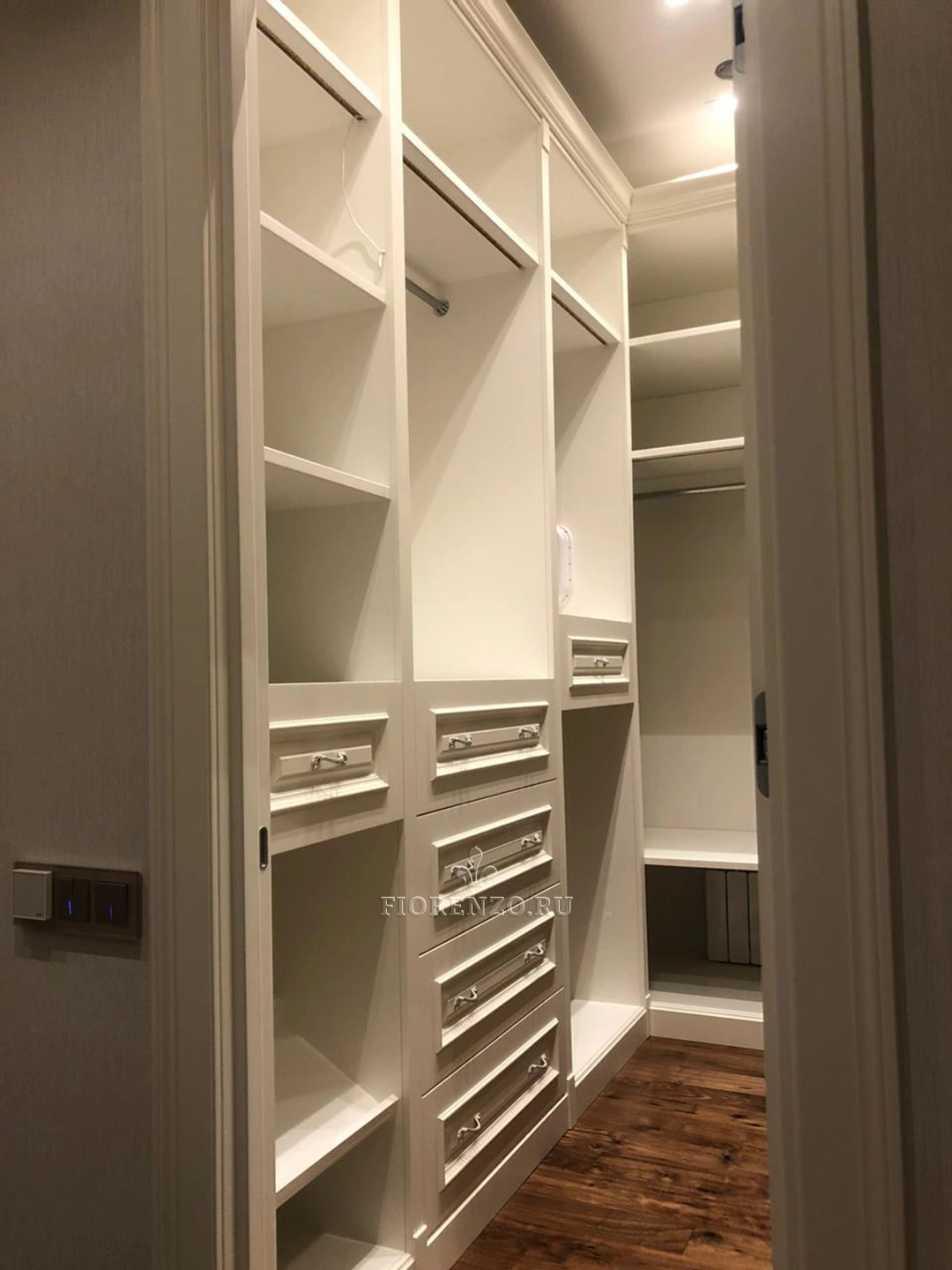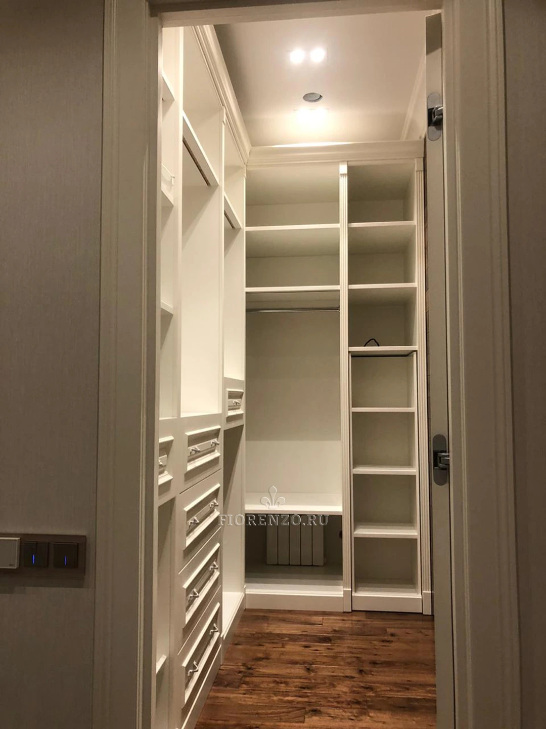 Компания «Фиорензо» проектирует мебель по замерам помещения заказчика. Выбирайте стили, дизайны, форматы, вместительность, определяйте доступный бюджет и делайте заказ. Применяем в работе импортное сырье (панели МДФ, ЛСДП), фурнитуру ТМ «Блум», «Грасс» (Австрия, она стойкая к износу, рассчитана на увеличенное число циклов открывания и закрывания). Гардеробная «Дуомо» в классическом стиле подойдет для установки в отдельном небольшом помещении либо займет часть жилой комнаты. Она имеет П-конфигурацию, устанавливается вдоль двух стен.