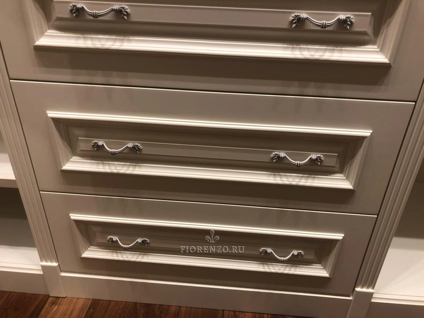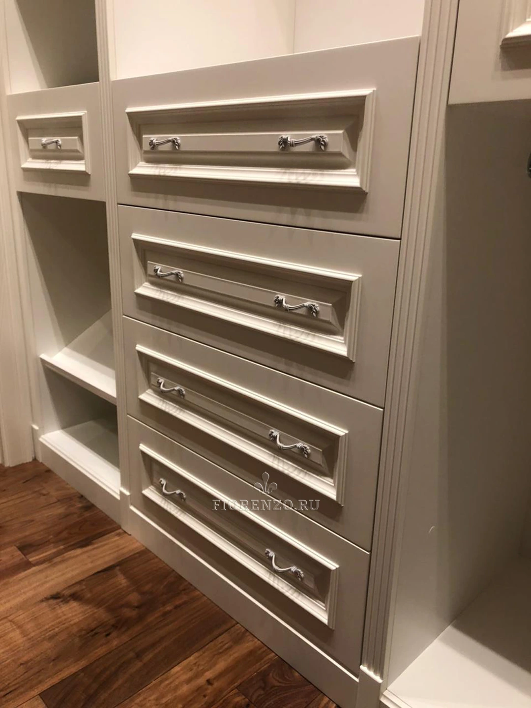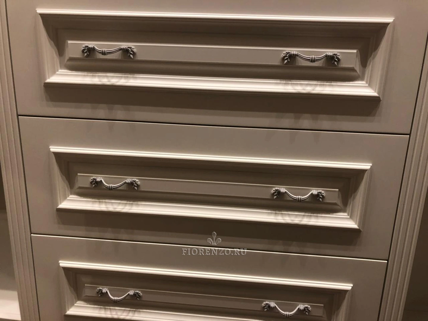 Компания «Фиорензо» проектирует мебель по замерам помещения заказчика. Выбирайте стили, дизайны, форматы, вместительность, определяйте доступный бюджет и делайте заказ. Применяем в работе импортное сырье (панели МДФ, ЛСДП), фурнитуру ТМ «Блум», «Грасс» (Австрия, она стойкая к износу, рассчитана на увеличенное число циклов открывания и закрывания). Гардеробная «Дуомо» в классическом стиле подойдет для установки в отдельном небольшом помещении либо займет часть жилой комнаты. Она имеет П-конфигурацию, устанавливается вдоль двух стен.