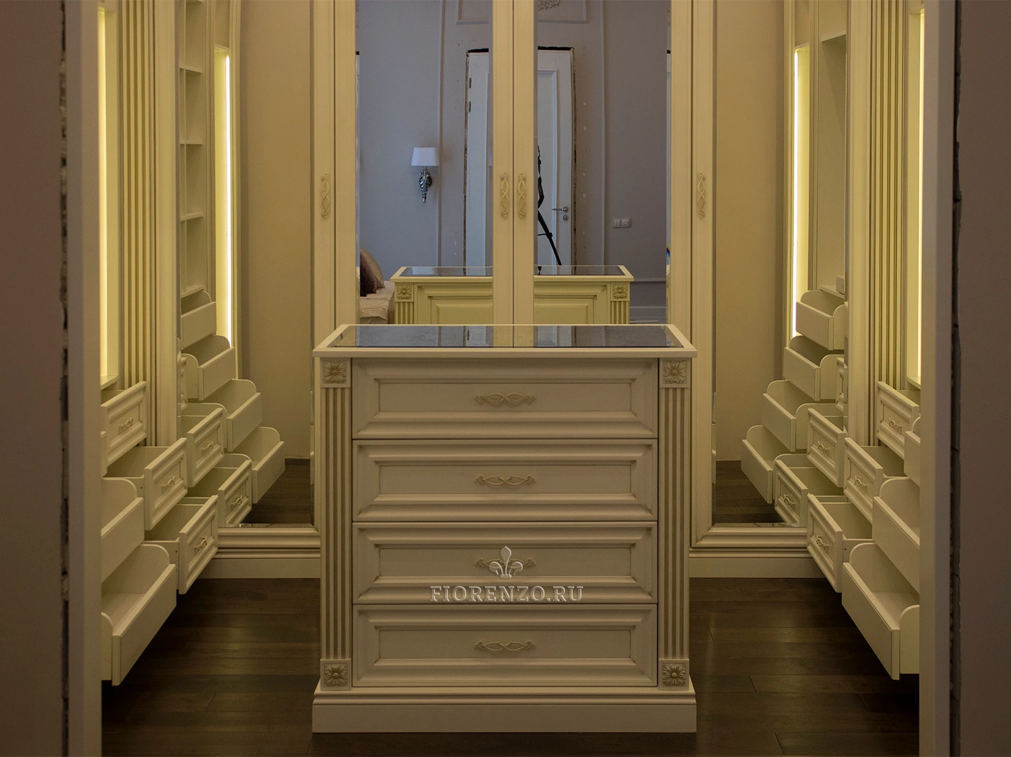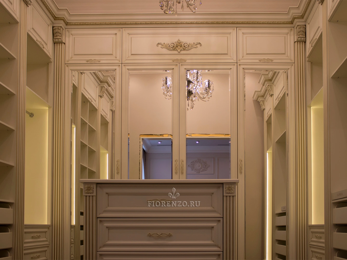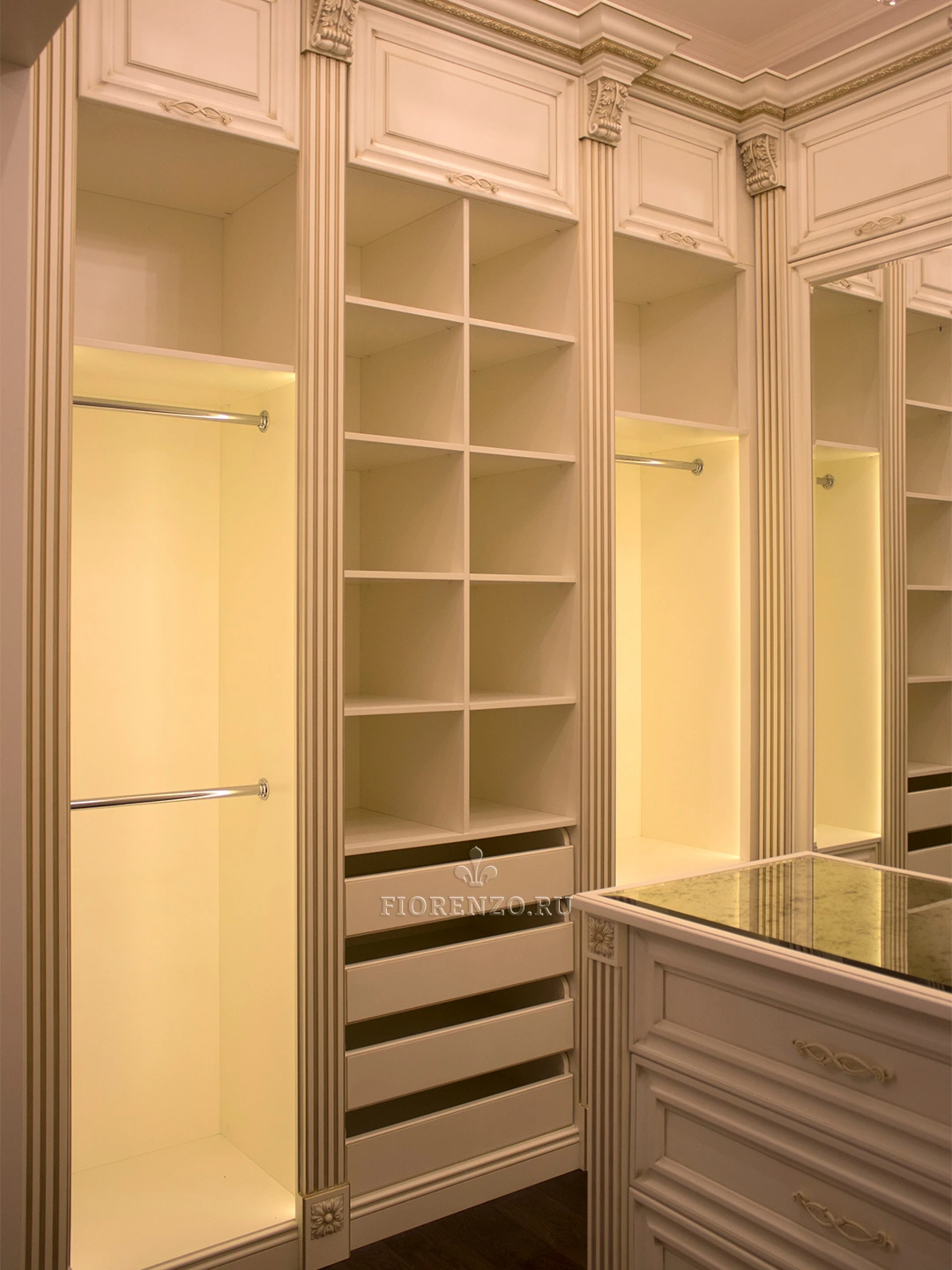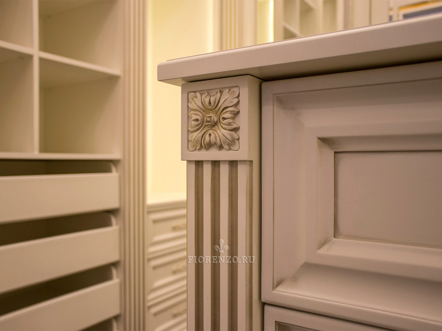 Специалисты «Фиорензо Мебель» разработали и воплотили в жизнь невероятно привлекательный и функциональный проект элитной гардеробной в классическом стиле «Прато». Он поражает воображение своей роскошью, для украшения применены декоративные карнизы и пилястры, цоколи, применен эффект «золотого» патирования, который позволил искусственно состарить изделия, сделать их солидными и дорогими внешне.