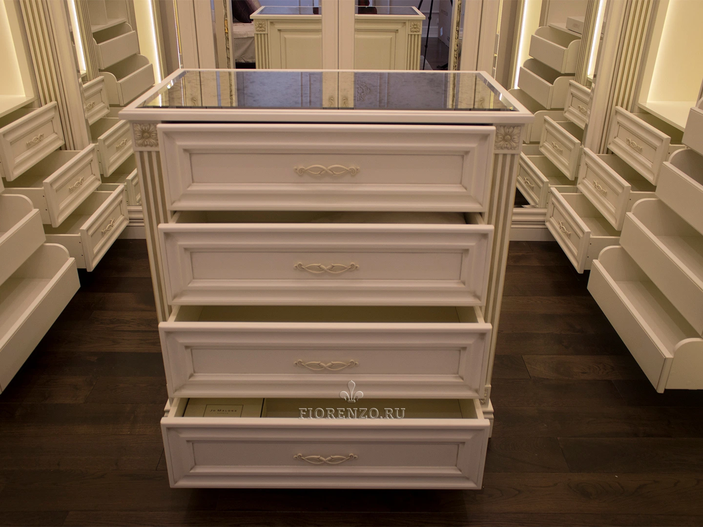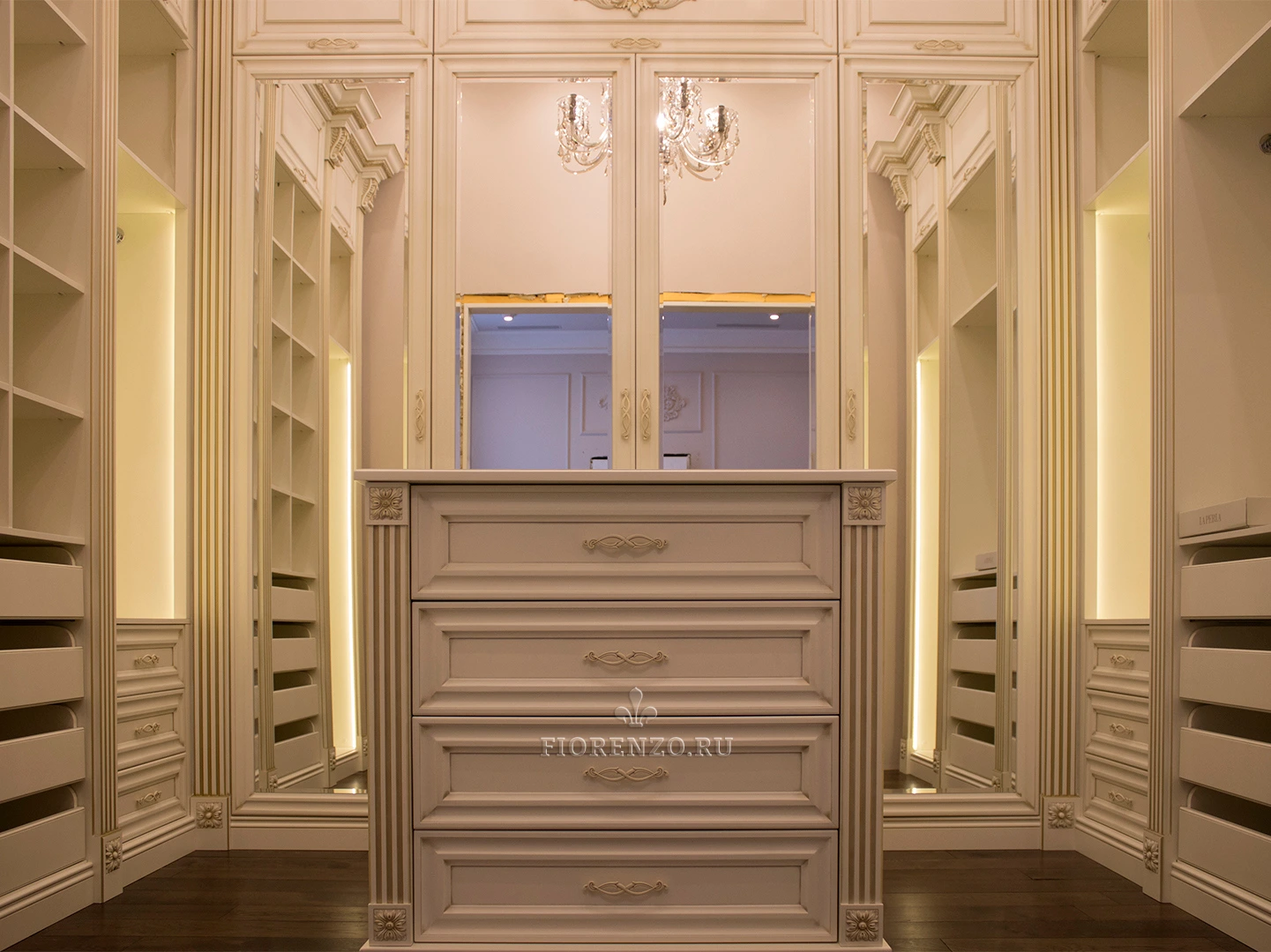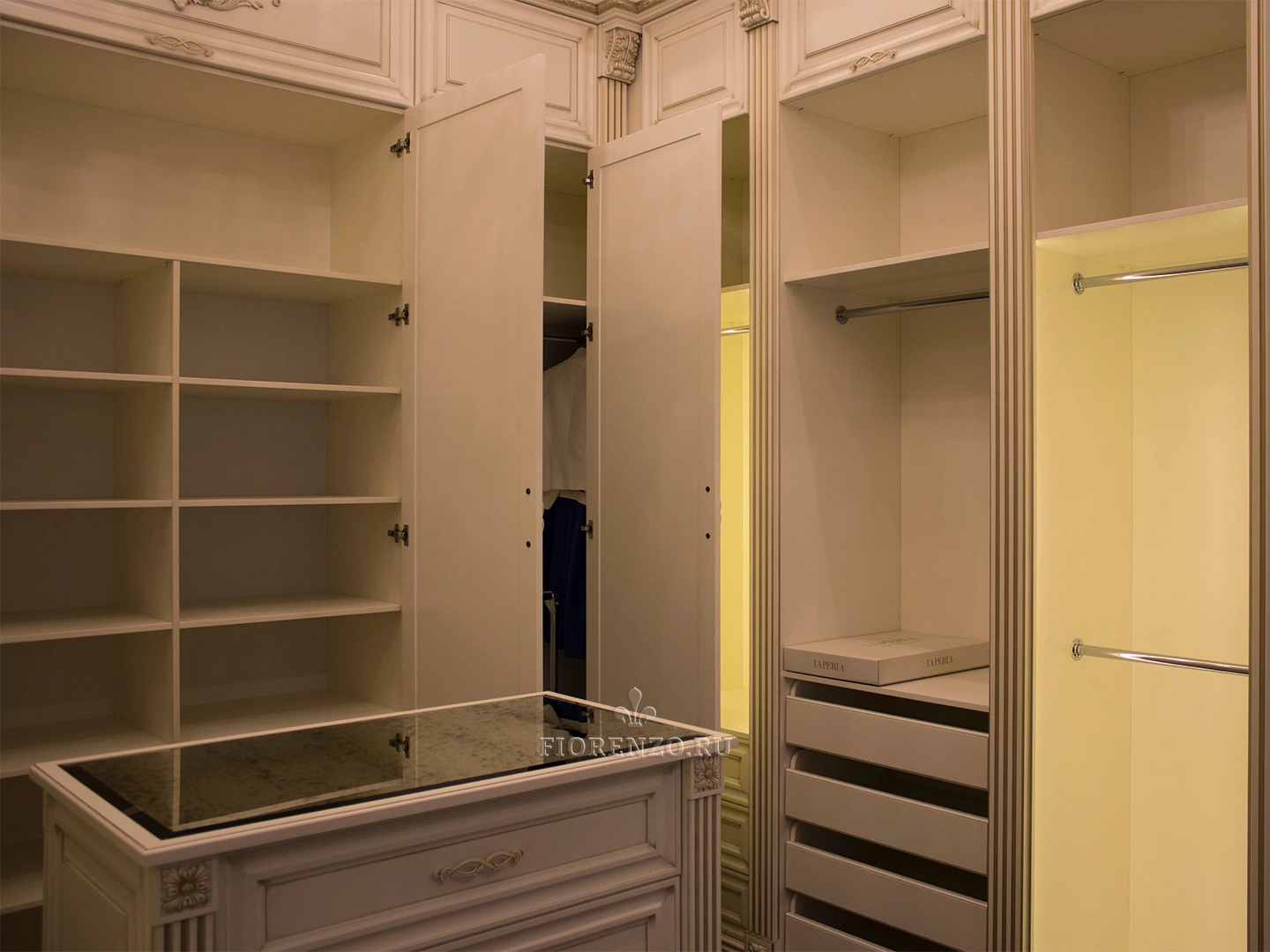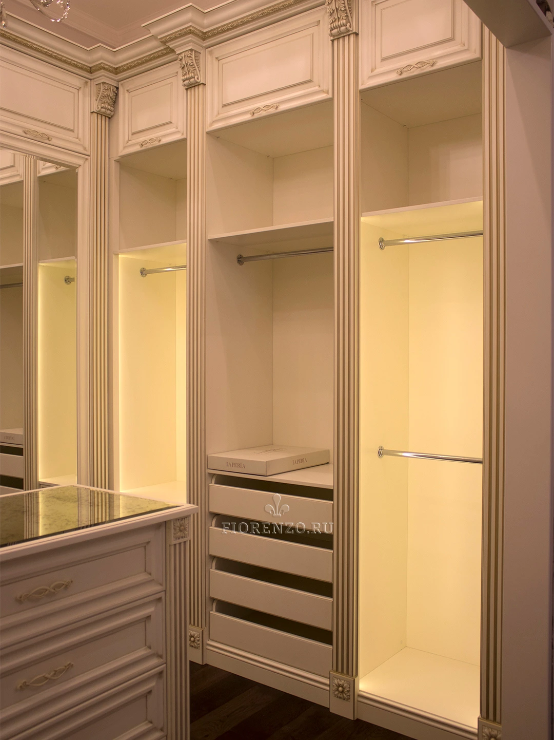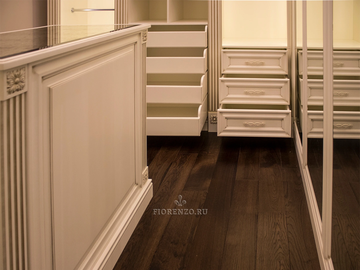 Специалисты «Фиорензо Мебель» разработали и воплотили в жизнь невероятно привлекательный и функциональный проект элитной гардеробной в классическом стиле «Прато». Он поражает воображение своей роскошью, для украшения применены декоративные карнизы и пилястры, цоколи, применен эффект «золотого» патирования, который позволил искусственно состарить изделия, сделать их солидными и дорогими внешне.
