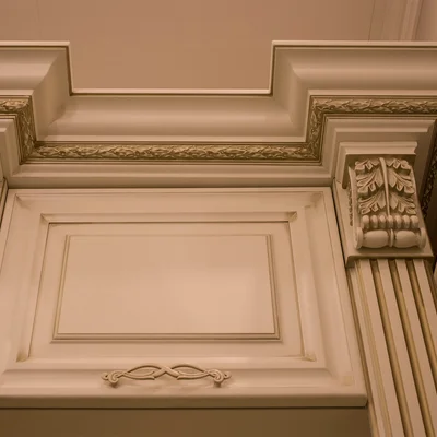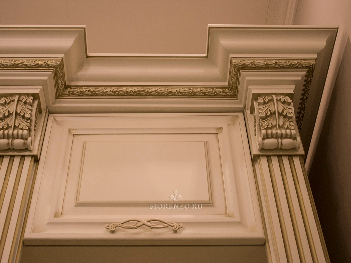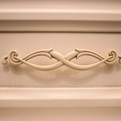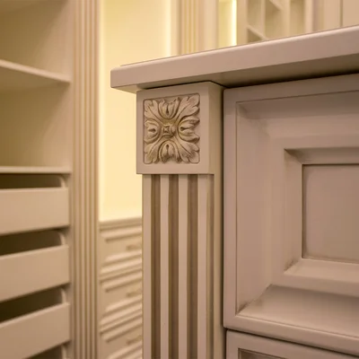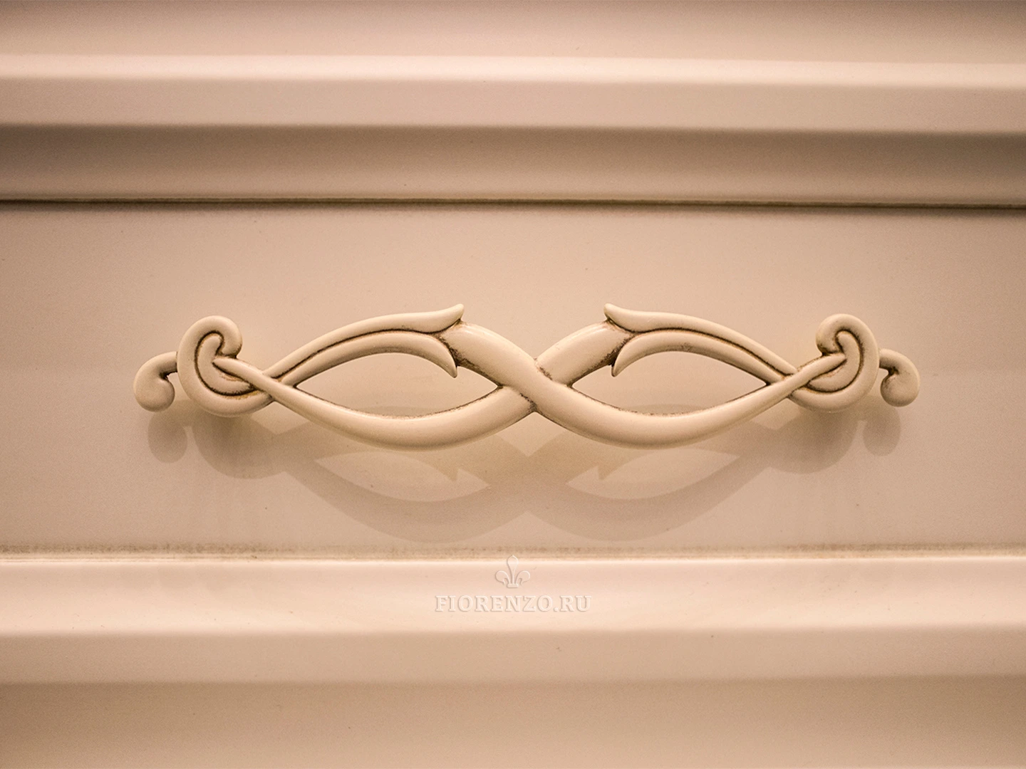 Все видимые детали, декоративные карнизы и пилястры изготовлены из МДФ, покрытого эмалью с эффектом патирования. Фурнитура от компании Blum из Австрии. Корпуса – из экологичного ЛДСП торгового бренда Egger класса Е1.