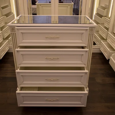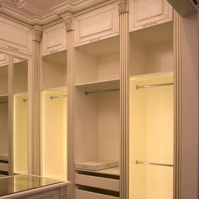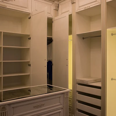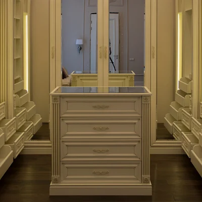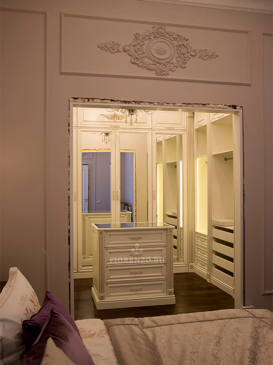 Карнизы и пилястры смотрятся массивно, погружают присутствующих в гардеробной комнате в атмосферу уюта и комфорта царских особ из прошлых веков. Дизайнеры способны разработать похожий эксклюзивный проект для вашего жилья, в котором будут воплощены все задумки и мечты.