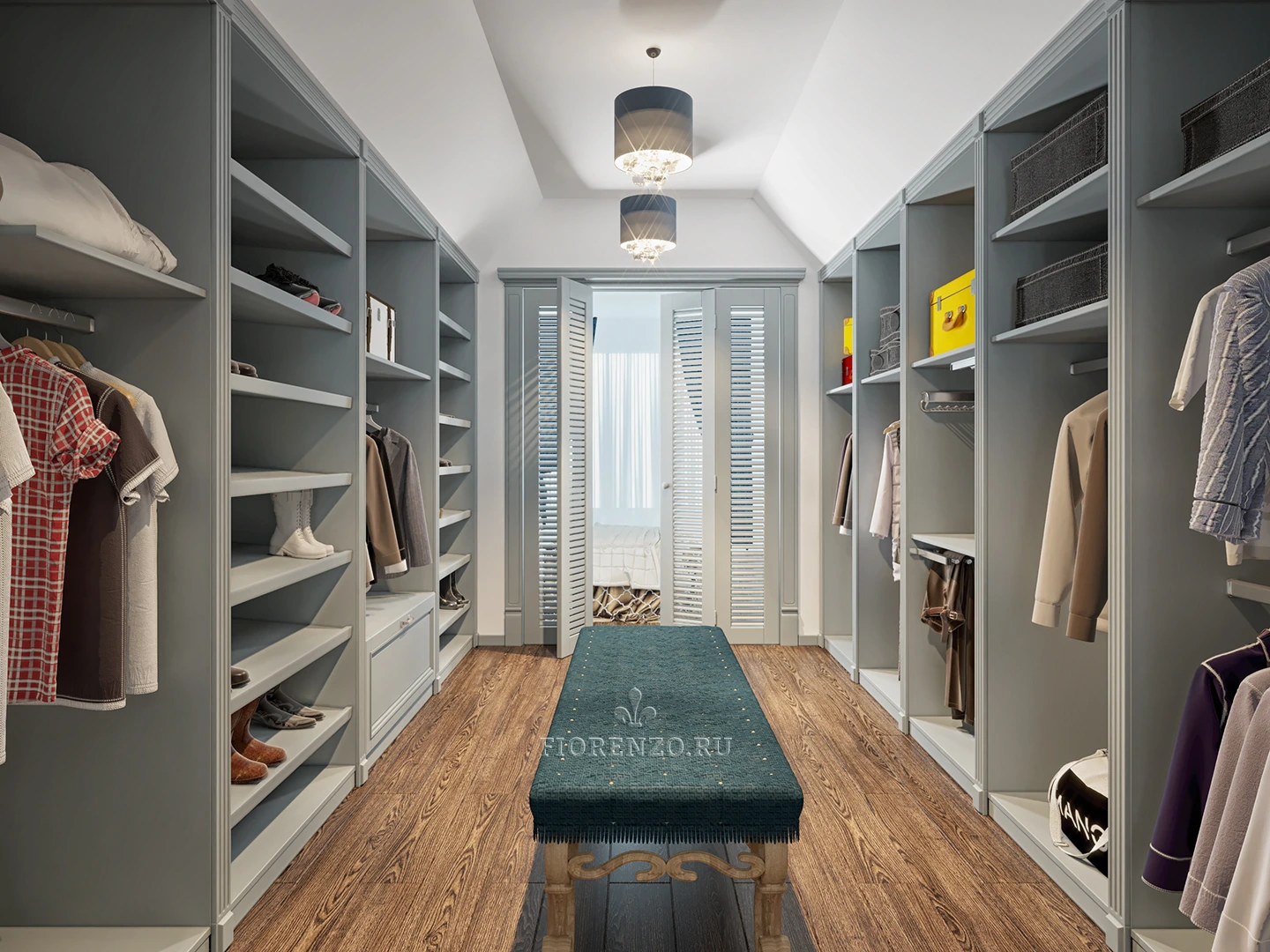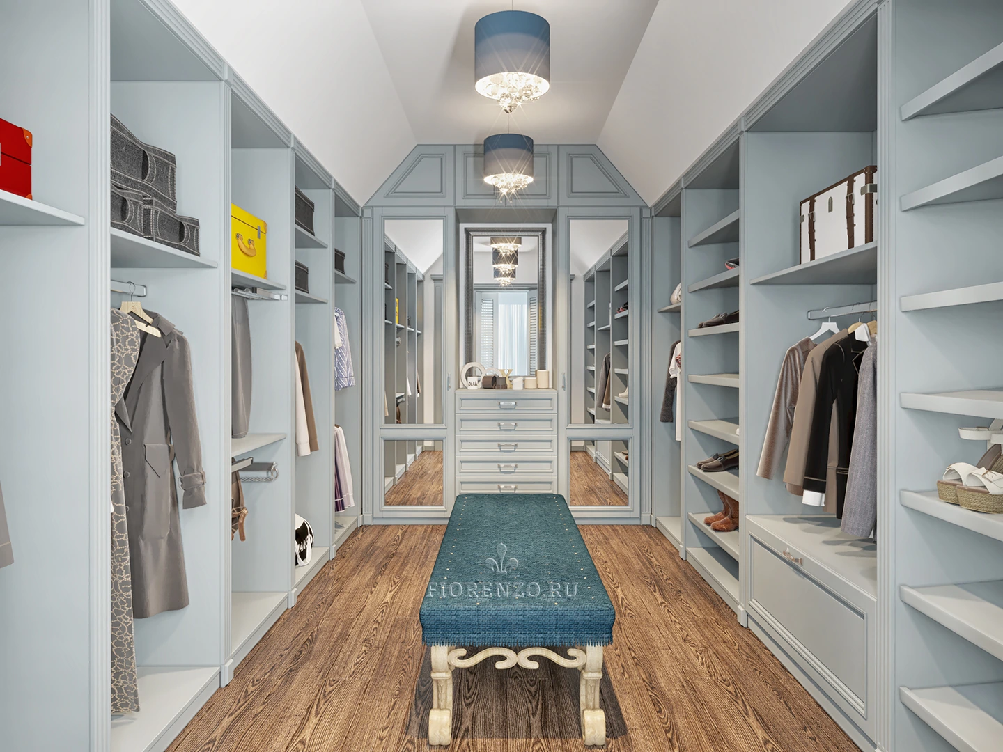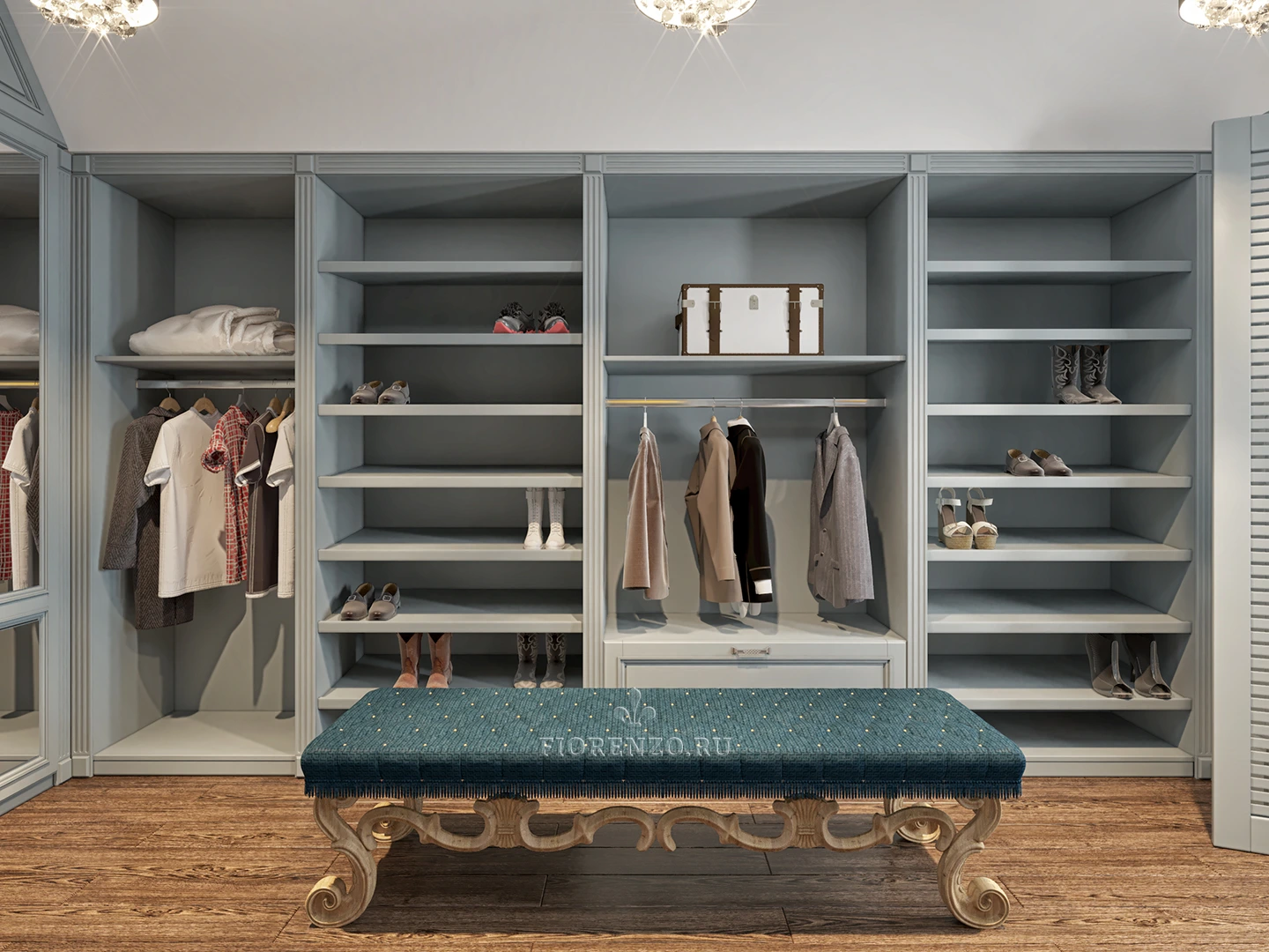 П-образная планировка гардеробной «Пицунда» позволяет разделить комнату на отдельные зоны, каждая из которых предназначена для конкретных целей. Посередине расположен оригинальный пуф, позволяющий без усилий примерить на себе любую деталь гардероба.