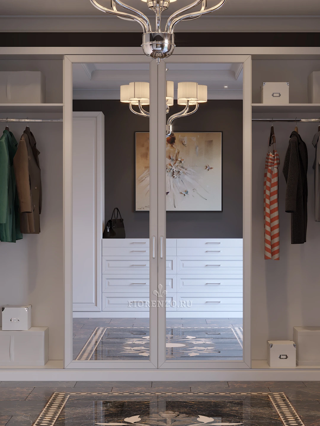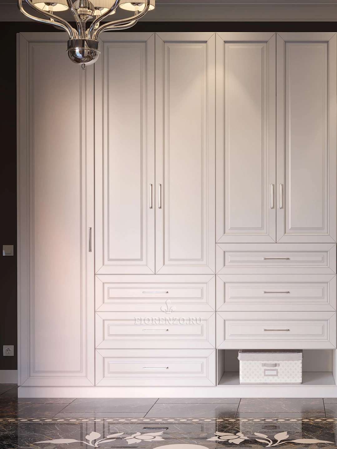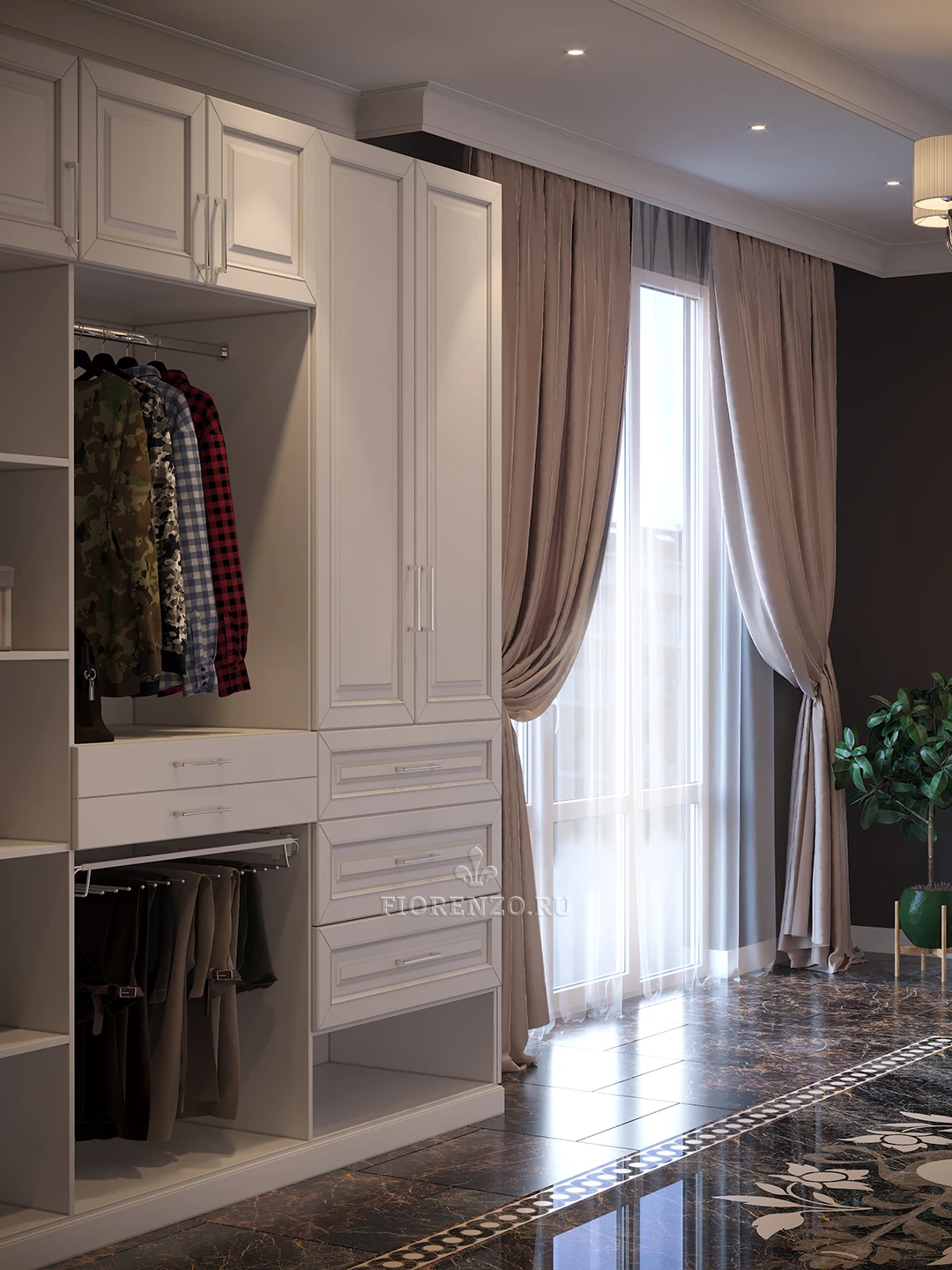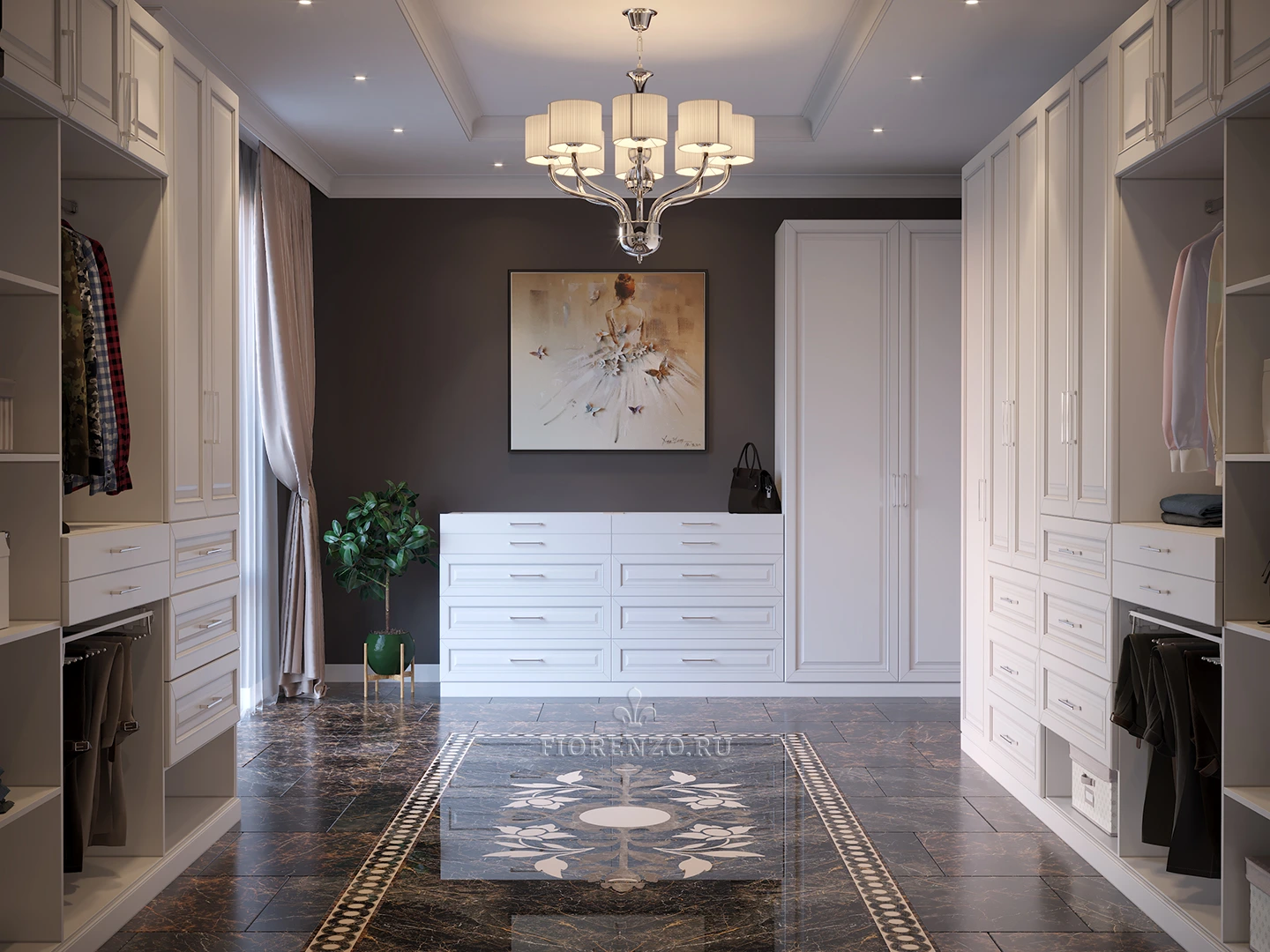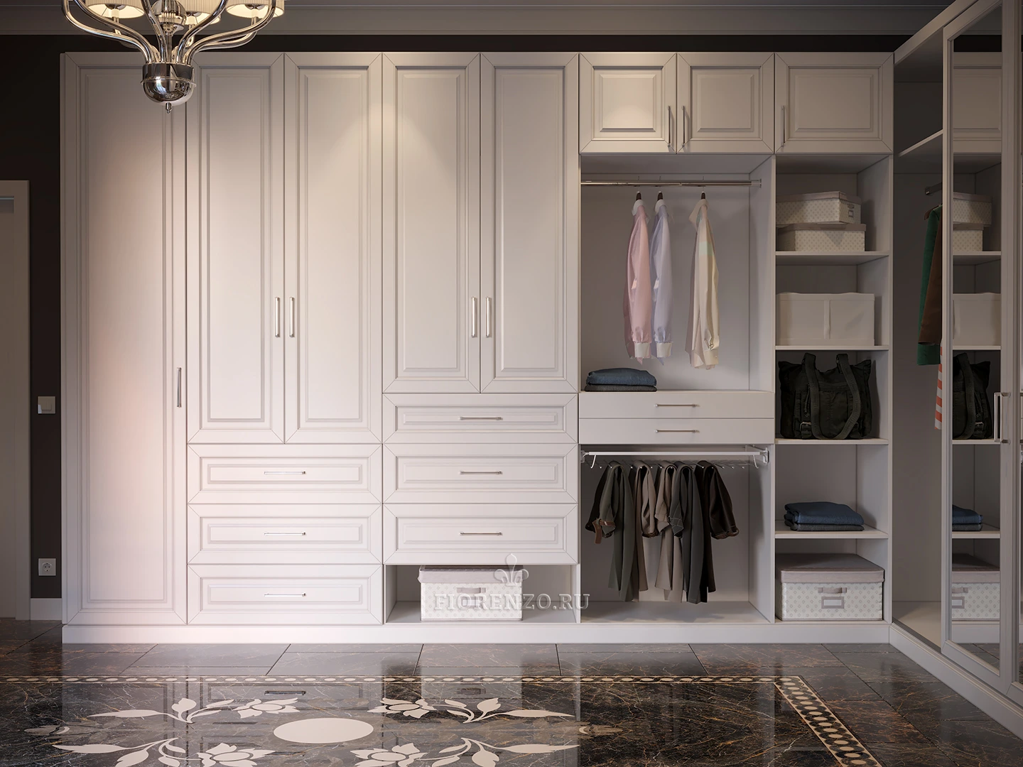 Специалисты компании «Fiorenzo Мебель» спроектировали и реализовали большую гардеробную «Квадро» в загородном доме под заказ. Комната для хранения вещей и одежды просторная, поэтому для оформления был использован традиционный классический стиль и светлые оттенки, которые гармонично сочетаются с отделкой пола, стен и потолка. Дизайн продуман, конструкция реализована с учетом требований всех членов семьи заказчика, мебель практичная и эргономичная. При создании проекта применялось компьютерное моделирование в формате 3D, которое позволило проработать конструкцию и представить ее визуально в интерьере. Можно разработать похожую гардеробную комнату под заказ и в ваше жилье, параметры которой будут адаптированы под его особенности.