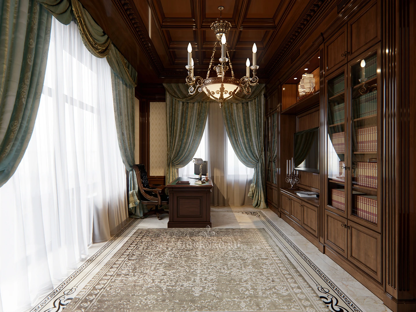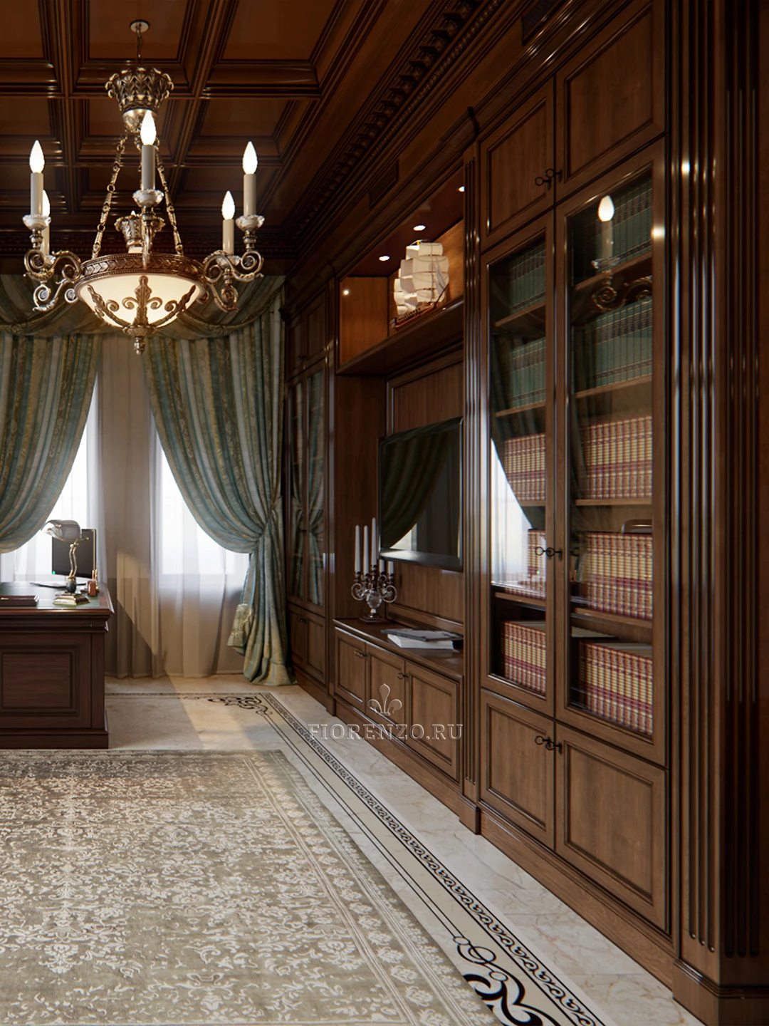 Кабинет из дерева под заказ сделан в едином стиле с отделкой комнаты, поэтому смотрится гармонично и очень привлекательно. Мебель украшена резными карнизами и пилястрами, фасады имеют декоративные филенки. Наши дизайнеры могут разработать подобный проект специально для вашего помещения, учитывая его габариты и стиль оформления.