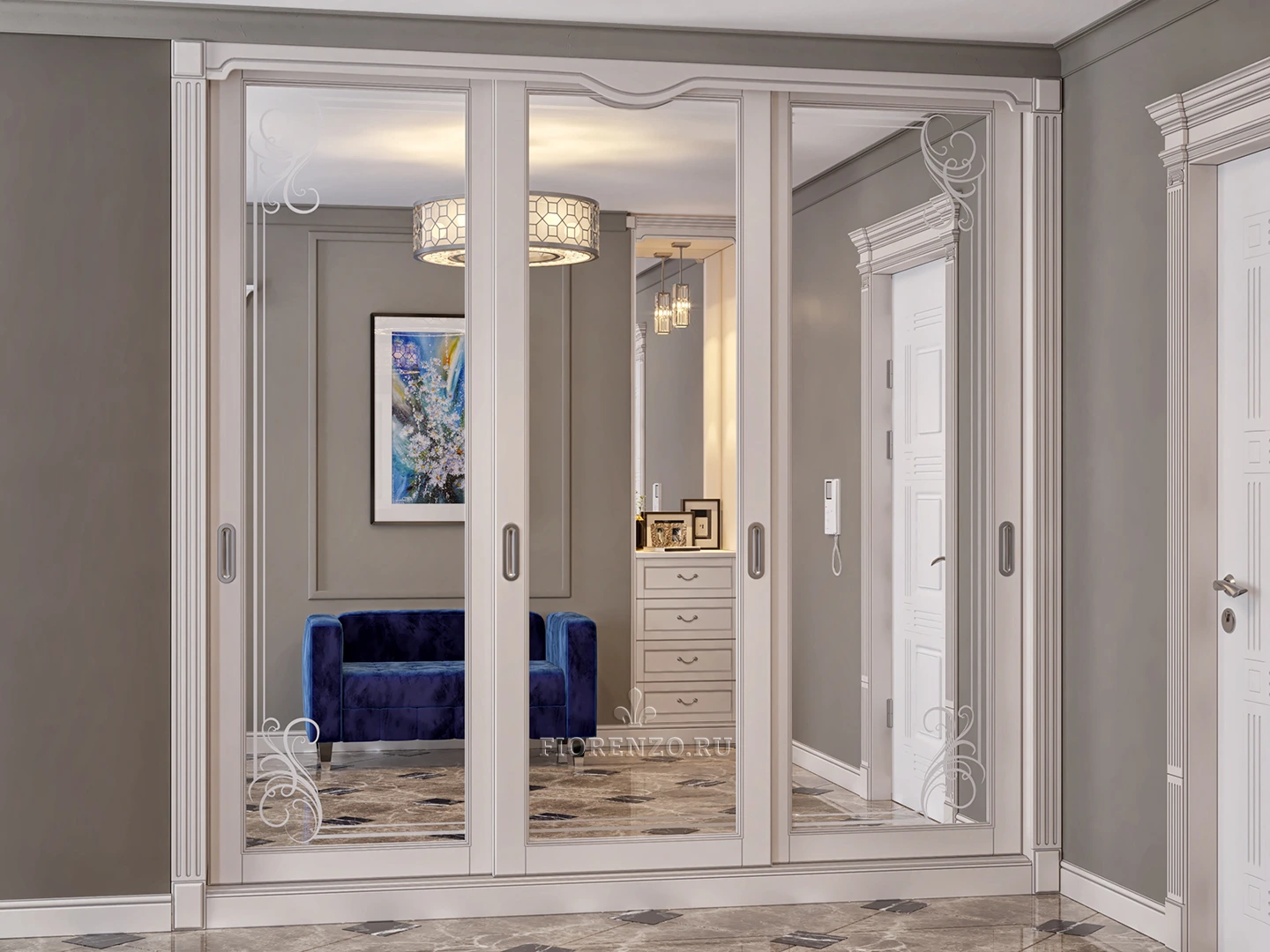 Шкаф-купе «Триас» идеально вписывается в прихожую, так как вмонтирован в специально подготовленную для этого нишу. Встроенная модель с огромными зеркальными фасадами преобразила интерьер помещения до неузнаваемости, сделала его визуально более просторным и сглаженным. Классический стиль мебели идеально сочетается с обстановкой в комнате, делает её одновременно строгой, комфортной и уютной.