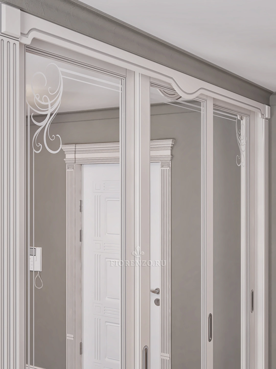 Фасадная часть, карнизы и декоративные накладки изготовлены из крашеного МДФ по палитре RAL. Внутренние детали шкафа сделаны из немецкого ЛДСП Egger. Зеркала на раздвижных дверцах имеют декоративное пескоструйное напыление, а фурнитура на выдвижных ящиках от известного европейского производителя компании HARN.