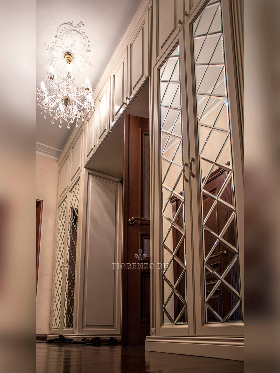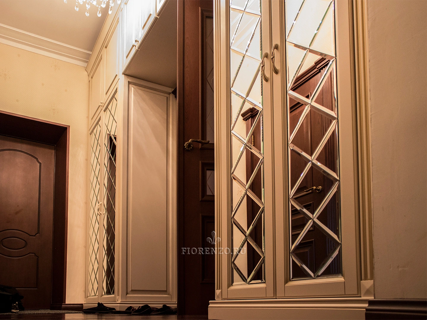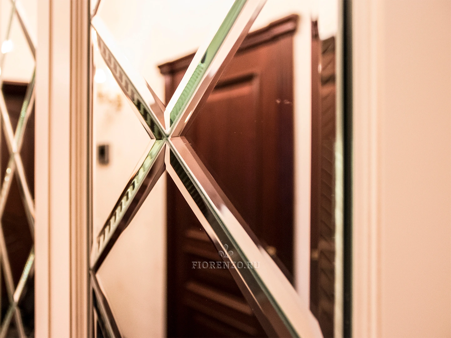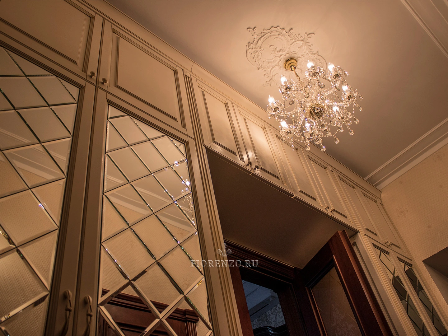 Дизайнеры компании «Фиорензо Мебель» создали уникальный проект зеркального шкафа с фацетами «Манс», который одновременно является нишей для прохода в другую комнату загородного дома. Мебель отличается отменным функционалом, имеет привлекательный внешний вид и оригинальный дизайн. Особого шарма и солидности ей придают декоративные фацеты на зеркальных дверцах, карнизы и цоколи, филенчатые глухие фасады и «золотое» патирование – искусственное состаривание поверхности изделия. Наши специалисты способны разработать похожий проект по вашим размерам, который идеально станет в любое помещение, независимо от его габаритов и конфигурации. Можно использовать разные расцветки и дизайнерские приемы, подстроить комплектацию под собственные требования.