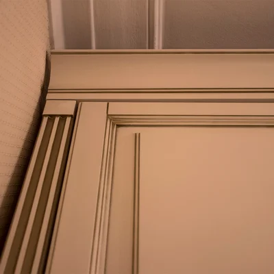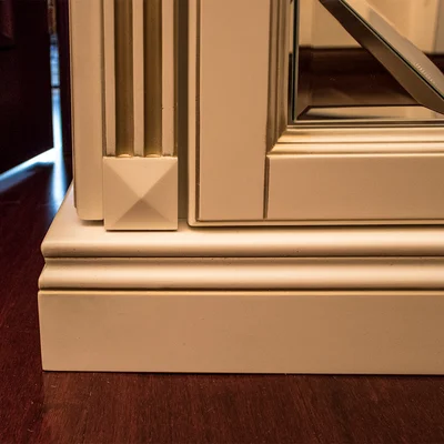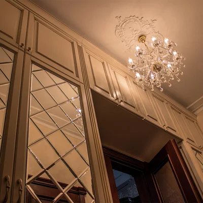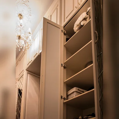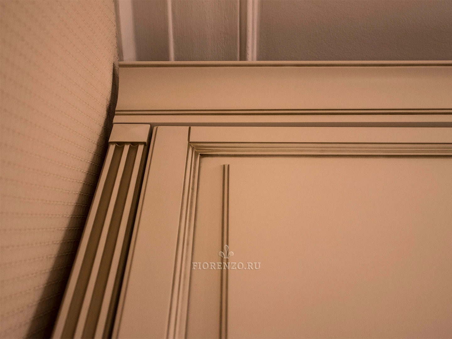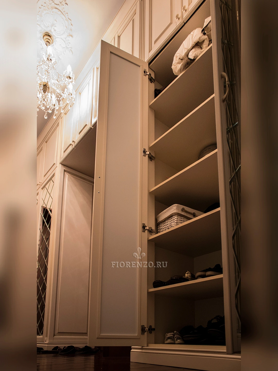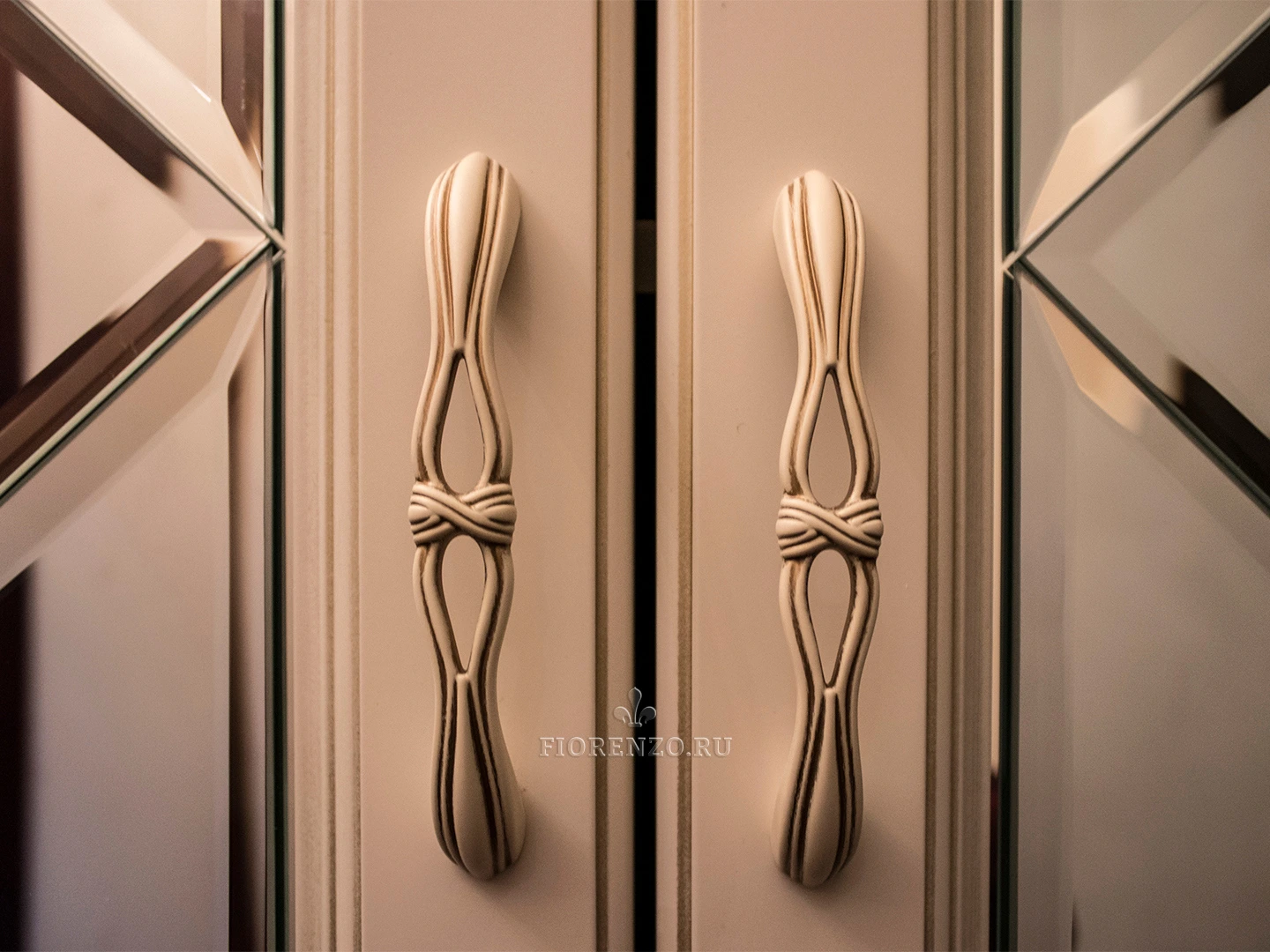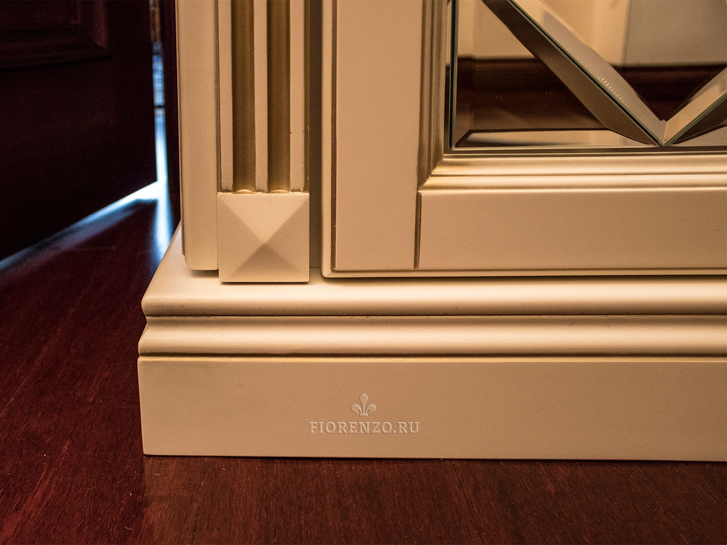 Дизайнеры компании «Фиорензо Мебель» создали уникальный проект зеркального шкафа с фацетами «Манс», который одновременно является нишей для прохода в другую комнату загородного дома. Мебель отличается отменным функционалом, имеет привлекательный внешний вид и оригинальный дизайн. Особого шарма и солидности ей придают декоративные фацеты на зеркальных дверцах, карнизы и цоколи, филенчатые глухие фасады и «золотое» патирование – искусственное состаривание поверхности изделия. Наши специалисты способны разработать похожий проект по вашим размерам, который идеально станет в любое помещение, независимо от его габаритов и конфигурации. Можно использовать разные расцветки и дизайнерские приемы, подстроить комплектацию под собственные требования.