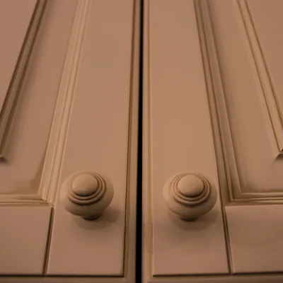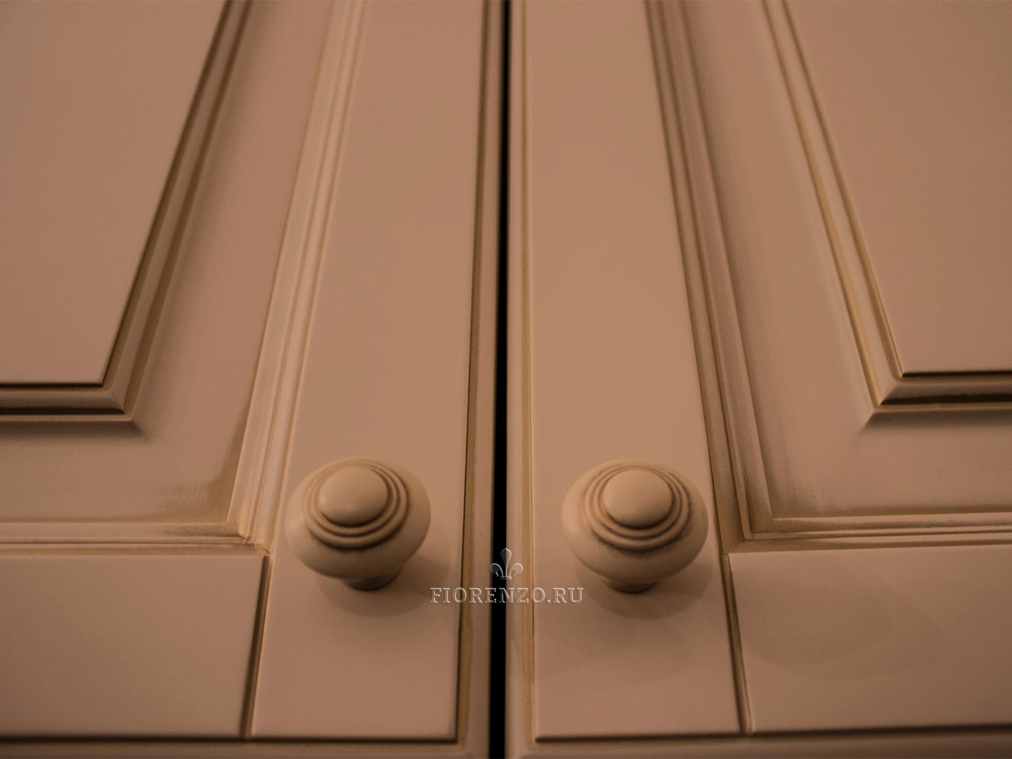 Корпус и внутренности сделаны из ЛДСП австрийского производства «Эггер». Фасады – из крашеного акриловым составом MDF с эффектом патирования. Петли на дверцах австрийские с доводчиками от производителя Blum.