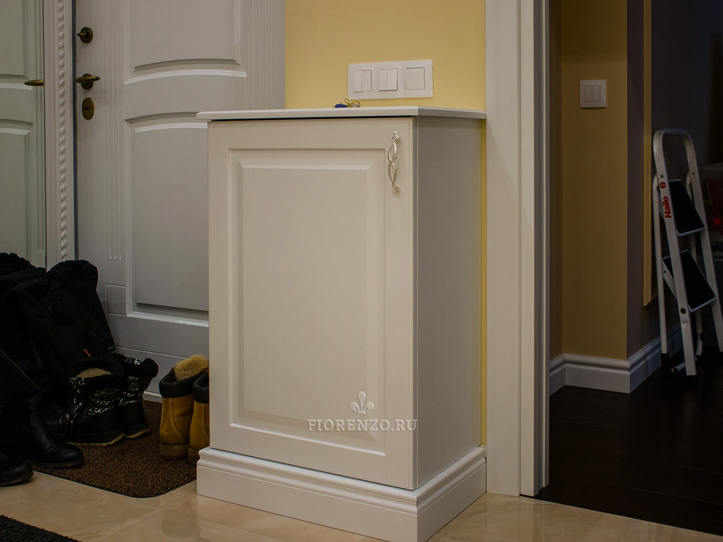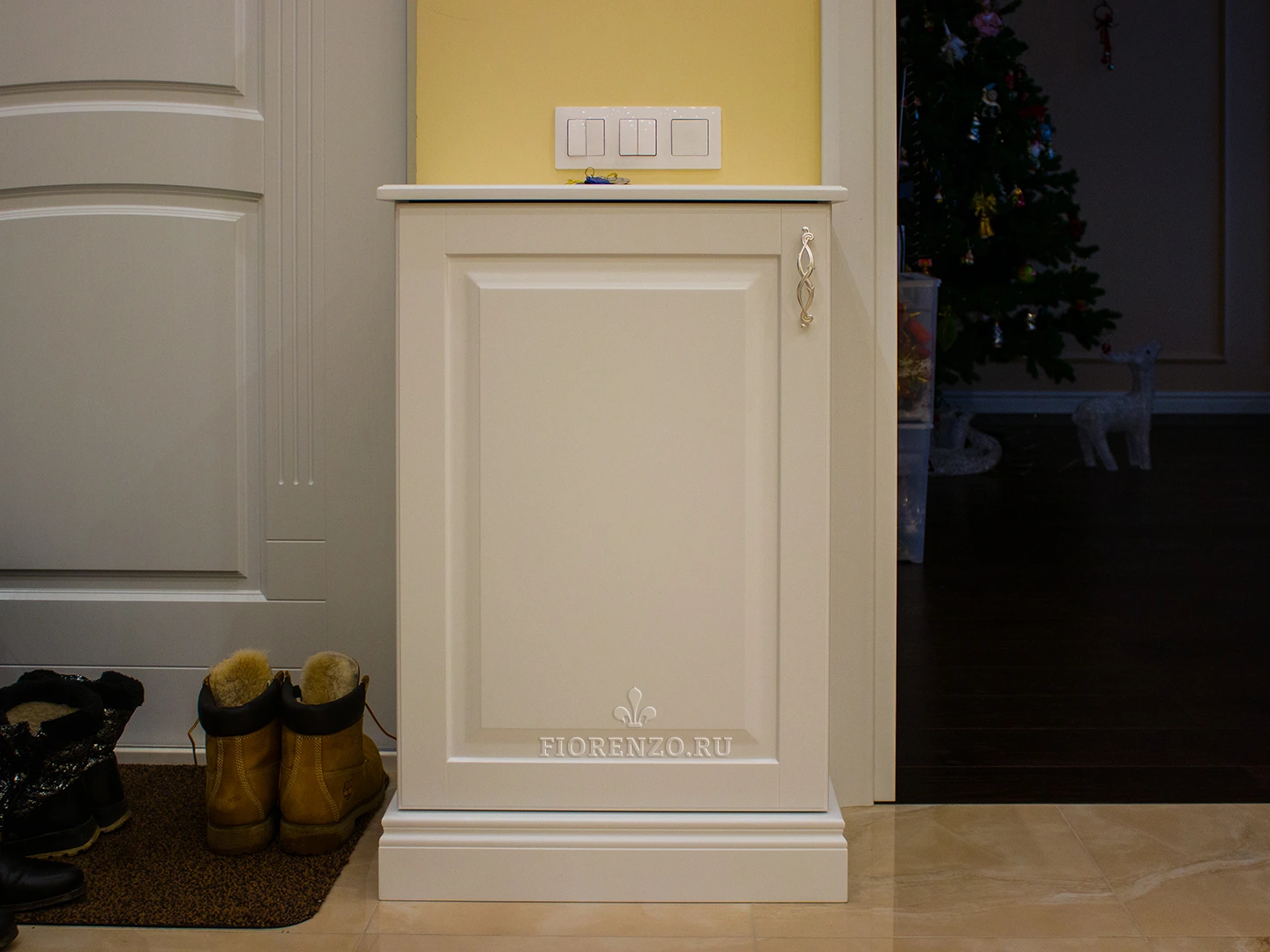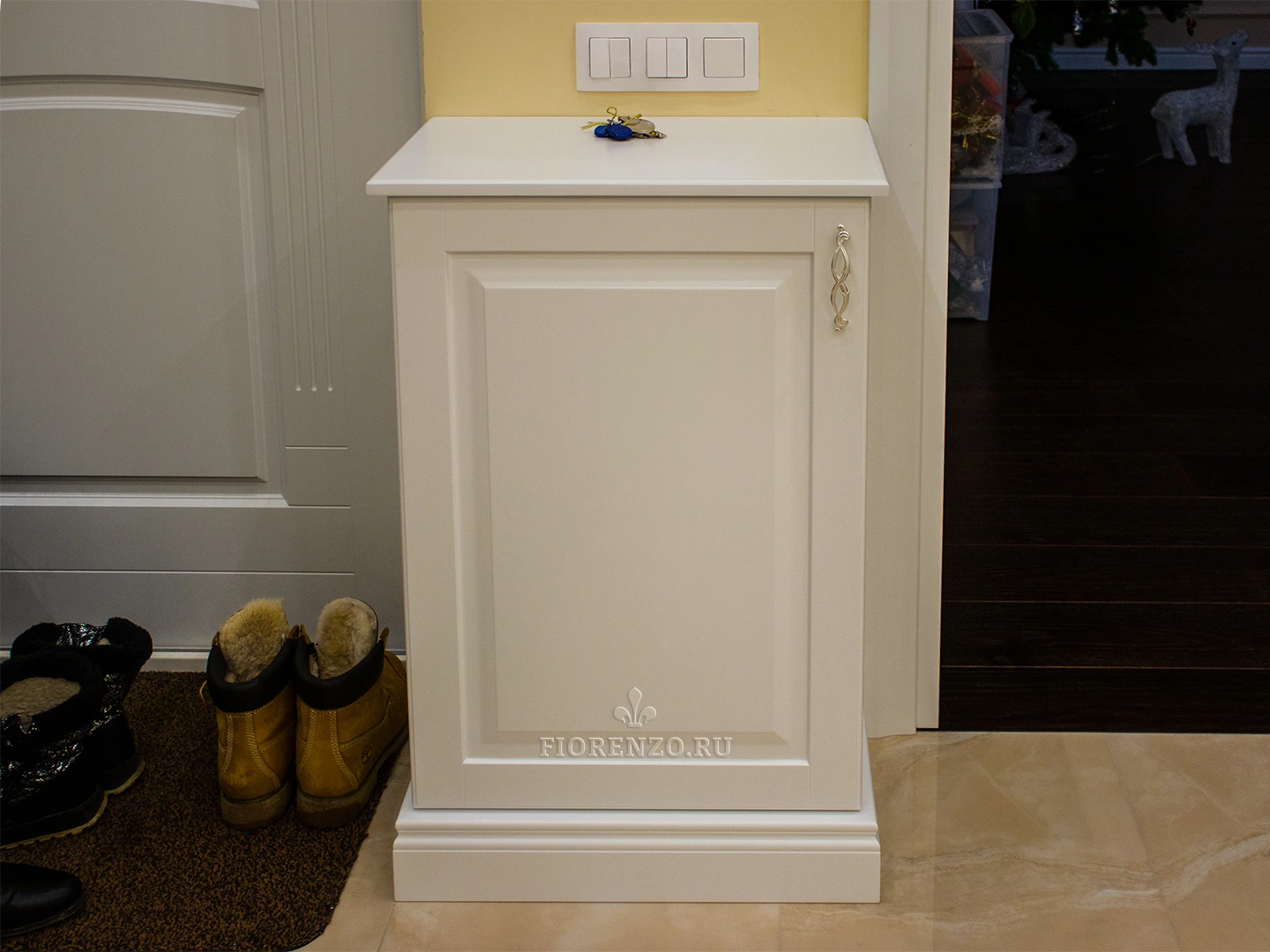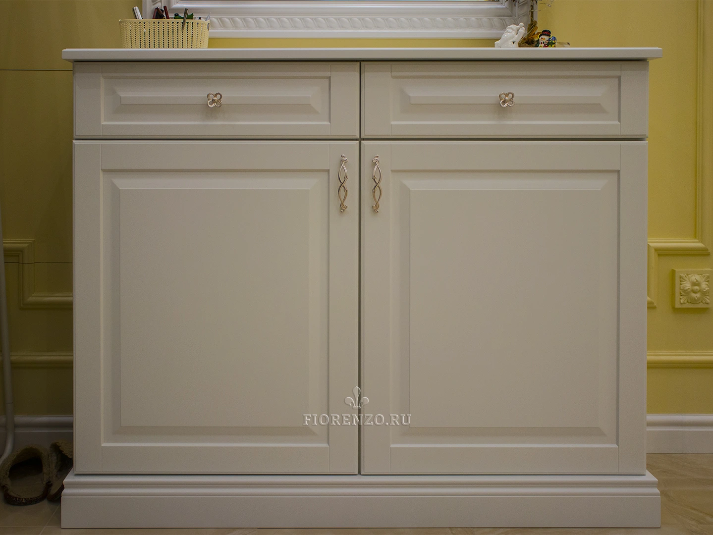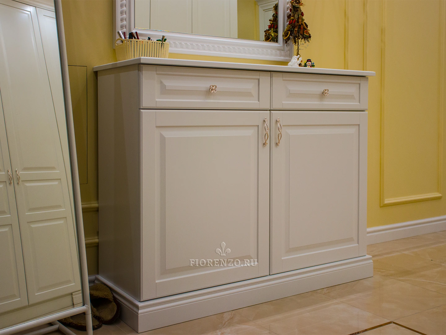 Мебельная компания «Fiorenzo Мебель» спроектировала и изготовила комод «Нерха» с зеркалом и тумбу в прихожую под заказ. Несмотря на всю простоту изделий, они полностью удовлетворяют требования клиента, идеально вписываются в интерьер комнаты, удобны в эксплуатации, практичны и эргономичны. Традиционный классический стиль идеально подходит под отделку комнаты, для декора использовали филенки на фасадах, оригинальный орнамент на окантовке зеркала, ручки «под золото».