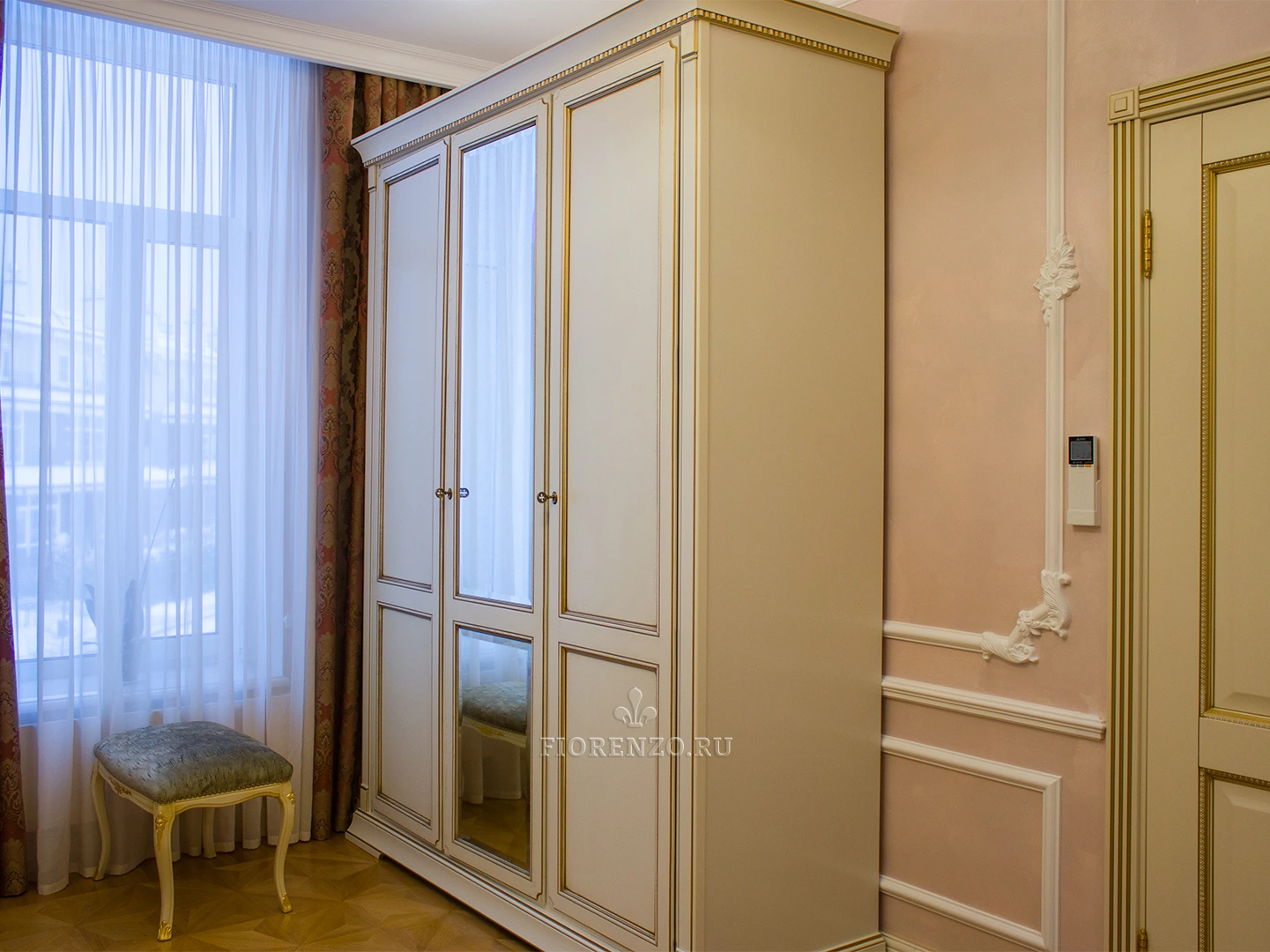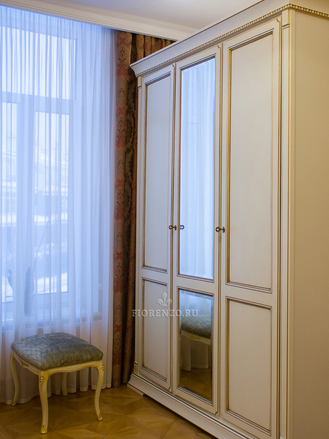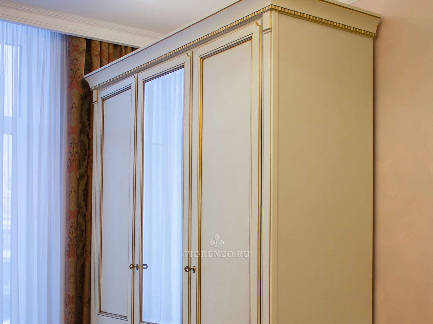 Предлагаем Вашему вниманию классический зеркальный шкаф «Беллуно» в спальню в цвете слоновая кость с золотым патинированием. Шкаф отдельно стоящий, подойдет как для спальни, так и для прихожей. Выполнен в классическом стиле, с фрезерованными фасадами. Декорирован красивым карнизом и цоколем по периметру.