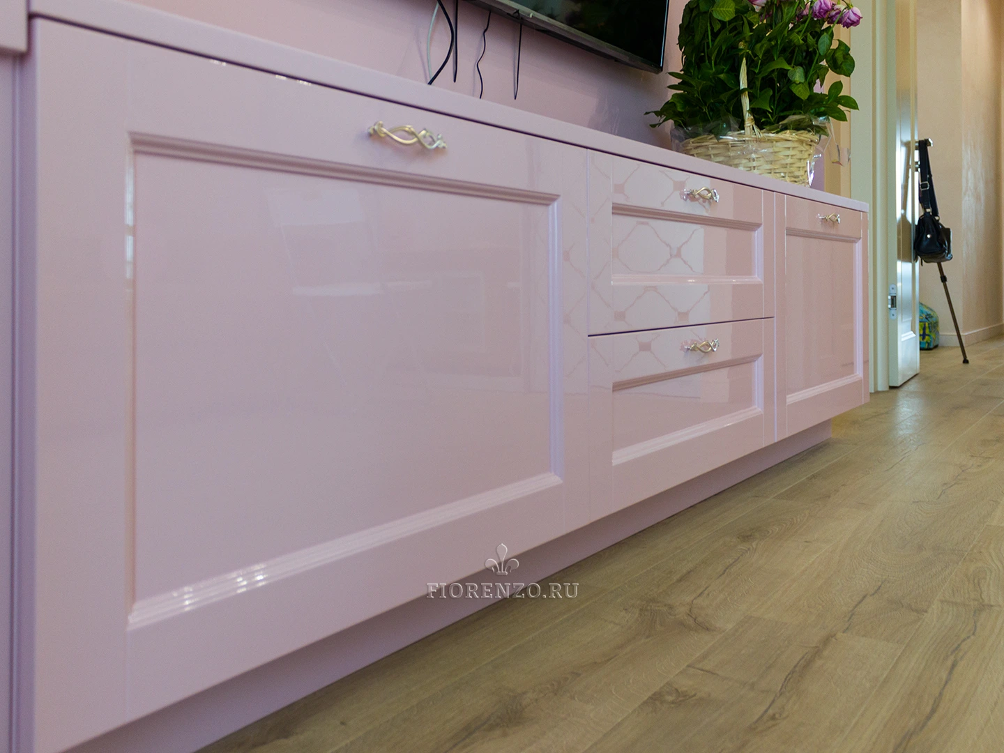 Глянцевый комод под ТВ и туалетный столик в детскую девочки изготовлены под заказ по индивидуальному проекту, в котором учтены пожелания ребенка и его родителей. Мебель «Корс» выполнена в современном стиле, смотрится ярко и привлекательно, гармонично сочетается с отделкой помещения. Фасады с прямой филенкой, ручки имеют необычную форму, конструкция продумана до мельчайших деталей и полностью удовлетворяет пожелания заказчика.