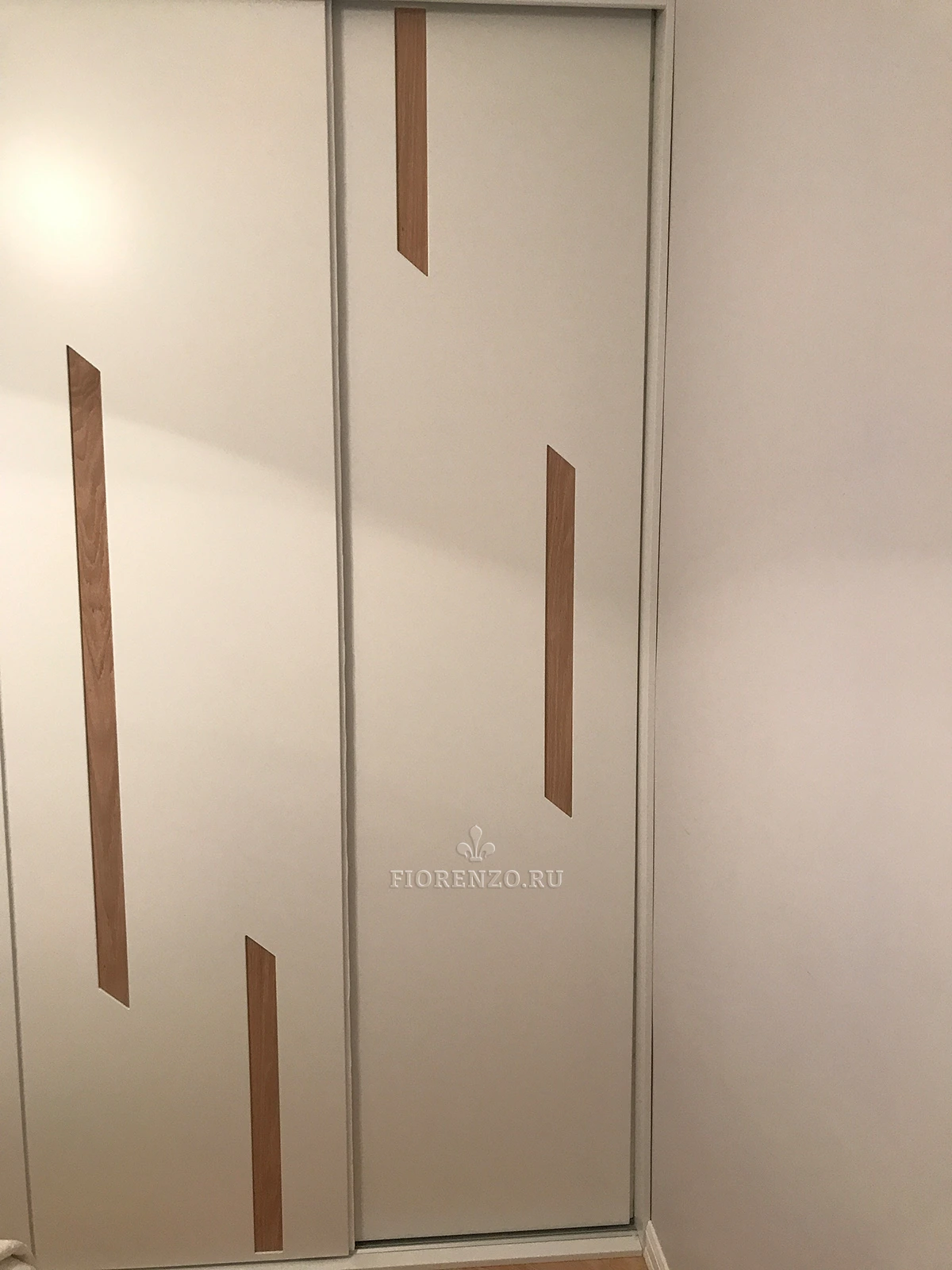 Отличное решение для шкафа в спальню, современный дизайн с вставками под дерево. И места занимает не много и пользоваться удобно, отличный вариант для небольшой комнаты или ниши.