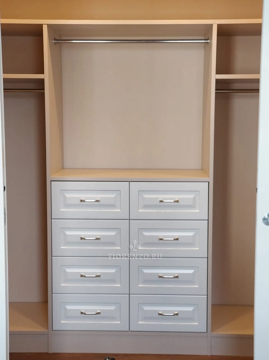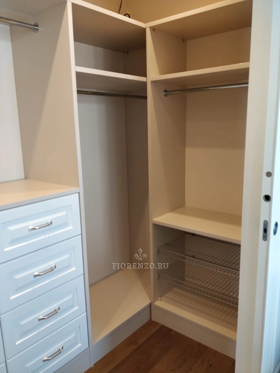 «Фиорензо» предлагает заказать качественную, красивую, стильную и современную мебель по индивидуальным замерам. П-образная гардеробная комната «Акирас» идеально подойдет для установки в отдельном небольшом помещении, можно ее разместить за перегородкой или ширмой в углу комнаты.