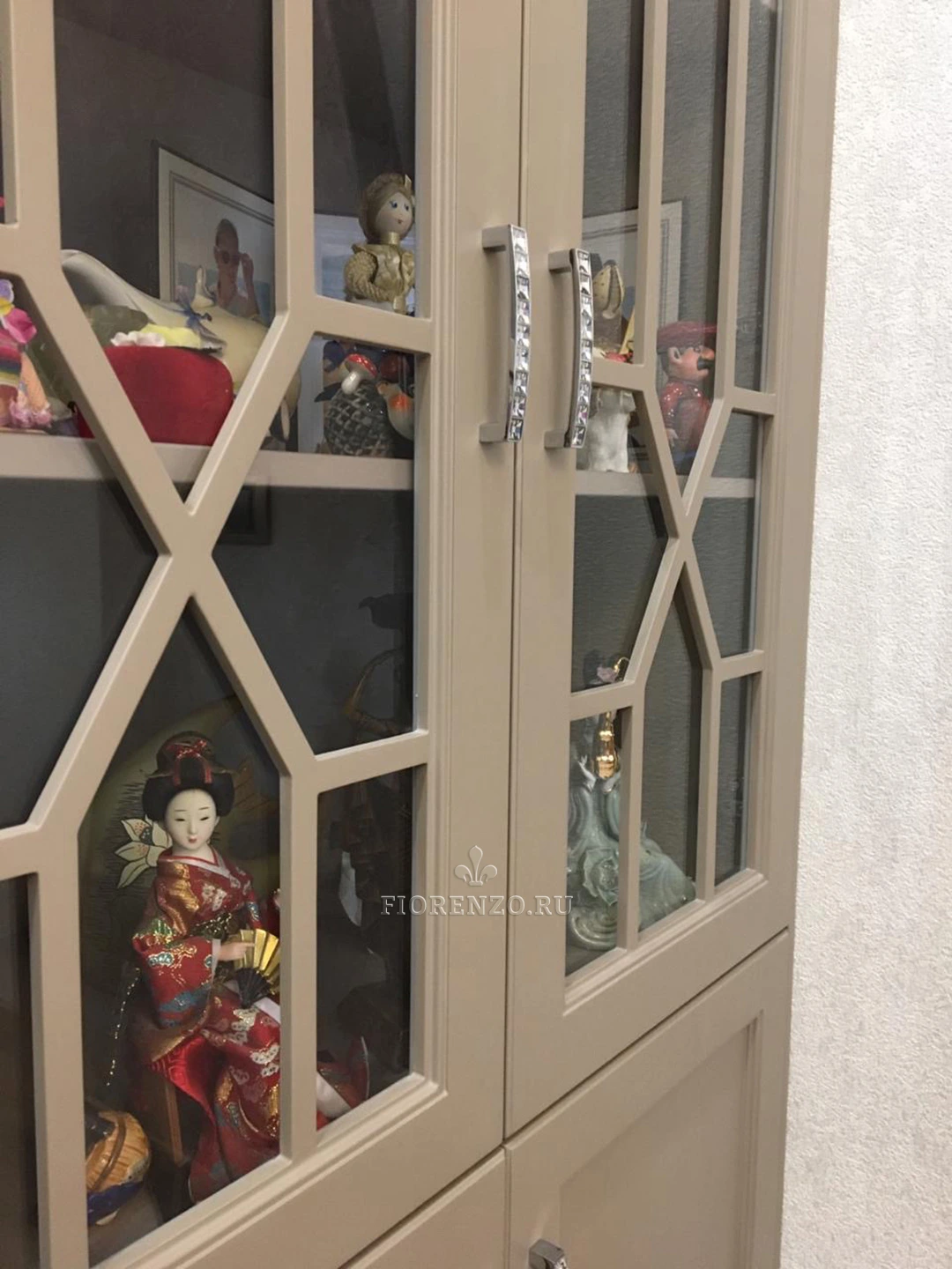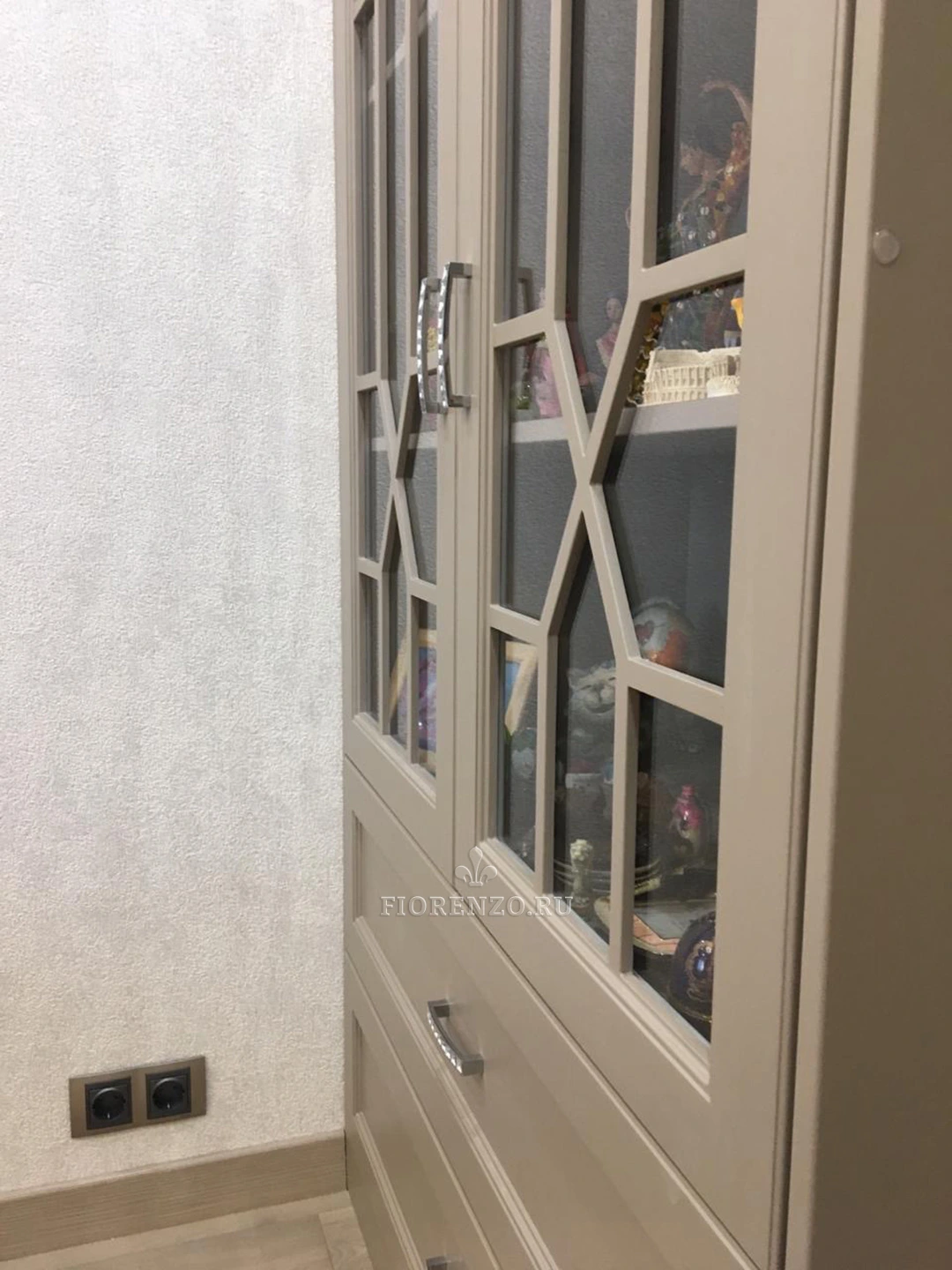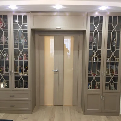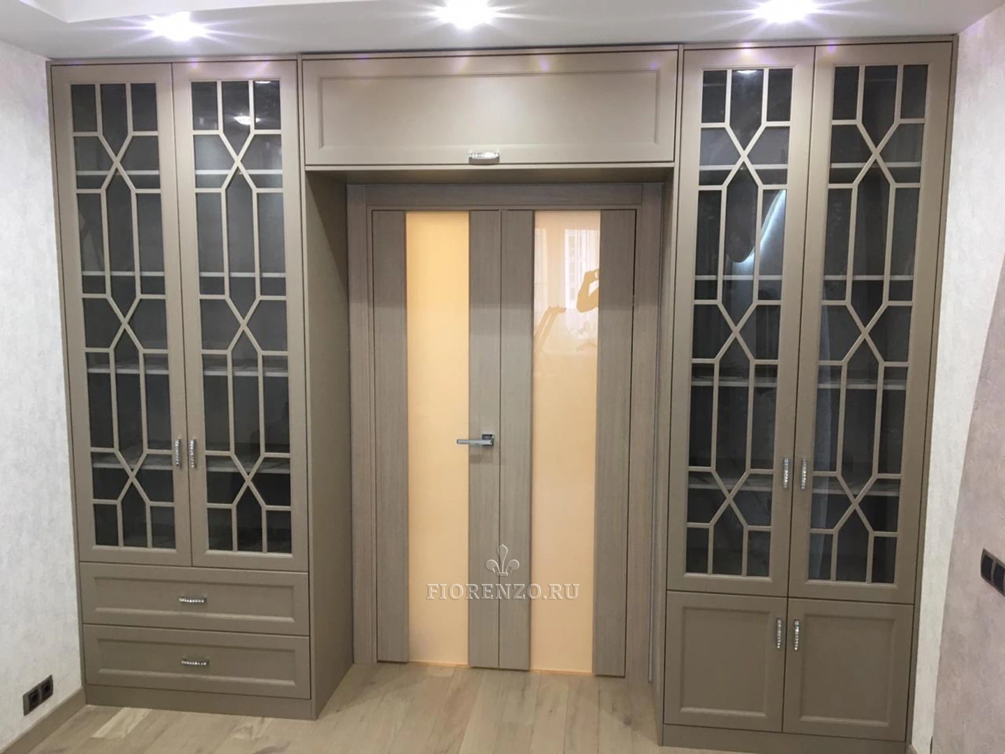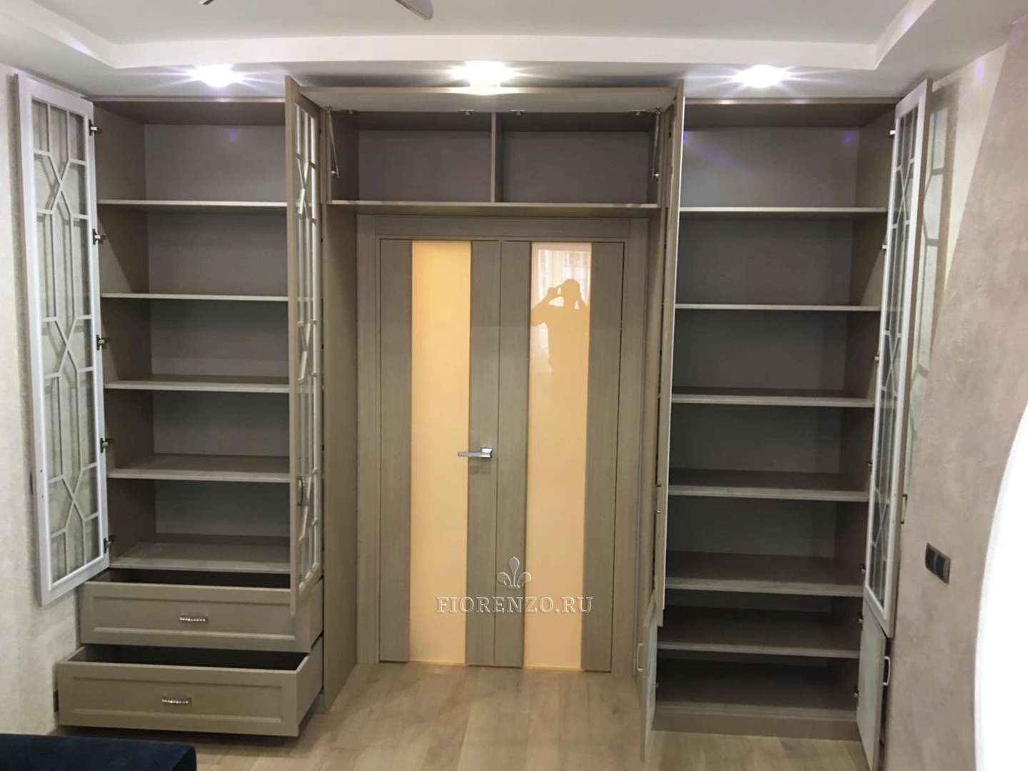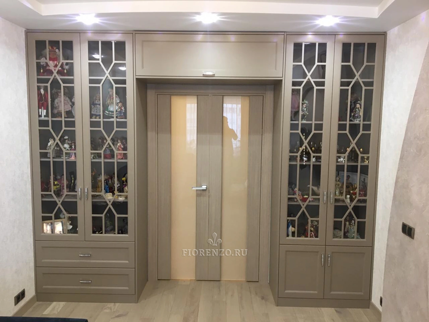 Мастерская «Фиорензо» предлагает вам изготовить шкаф в гостиную по индивидуальным замерам. Применяем в работе импортное сырье и фурнитуру, что гарантирует долговечность, привлекательный вид готовых конструкций. П-образный шкаф «Савона» с декоративными фасадами устанавливается по всю стену, поможет обыграть область межкомнатных дверей. По бокам от дверей устанавливается пара одинаковых шкафов с остекленными фасадами, над предусмотрена подвесная антресоль.