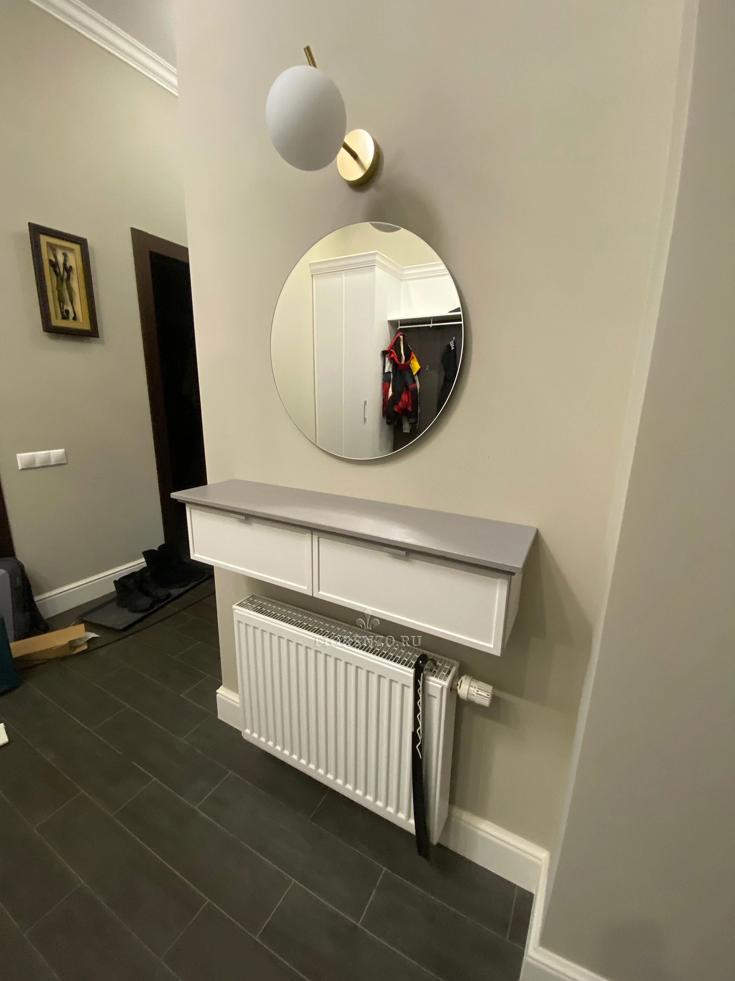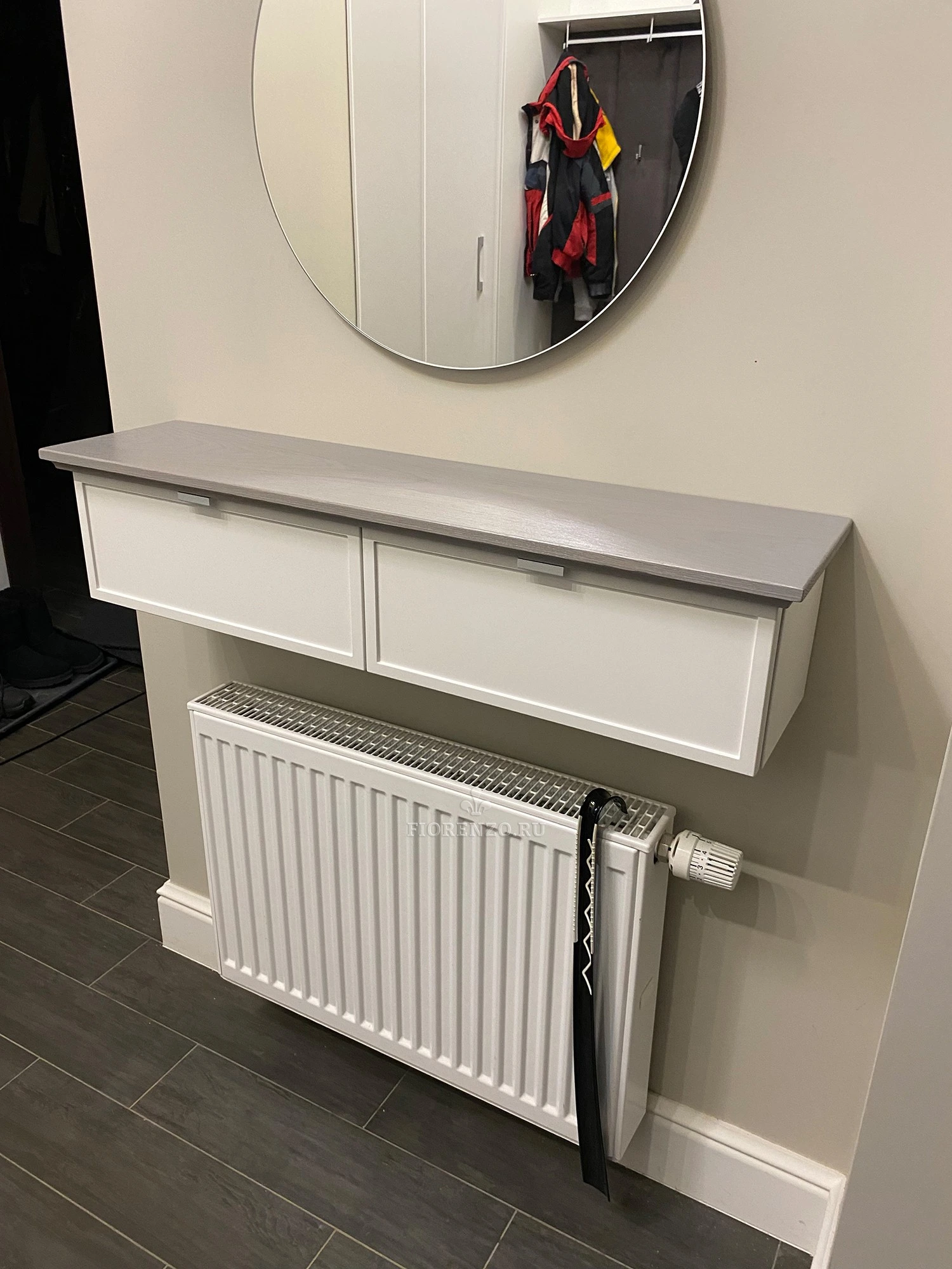 Настенная тумба с двумя откидными ящиками — компактное и функциональное решение для прихожей. Установлена над радиатором, не перегружает пространство и сохраняет лёгкость интерьера.