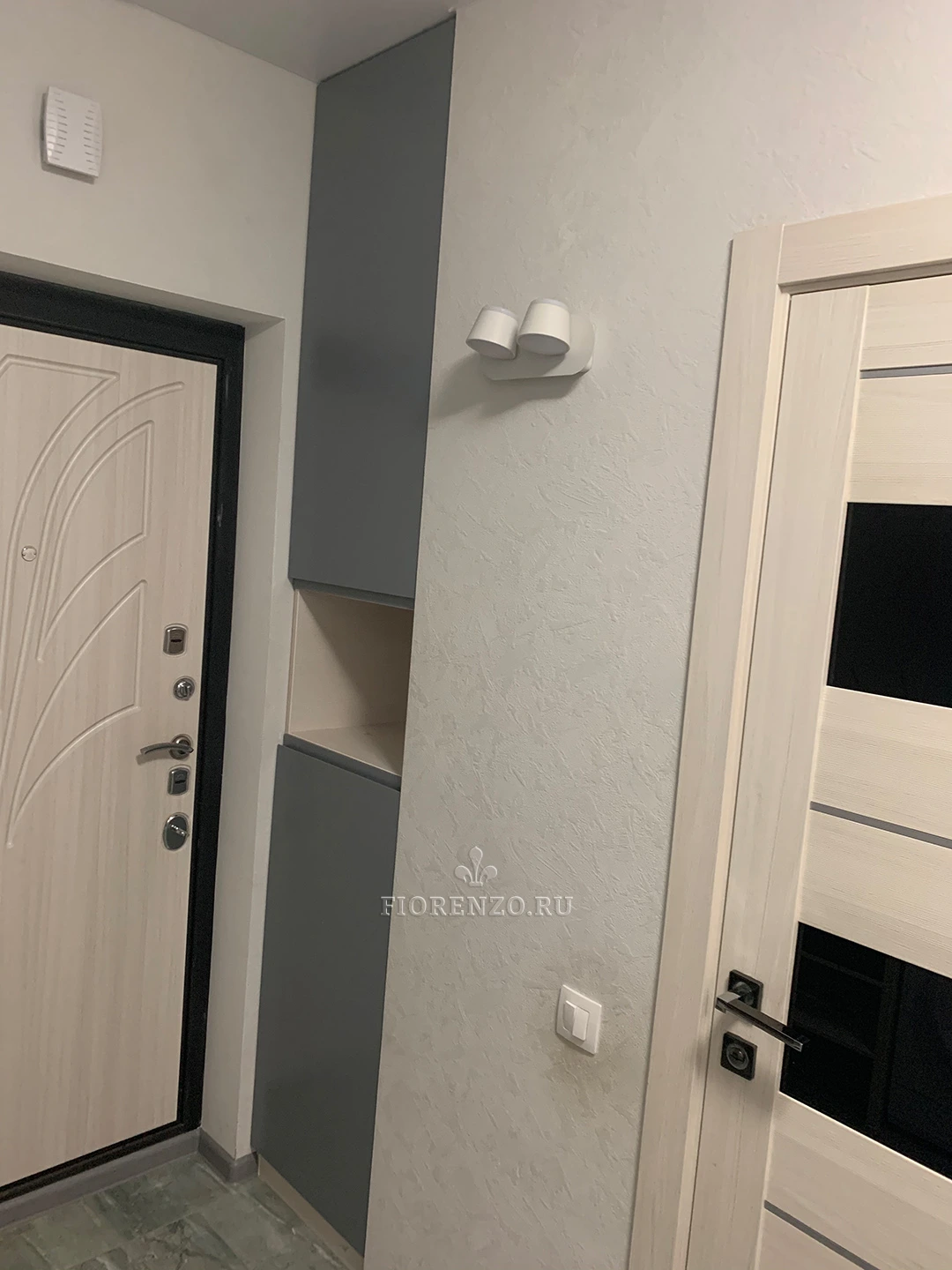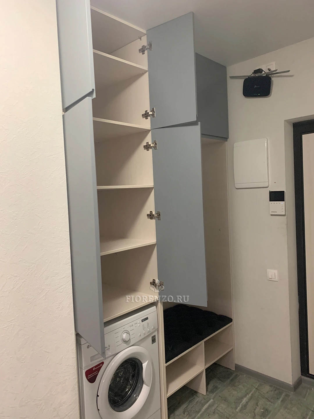Мастерская «Фиорензо» готова изготовить проект любой сложности по индивидуальным замерам для вашего помещения. Это позволит создать гармоничную, эффектную обстановку, если среди готовой мебели не нашлось нужного варианта. Прихожая из МДФ на заказ «Ренн» представляет собой гарнитур продуманной формы, с нужным заказчику наполнением. Этот комплект предусмотрен под установку стиральной машины.