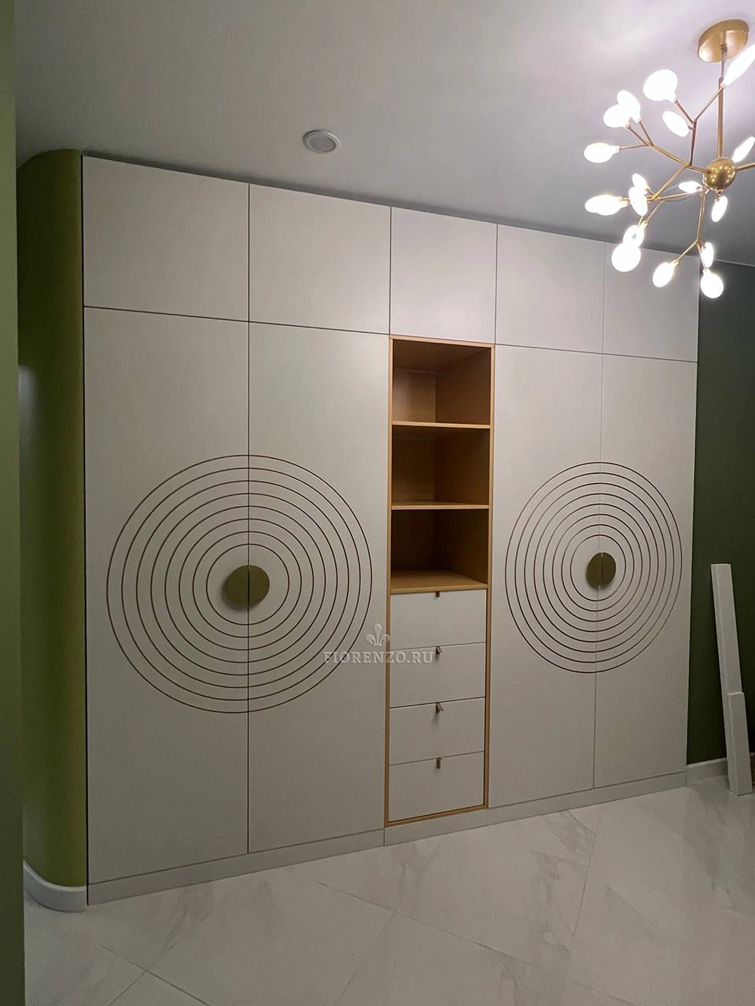 Встроенный шкаф "Santa" от Фиорензо — это гармония современного стиля и лаконичности форм. Чистые линии крашеного МДФ фасада с геометрической круговой фрезеровкой вокруг ручек создают не только эстетический вид, но и добавляют ощущение упорядоченности и пространства. Оттенок шкафа выбирается индивидуально и может быть адаптирован под любой интерьер прихожей.