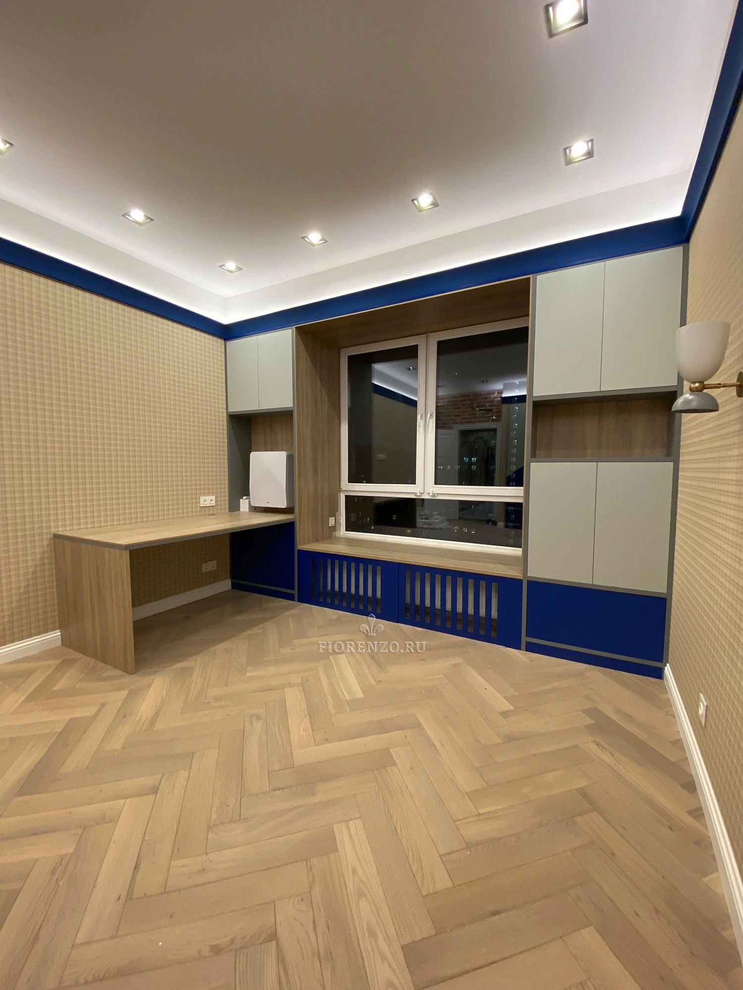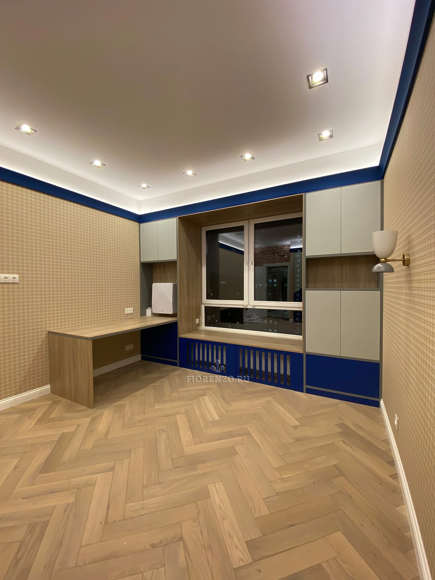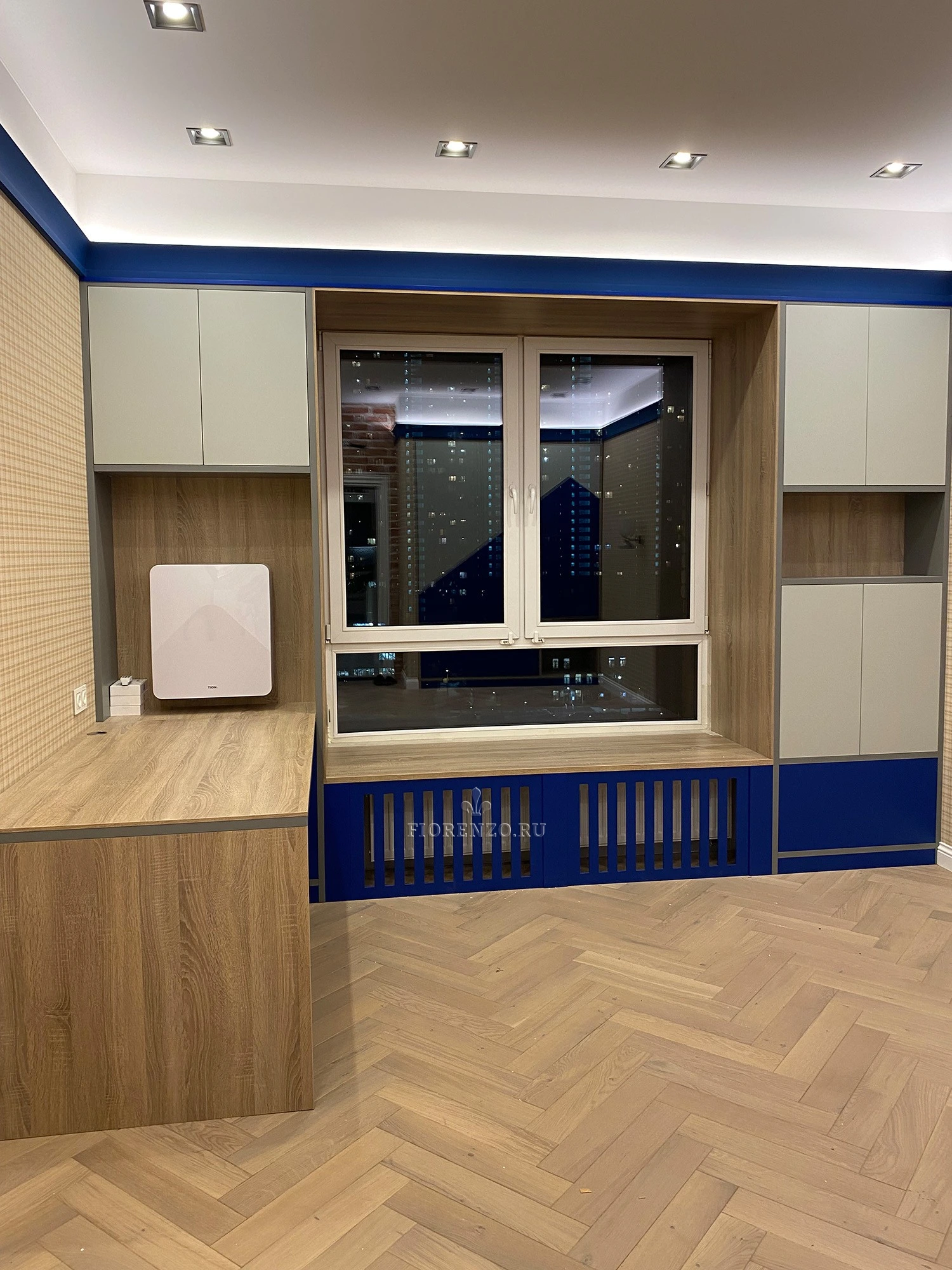 Рабочее место в детскую у окна — практичное и светлое решение. Стол, шкафчики и подоконная зона — всё для удобства ребёнка. Идеально для учёбы, творчества и хранения вещей.