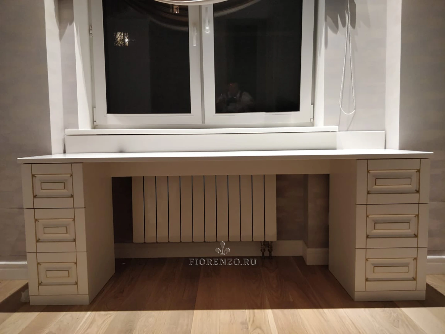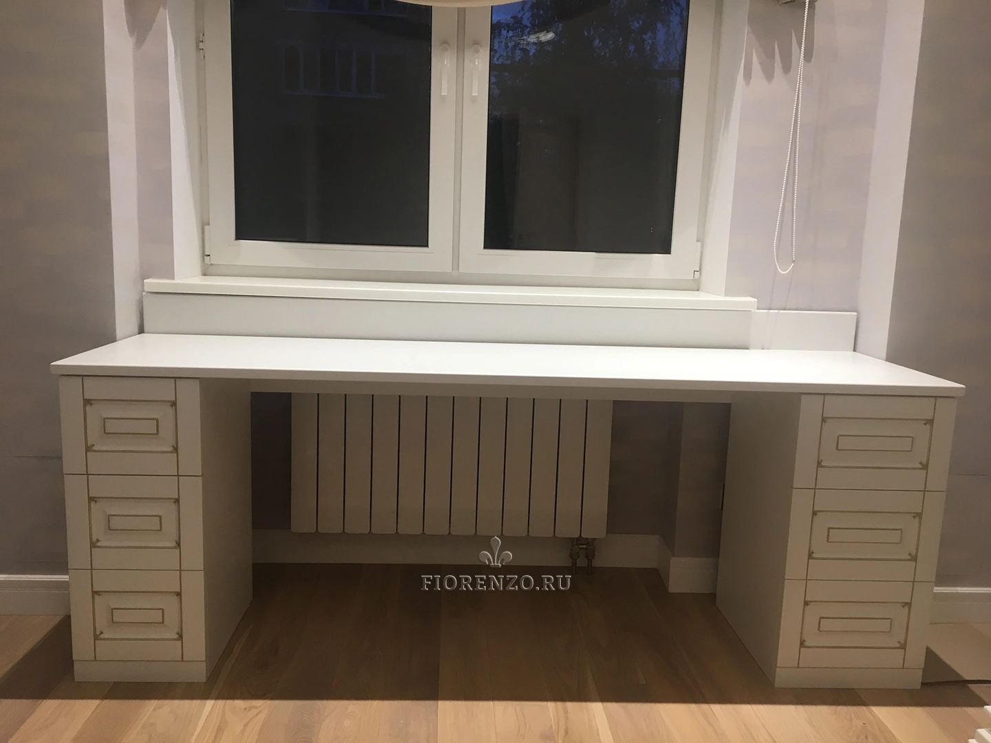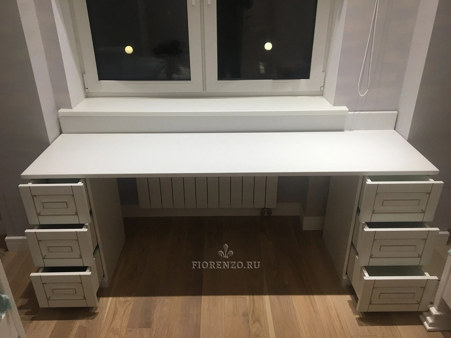 Мастерская «Фиорензо» работает по индивидуальным, типовым проектам, всегда предварительно делает замеры помещения заказчика. Выбирайте место, тип установки, цвет корпуса, наполнение. Рабочее место для детской «Поллино» позволит организовать учебную зону и место для творчества. Стол с двумя тумбами по бокам можно устанавливать у окна – получится интересная интерьерная композиция. Другой вариант размещения – у стены, в таком случае на стол можно будет установить полку.