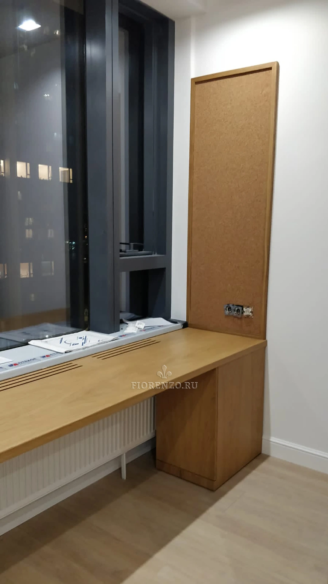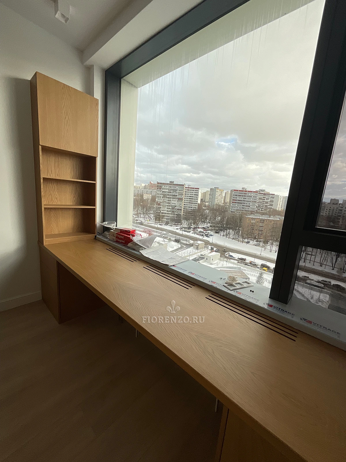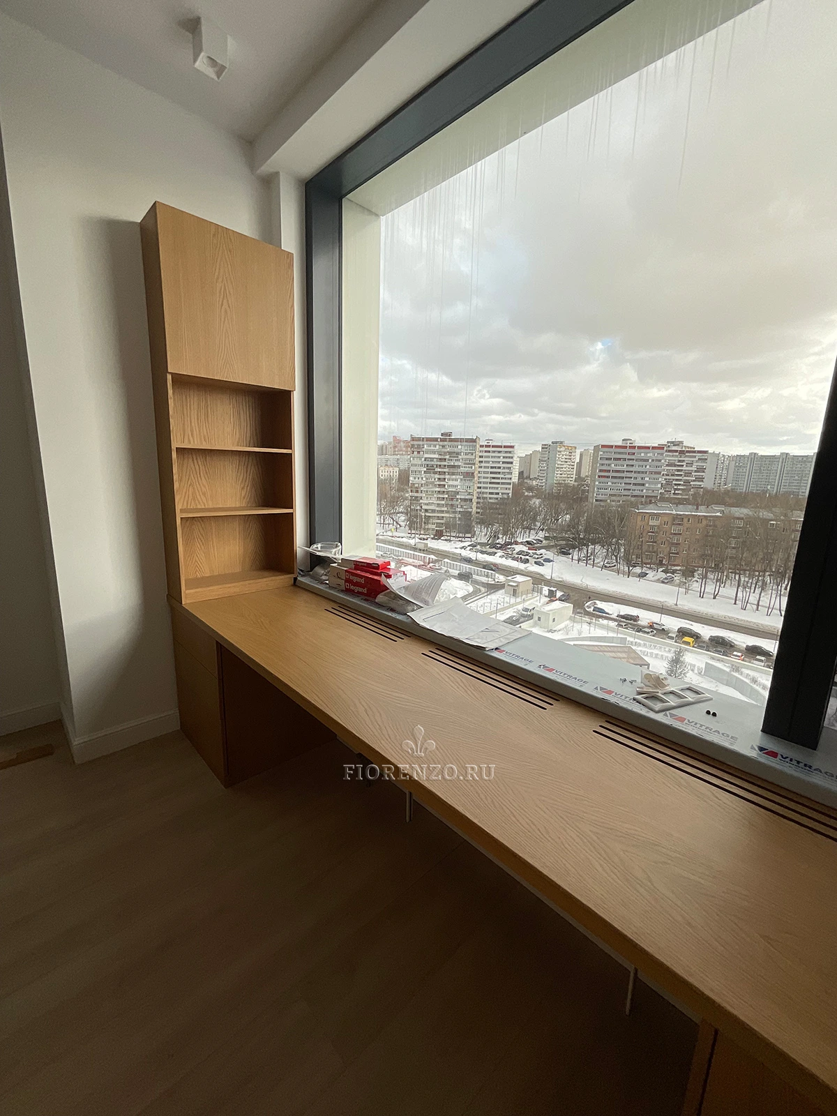 Рабочее место у окна в домашнем кабинете «Лифре» устанавливается вдоль стены, «обрамляет» проем. Оно состоит из узкого пенала, стола, напольных тумб. Особенности проекта: