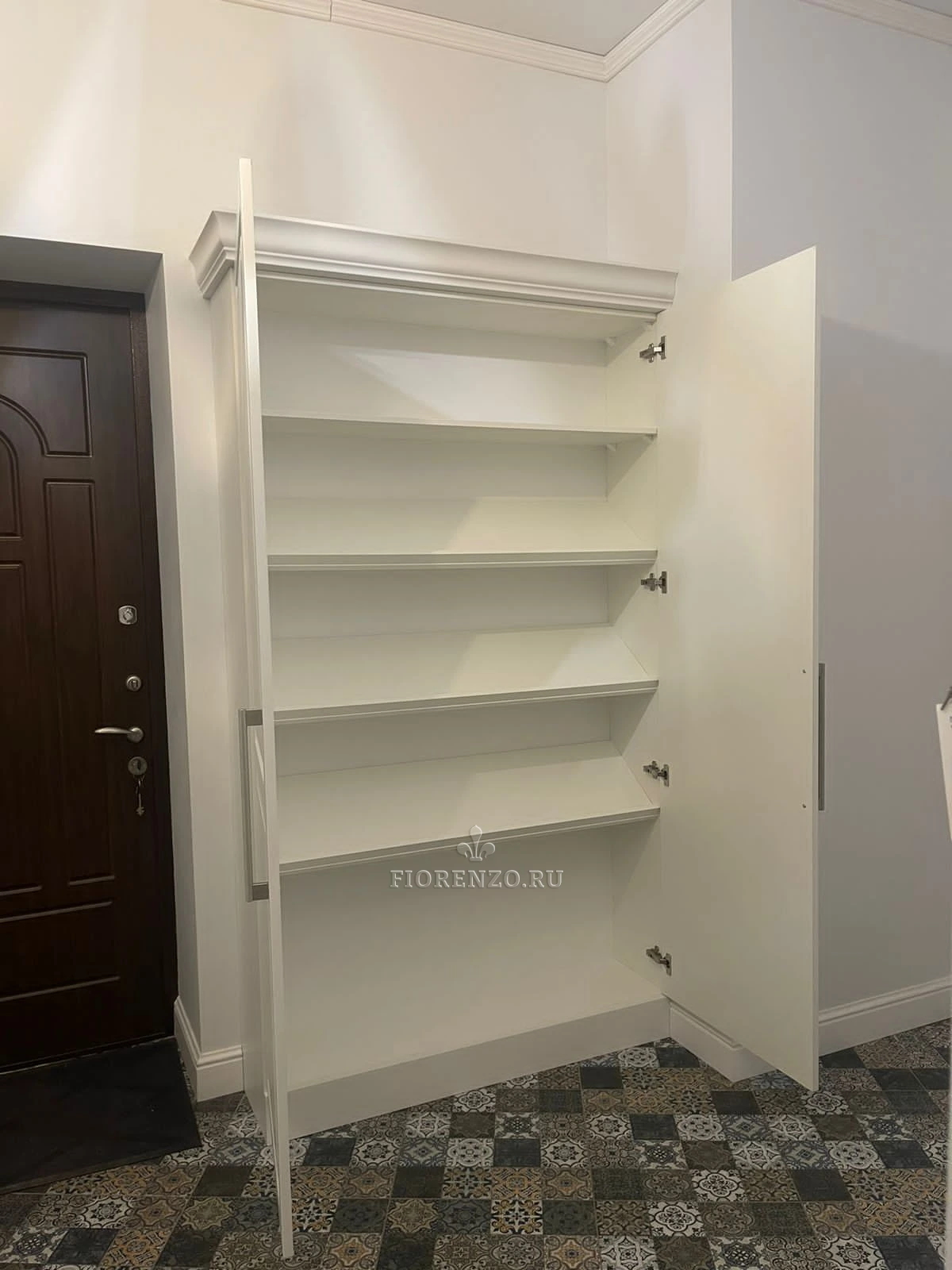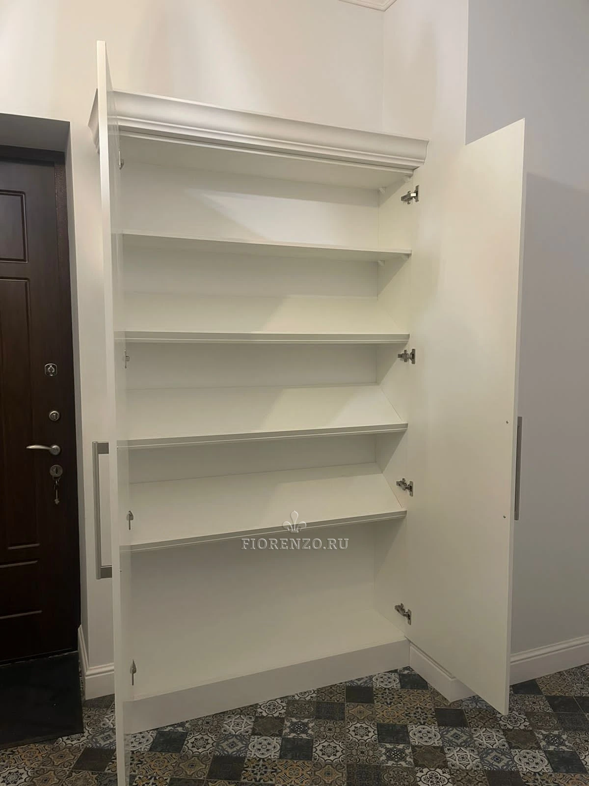 Элегантный распашной шкаф для прихожей, изготовлен на заказ в премиальном исполнении. Корпус и филёнчатые фасады — МДФ с эмалевым матовым покрытием, сверху декоративный карниз. Продуманная внутренняя планировка под одежду и обувь: полки и ящики, прочная штанга для верхней одежды.