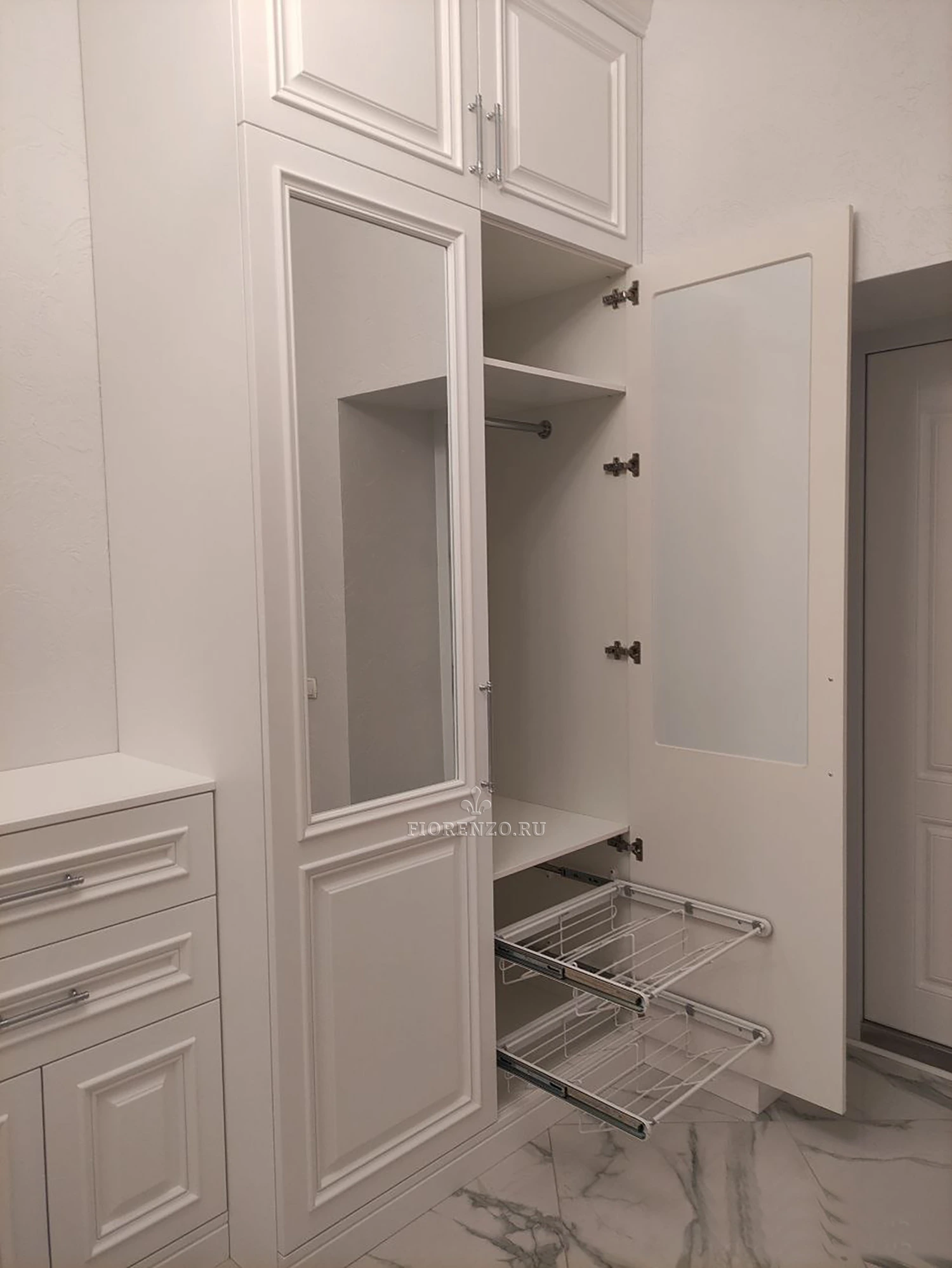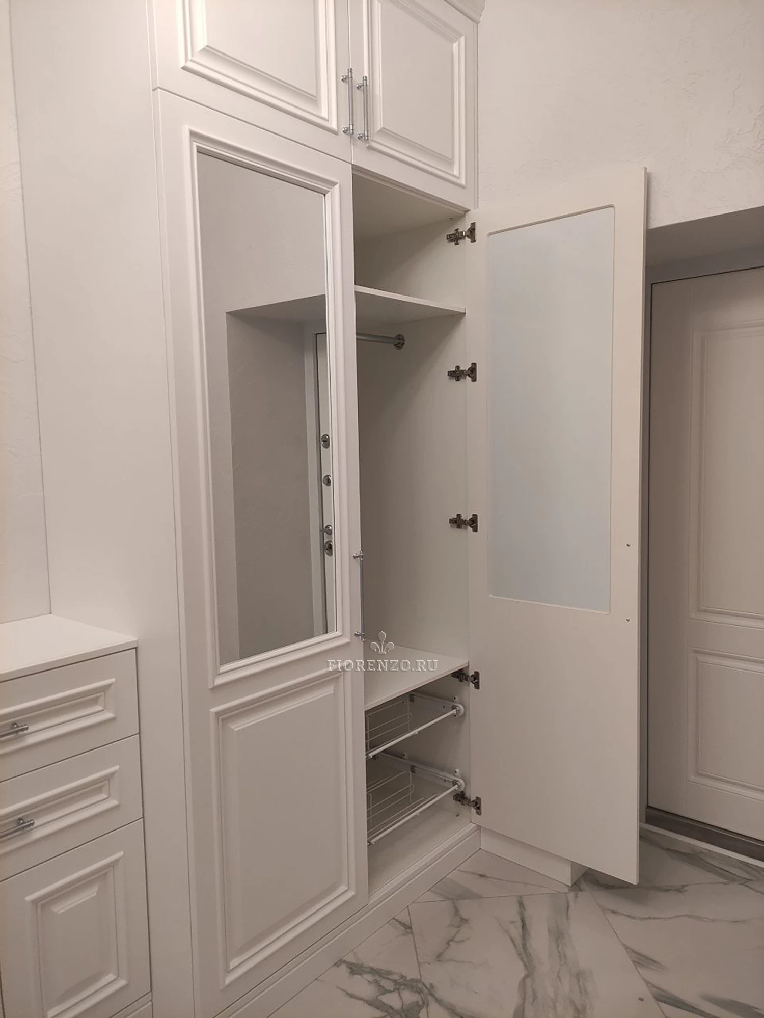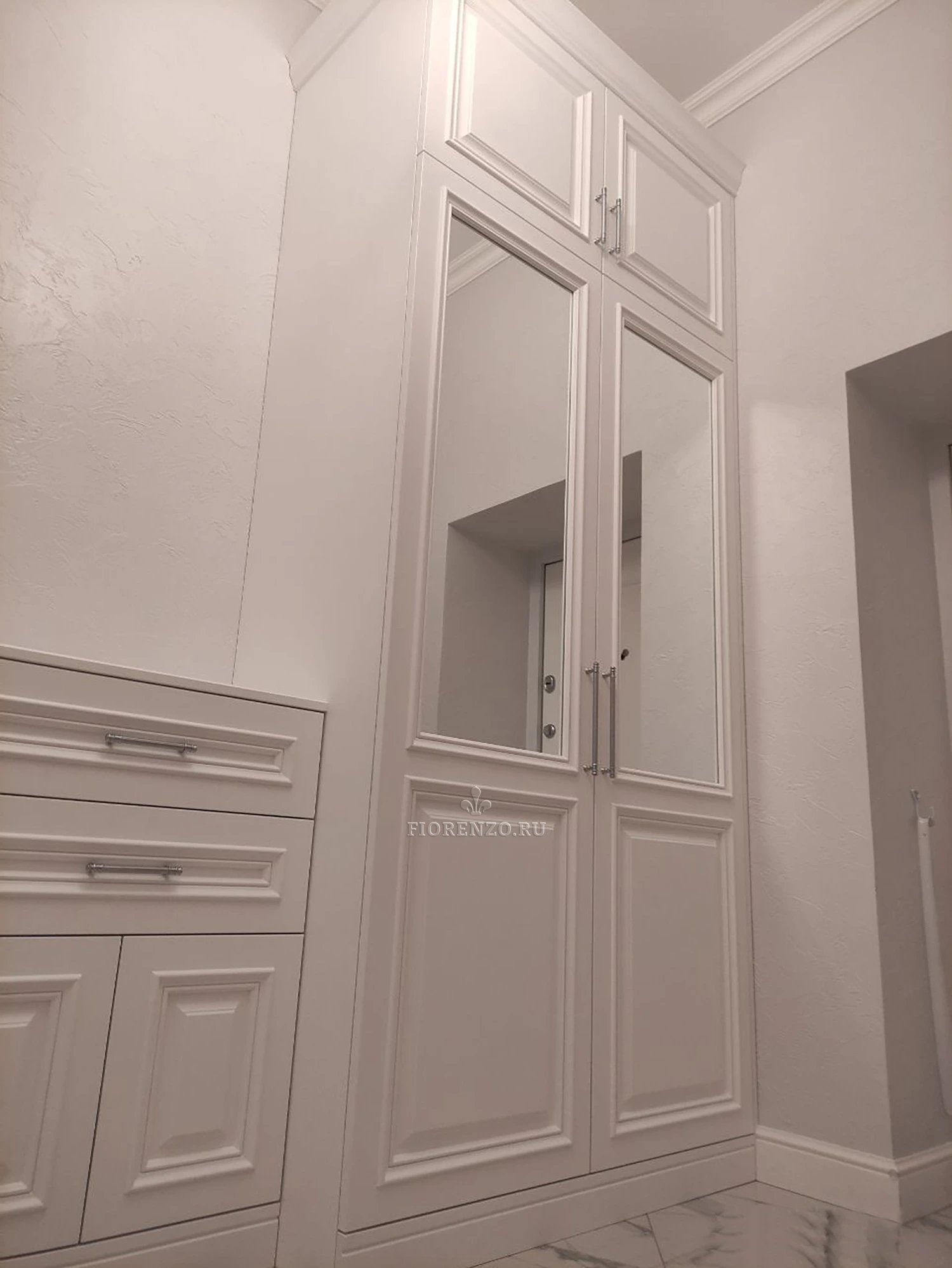 Элегантный распашной шкаф в классическом стиле, выполнен на заказ из крашеного МДФ с зеркальными вставками. Верхняя царга с карнизом и фрезерованными фасадами придают изделию статусный вид.
