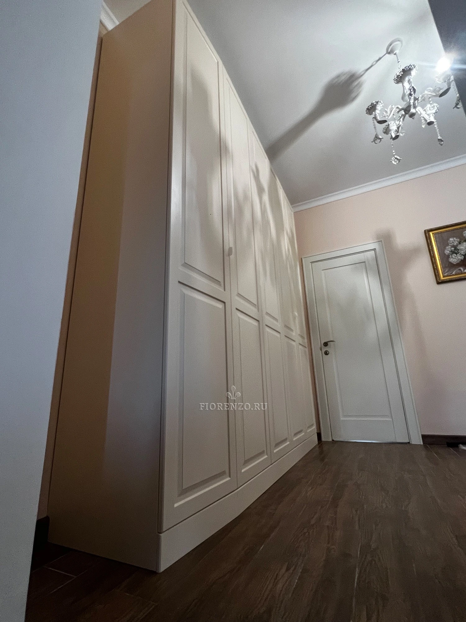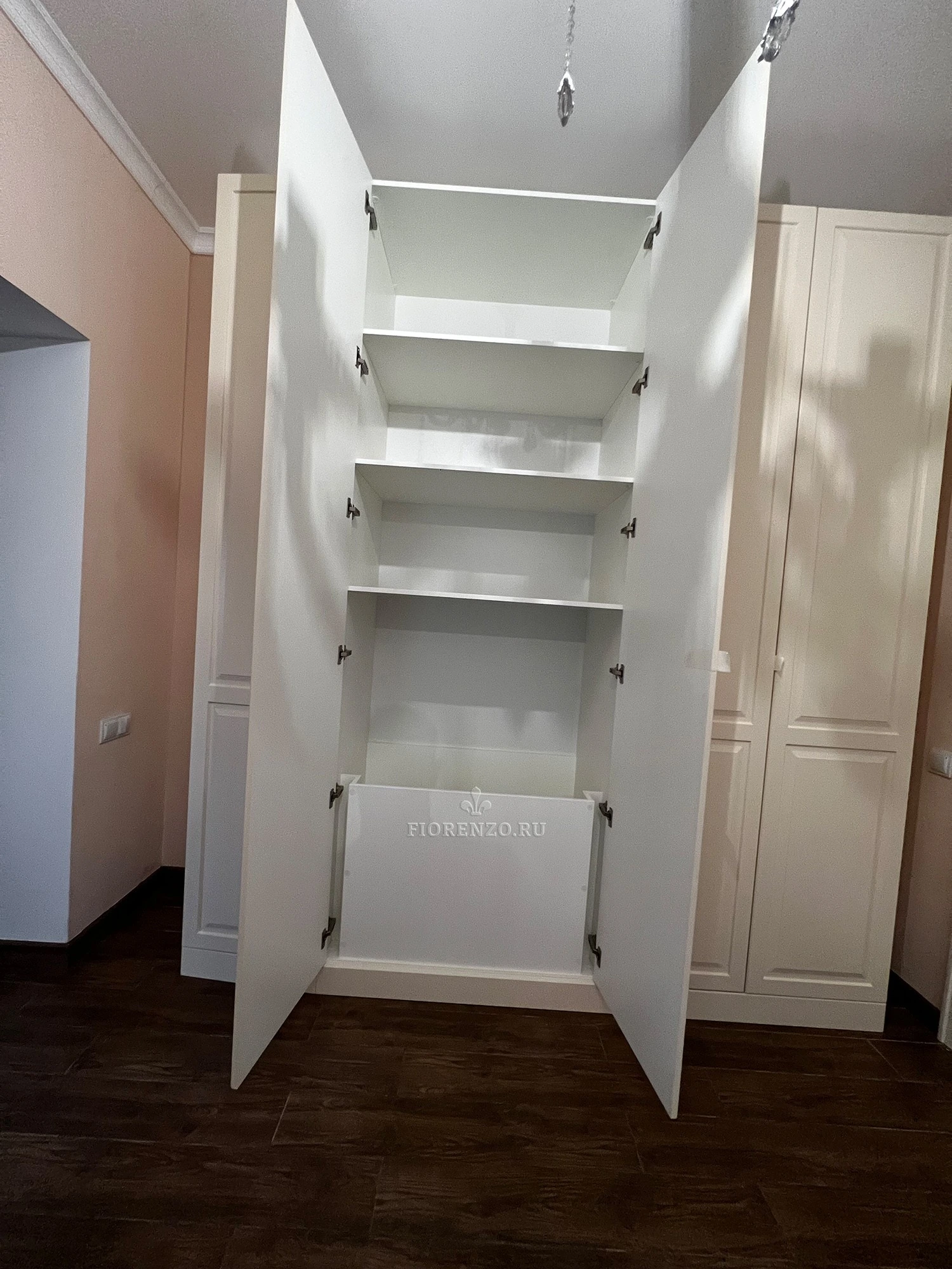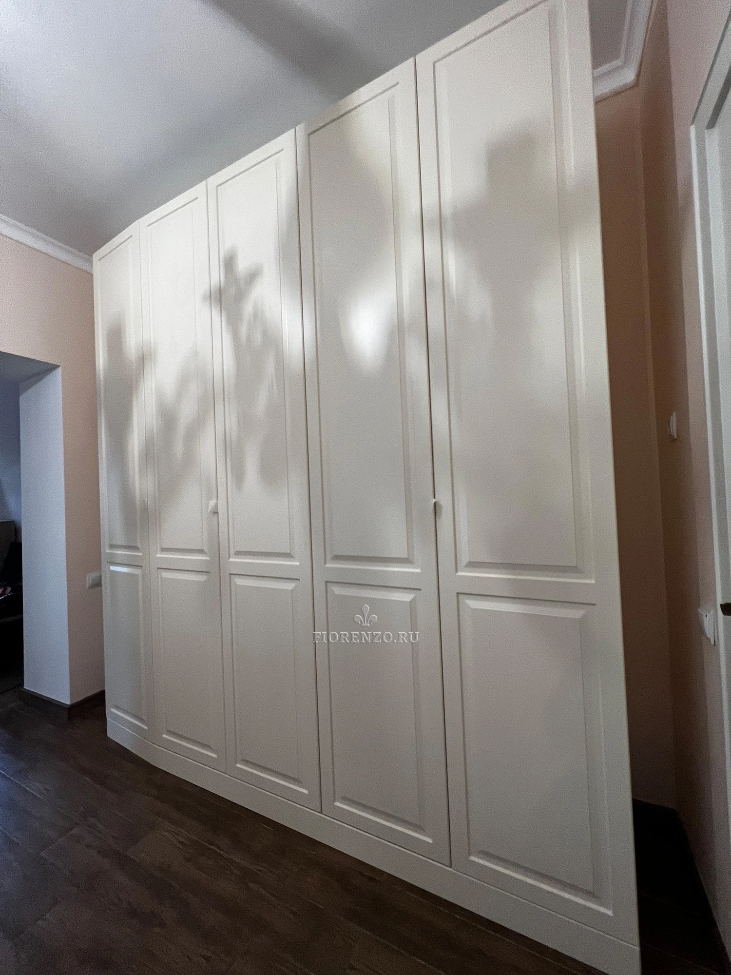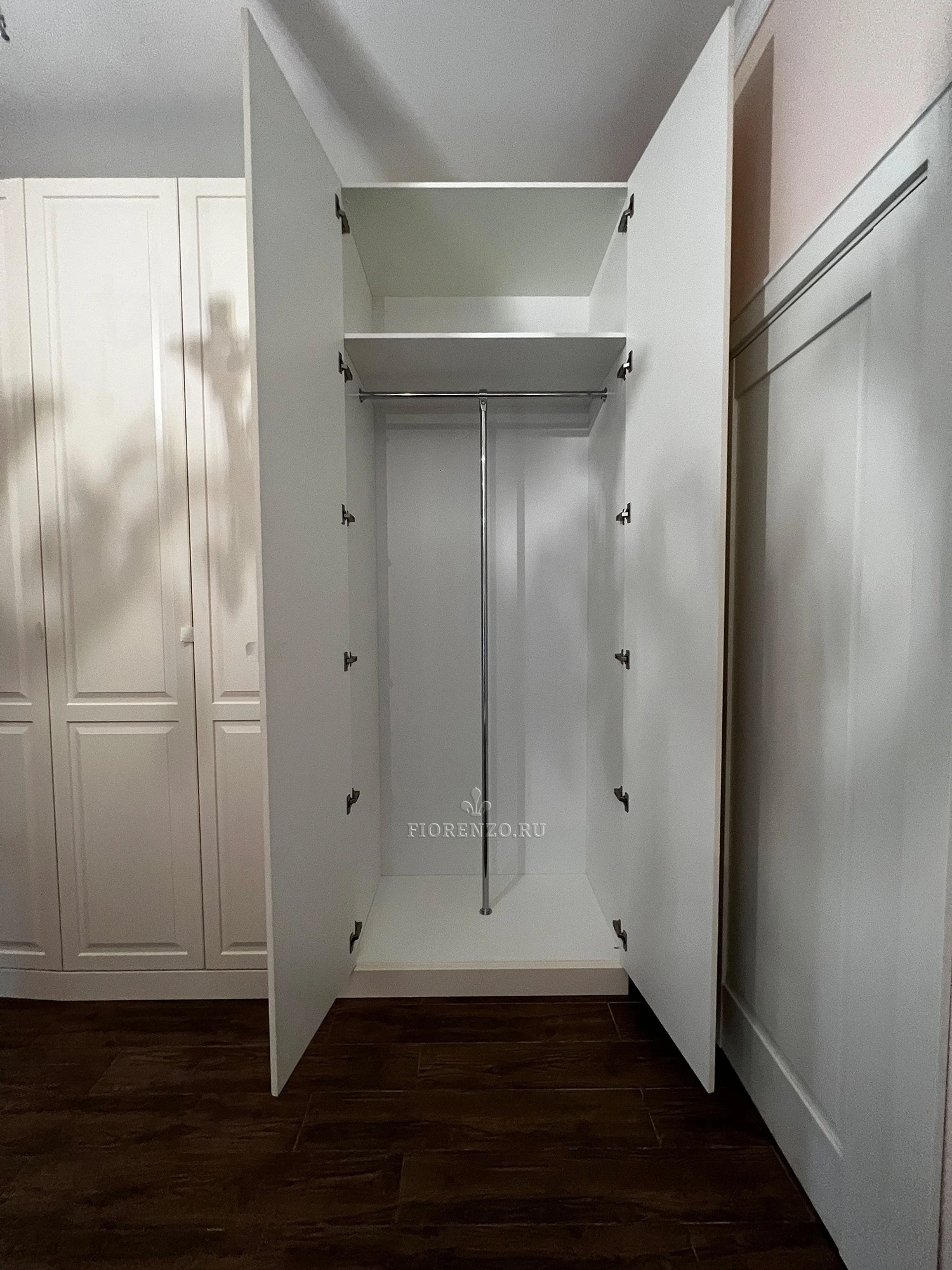 Элегантный распашной шкаф премиум-класса, выполненный в классическом стиле с филенчатыми дверцами. Идеален для хранения одежды и белья в спальне — продуманная внутренняя организация под вешалки, полки и ящики.