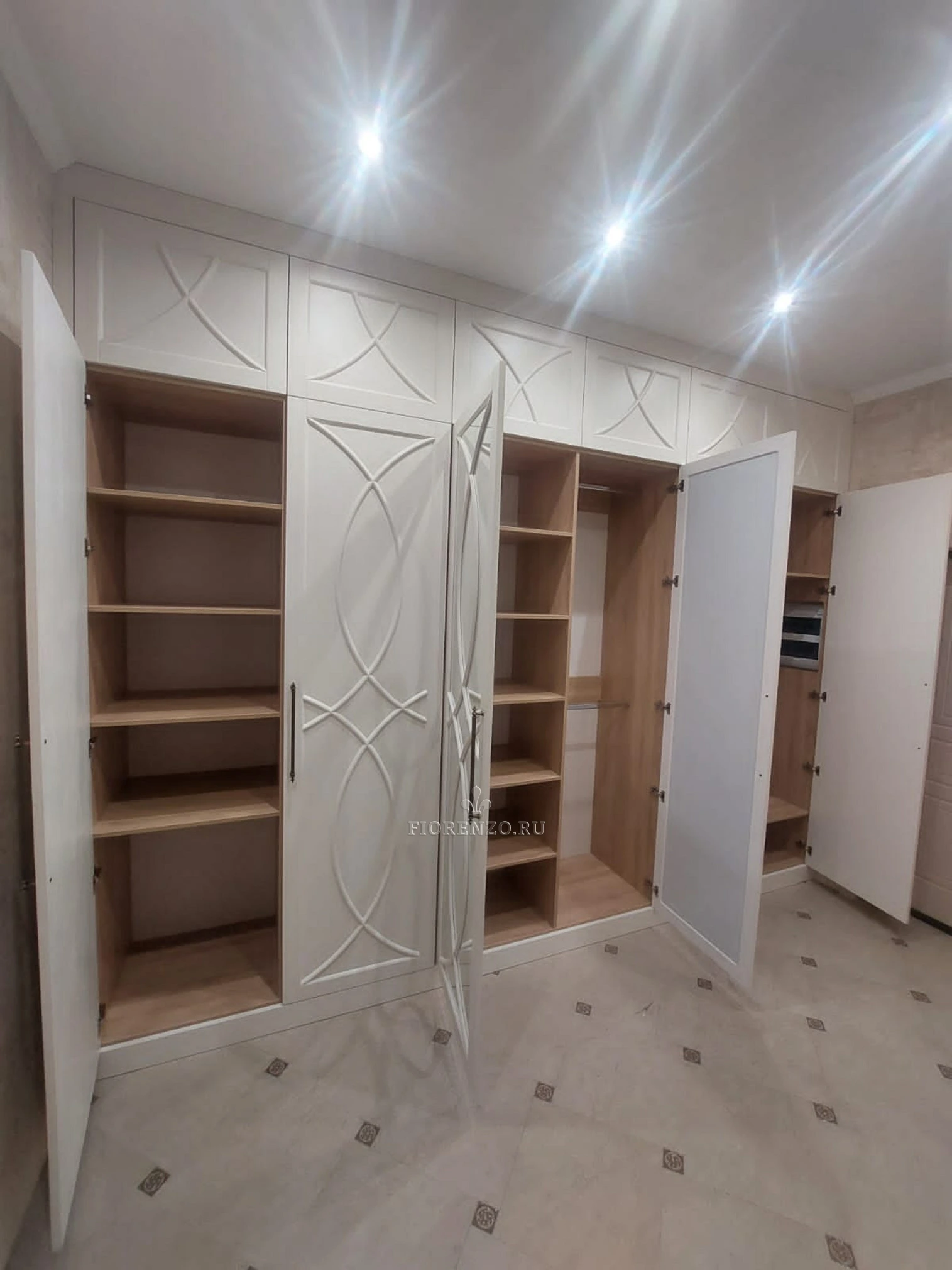 Встроенный распашной шкаф премиум-класса с фрезерованными дверями и антресолями, выполненный в белом матовом лаке и светлой декоративной имитации дуба внутри. Продуманная внутренняя организация: отделения для одежды, полки, ниша для штанги. Подходит для установки до потолка и вплотную к стенам, индивидуальное изготовление по размерам.