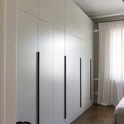 Фасады с филенками изготовлены из крашеного МДФ по палитре RAL. Внутренности – из ЛДСП Egger от австрийской торговой марки. Петли и направляющие от компании Blum с доводчиками и газовыми амортизаторами.