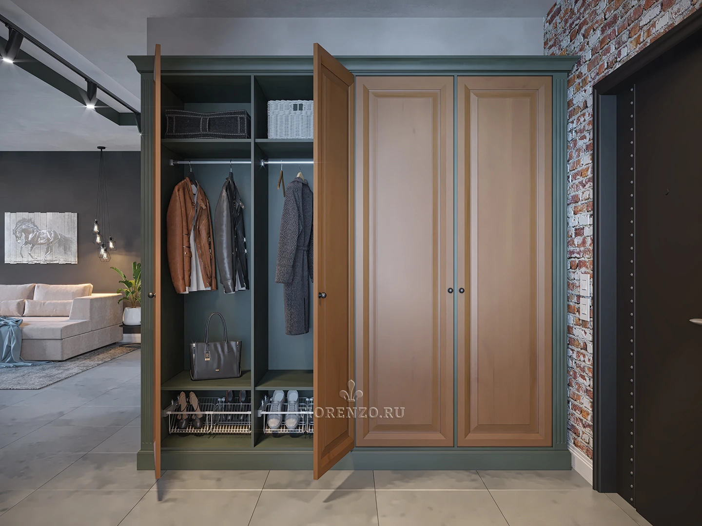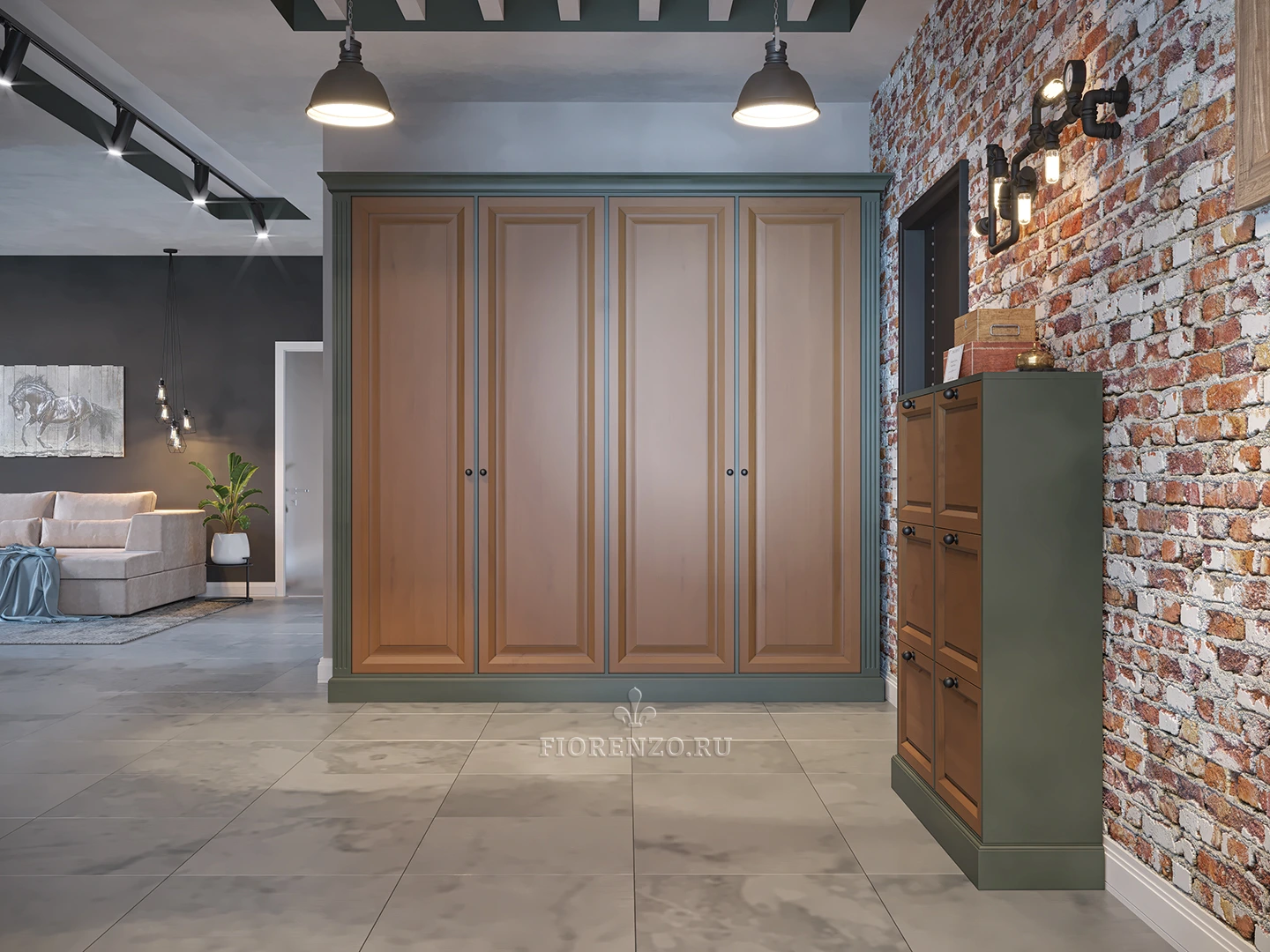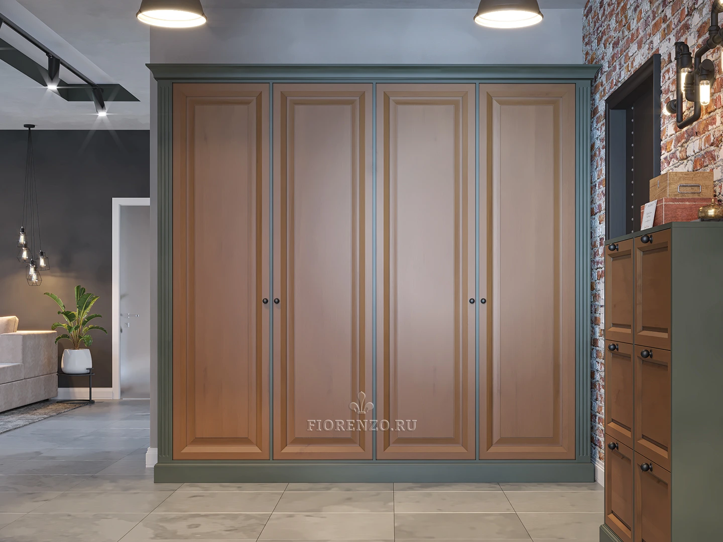 Дизайнеры компании «Фиорензо Мебель» разработали уникальный проект распашного шкафа «Эд» из массива в стиле лофт, особенностью которого является максимальная практичность, использование современных натуральных материалов и расцветок, гармонирующих с оформлением комнаты. Мебель под заказ установлена на входе в прихожую, которая представляет собой единое пространство с жилыми помещениями квартиры. В нашей компании вы можете заказать подобное изделие, которое разработают с учетом ваших требований и стилевых предпочтений.